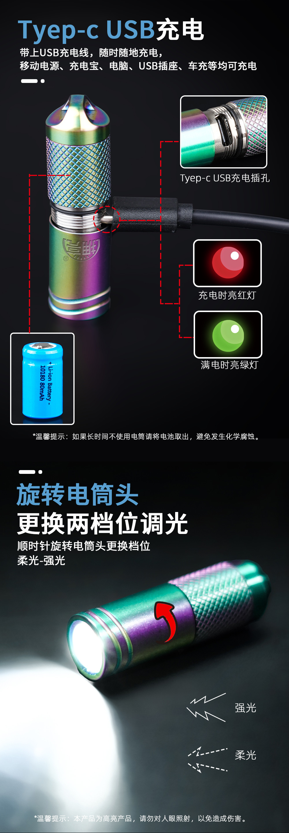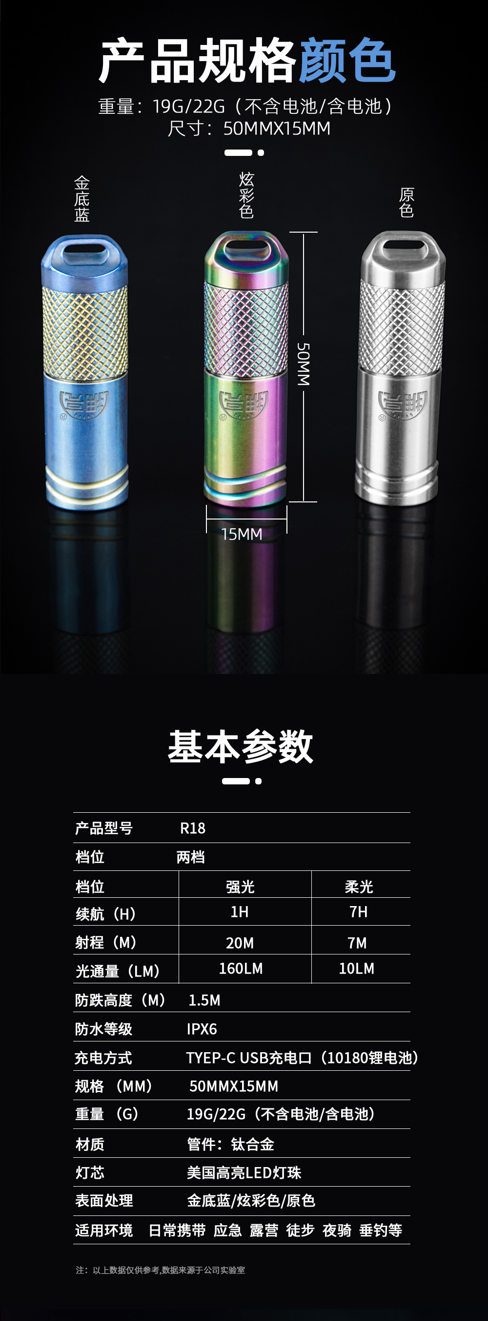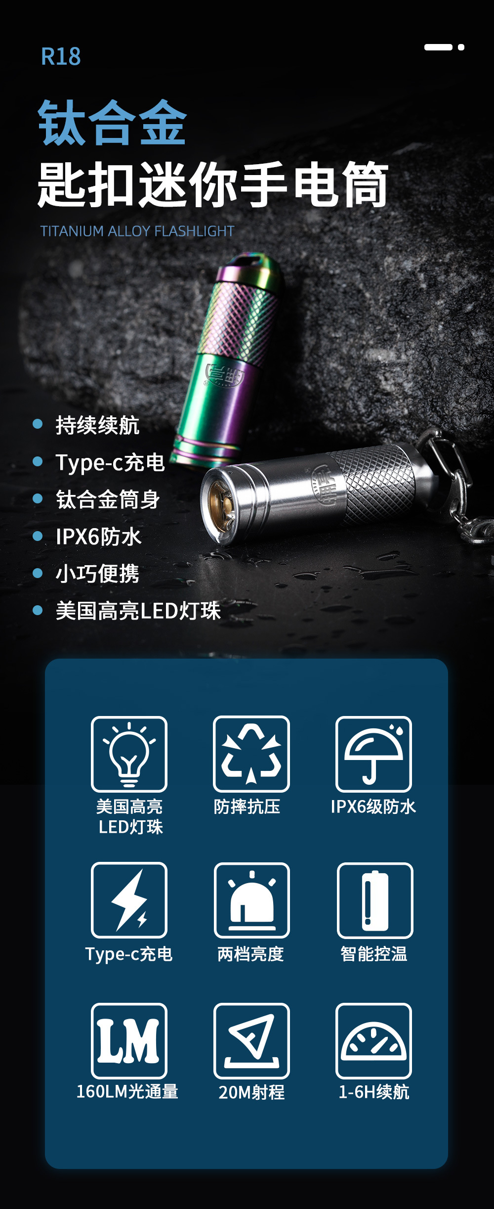 EDC 티타늄 합금 유형-C 충전 야외 조명 작은 램프 R18 미니 휴대용 키 체인 LED 손전등 도매