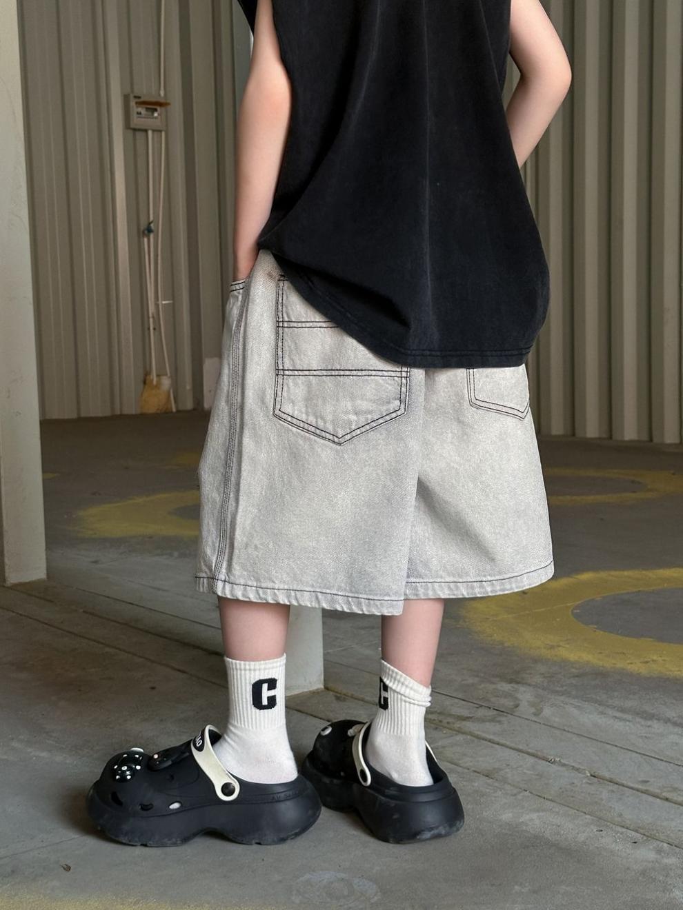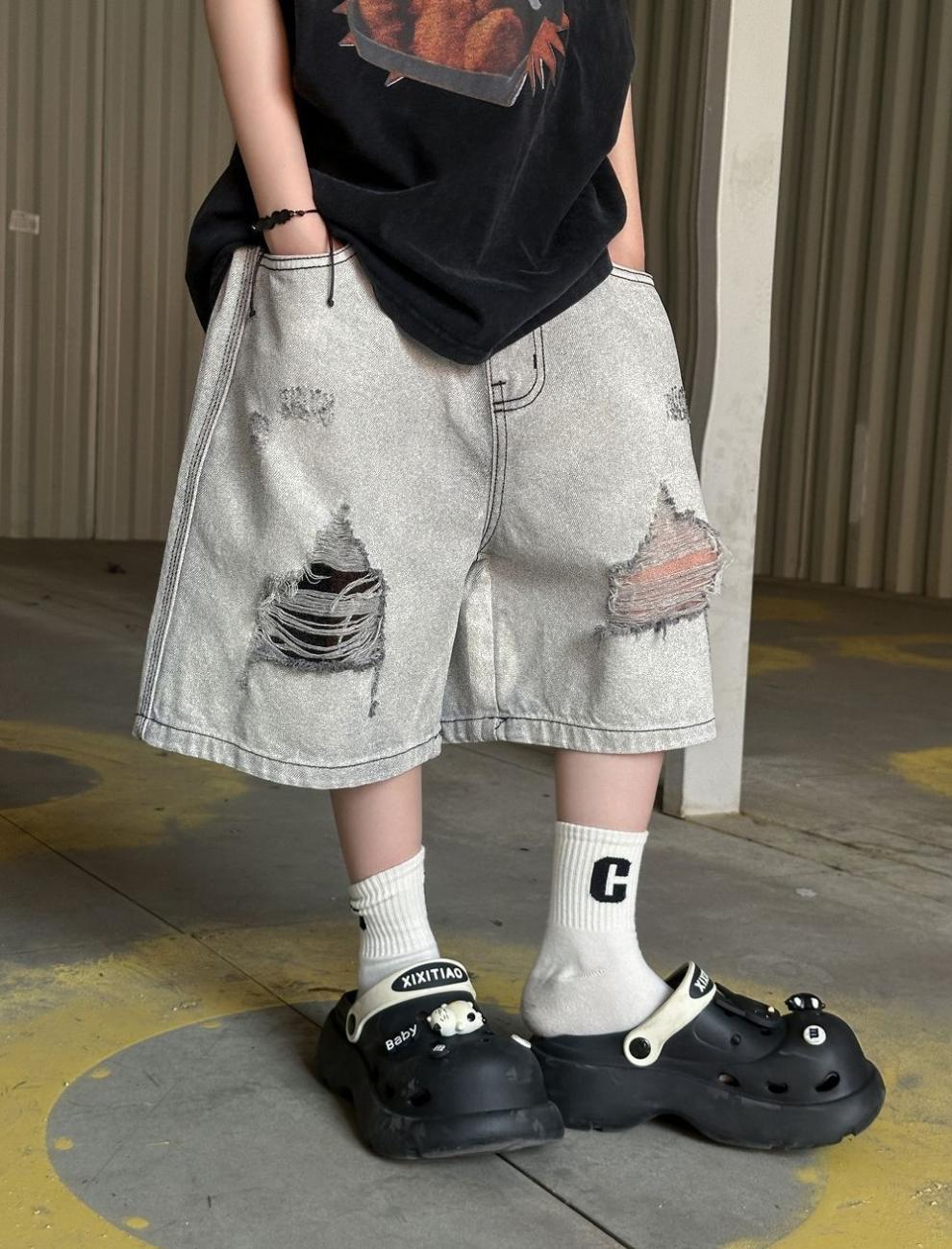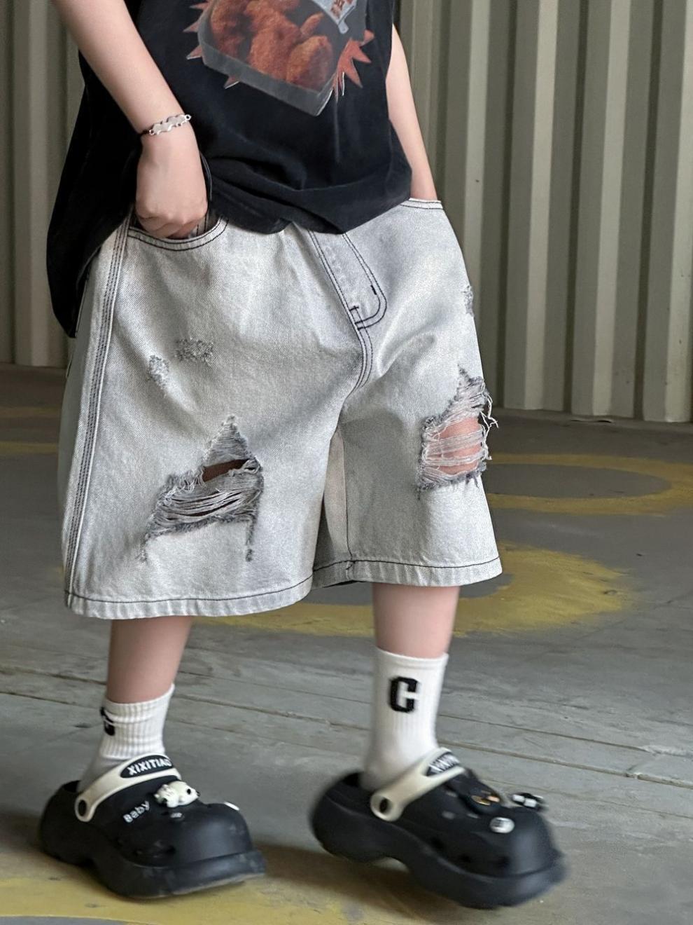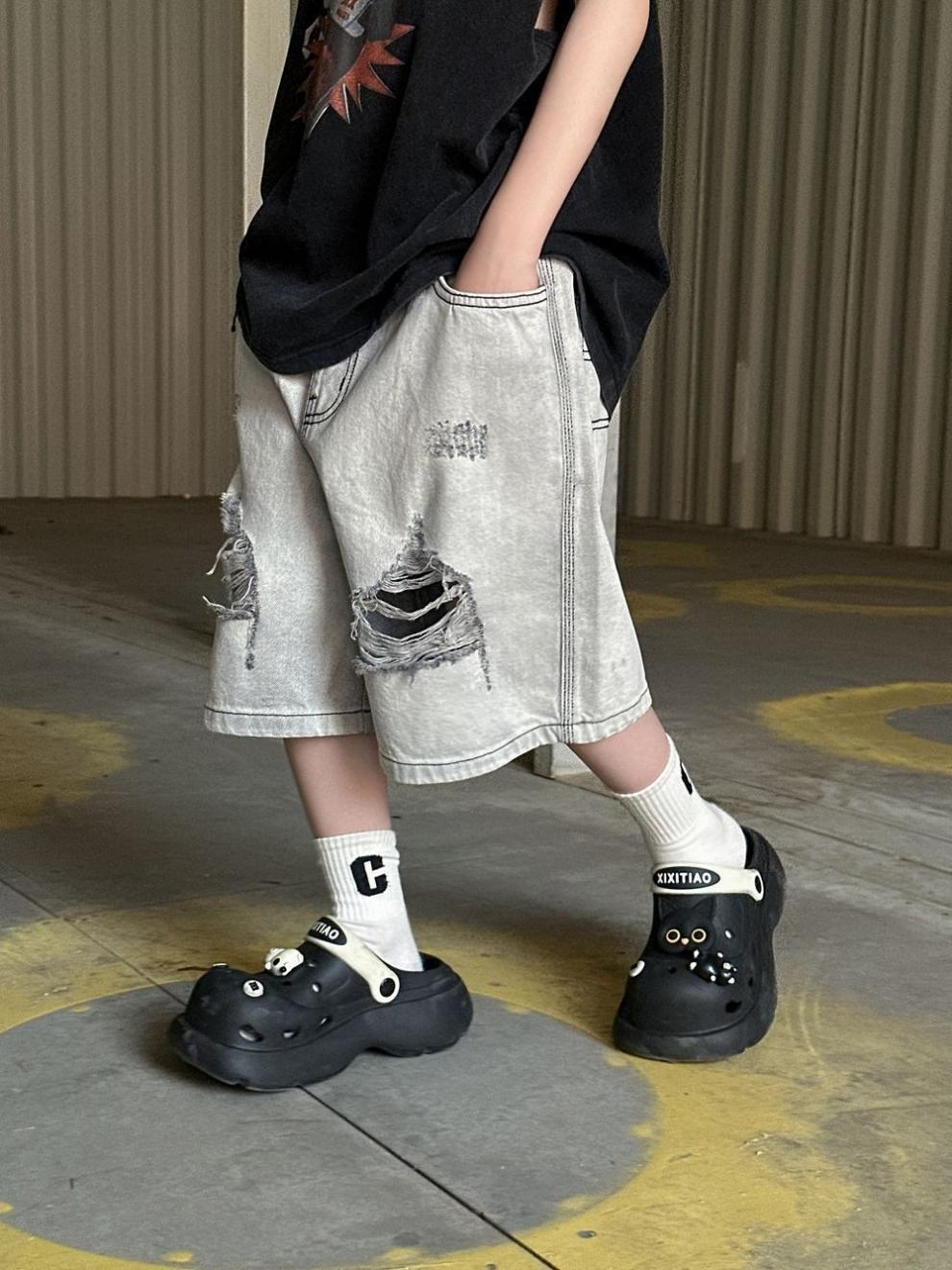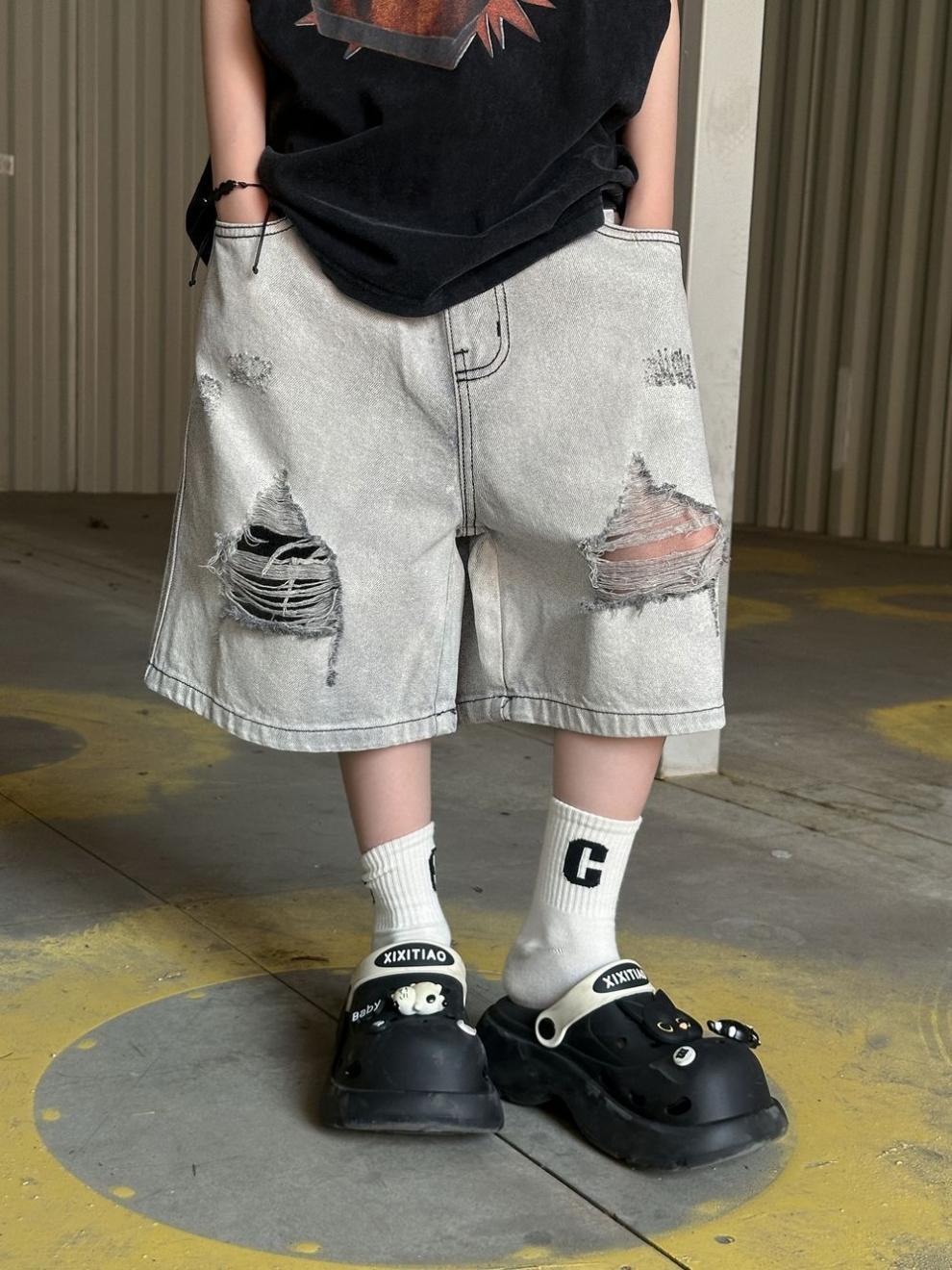 소년 반바지 2025 여름 새로운 어린이 찢어진 데님 반바지 데님 중간 바지 소년 5스토어 가기