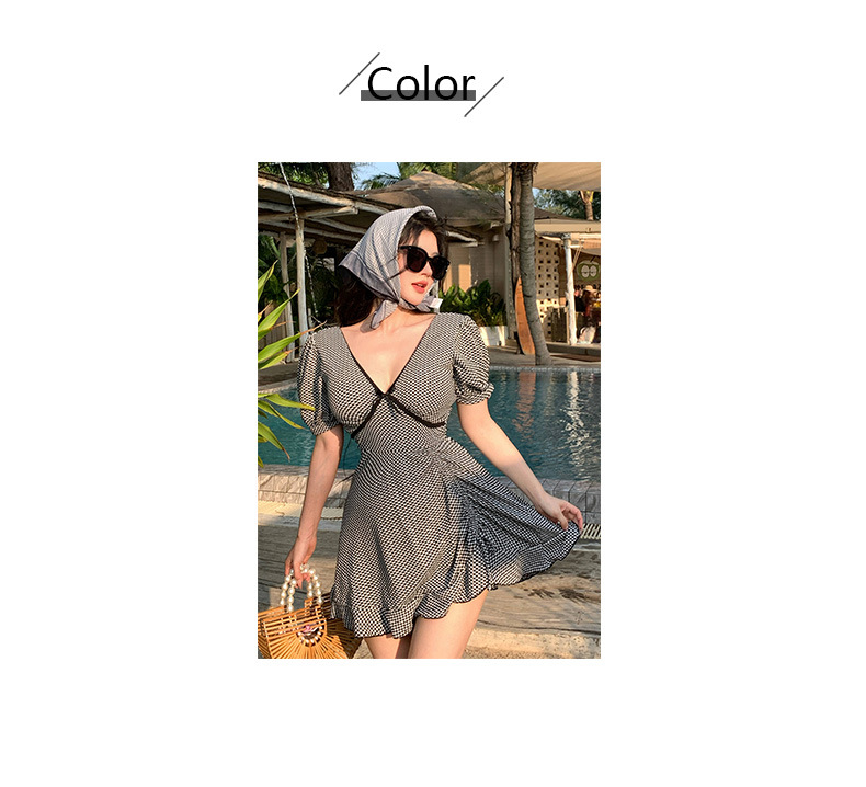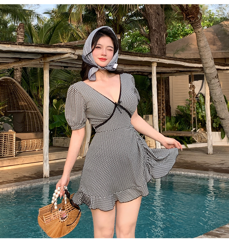 아름다운 프렌치 체크무늬 수영복, 여성스러운 브이넥 원피스 스커트 스타일, 보수적인 플러스 사이즈 살짝 뚱뚱한 mm 100kg 슬리밍 및 살 커버스토어 가기