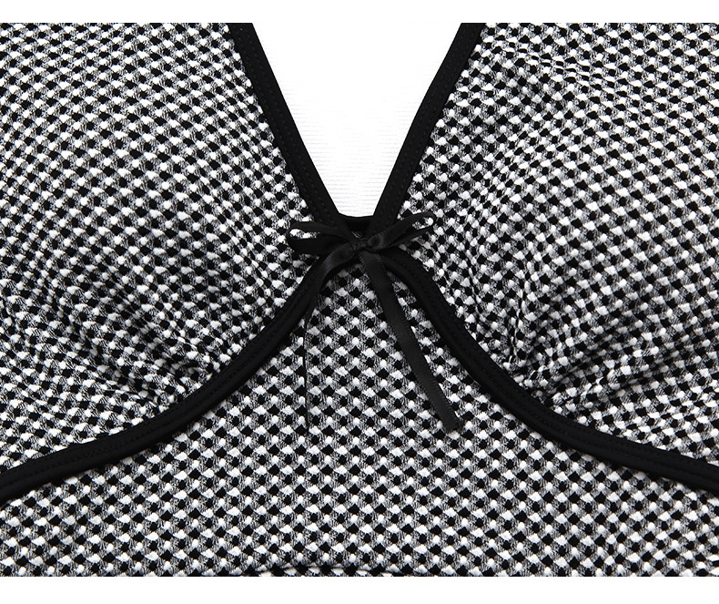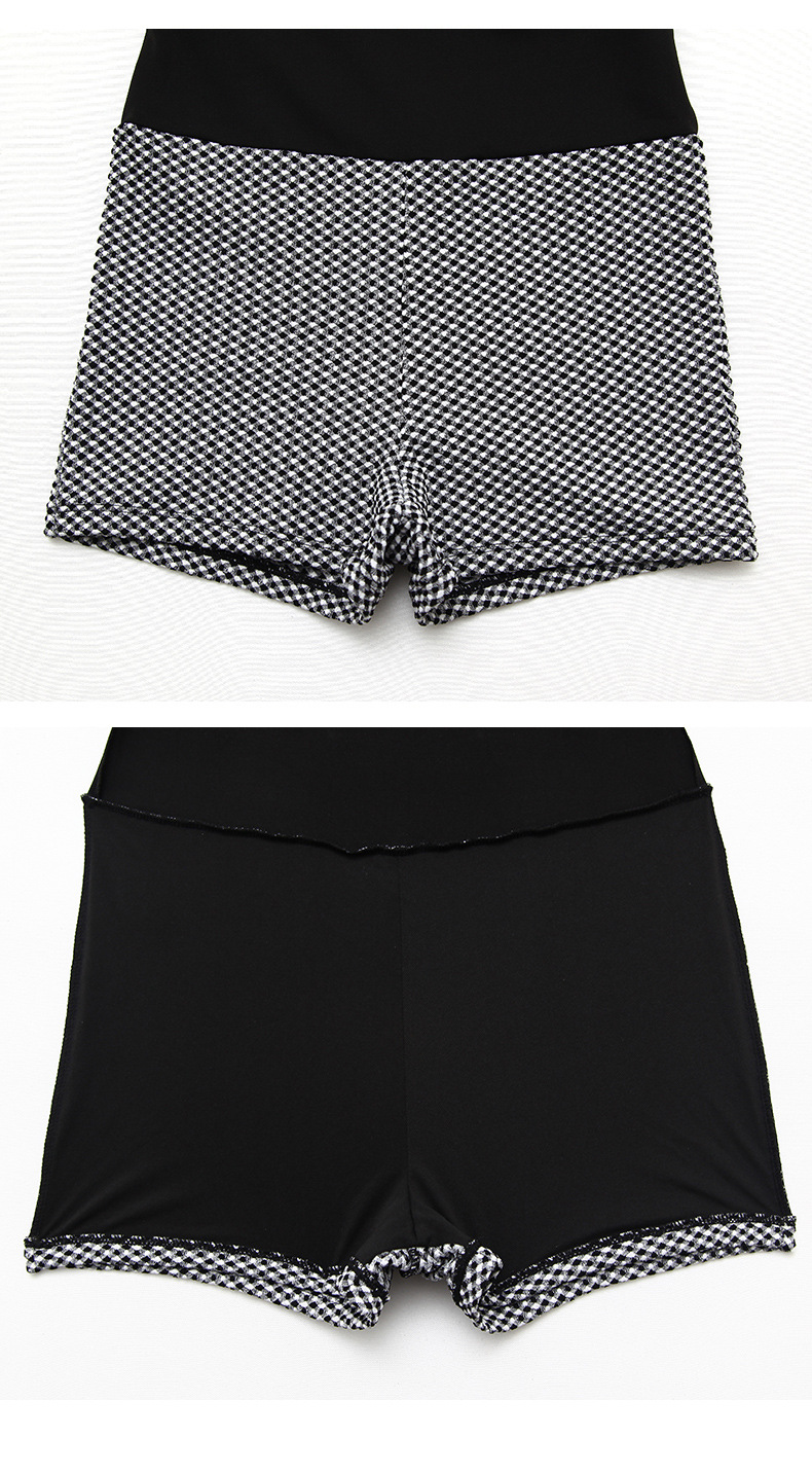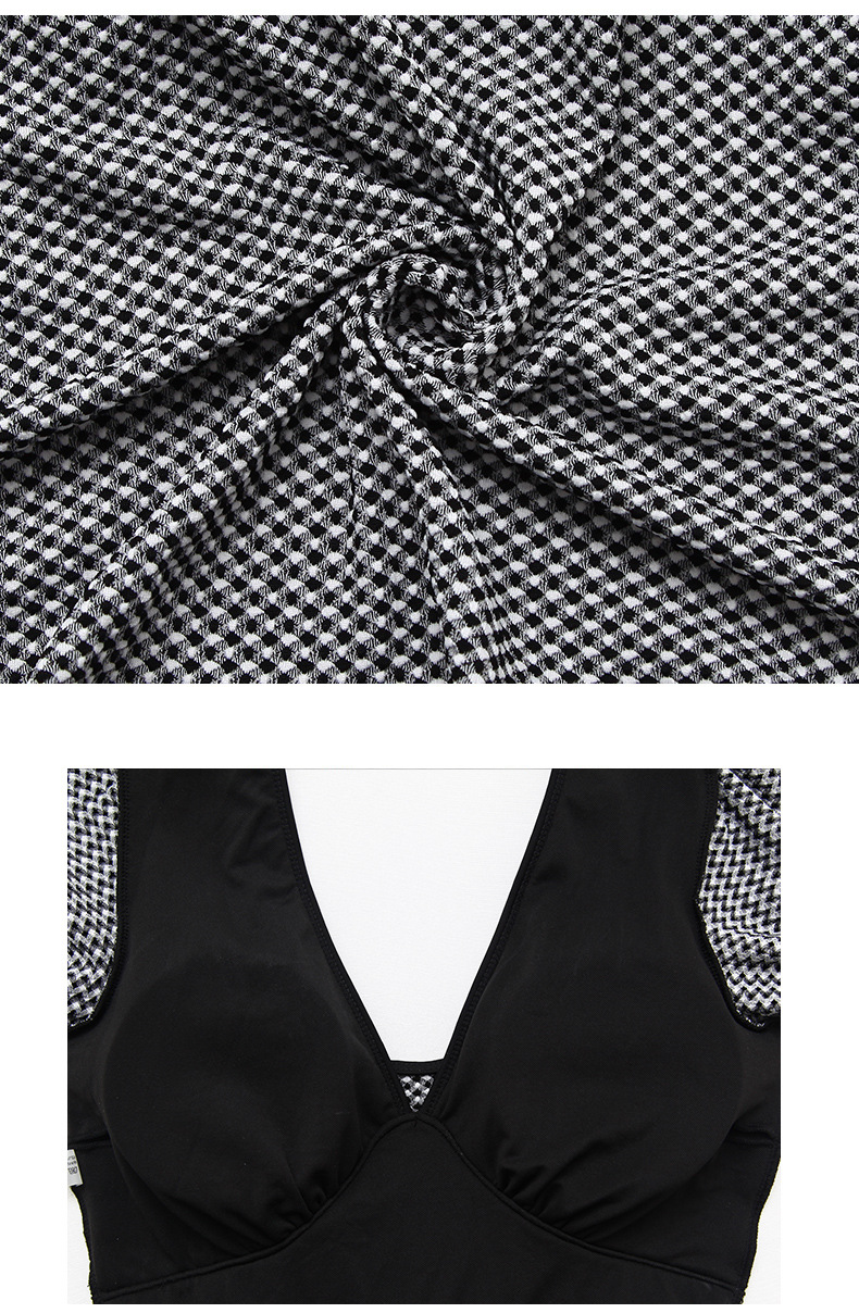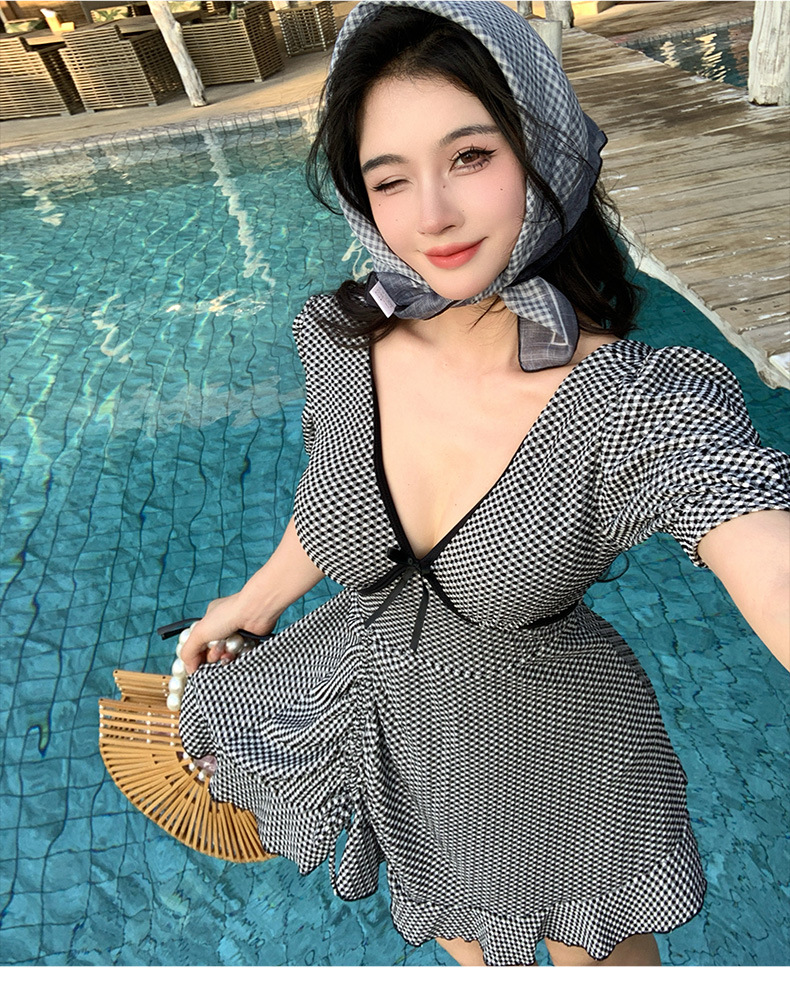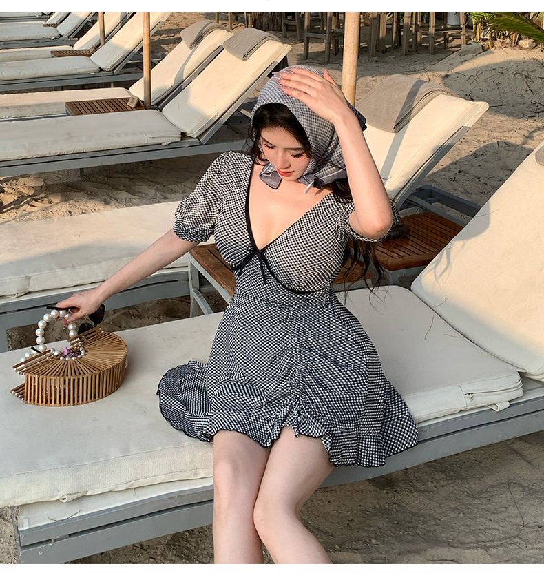 아름다운 프렌치 체크무늬 수영복, 여성스러운 브이넥 원피스 스커트 스타일, 보수적인 플러스 사이즈 살짝 뚱뚱한 mm 100kg 슬리밍 및 살 커버