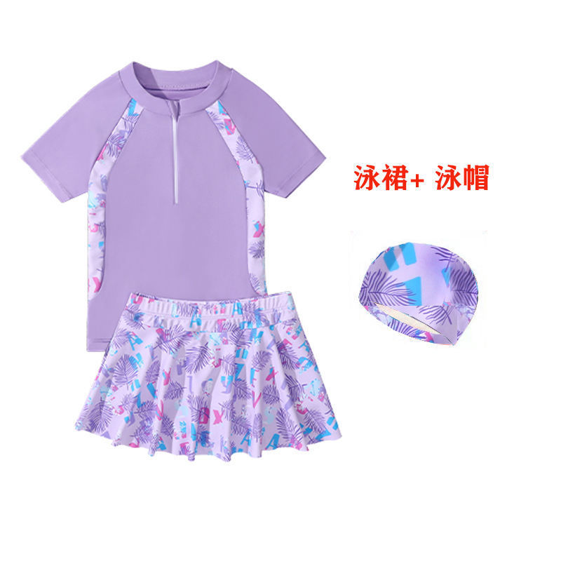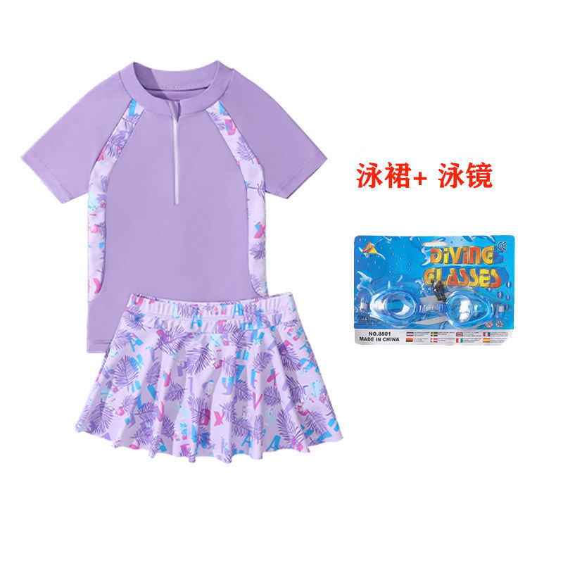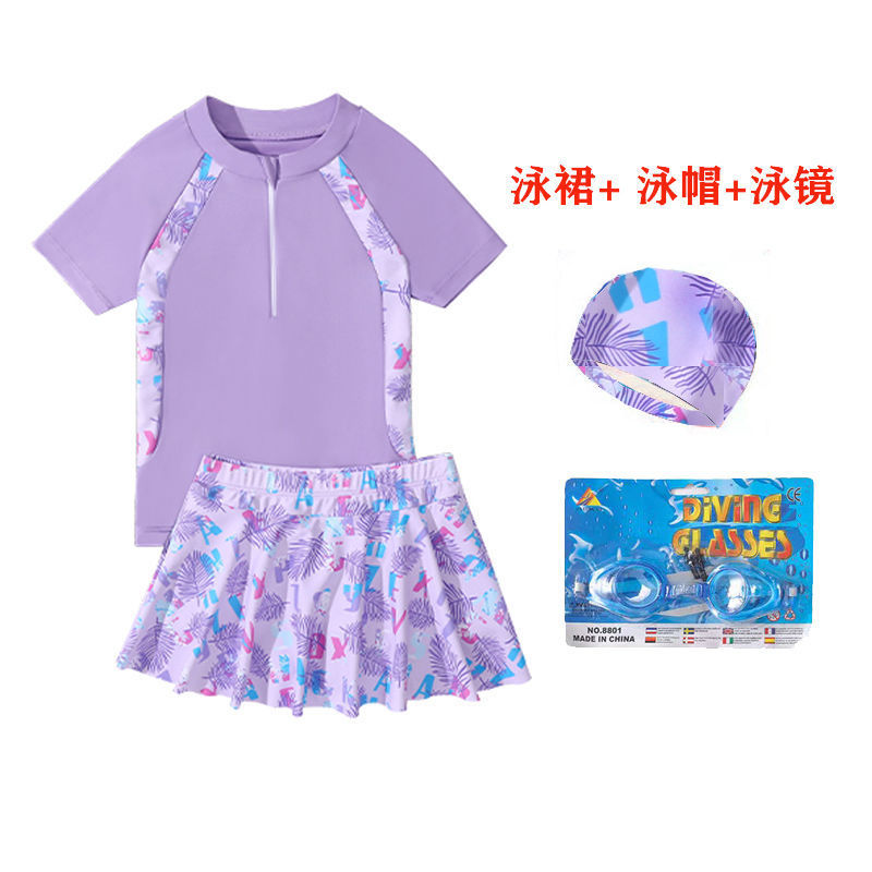 • 작은 꽃무늬 수영 스커트 보라색 + 수영 모자 + 수영 고글