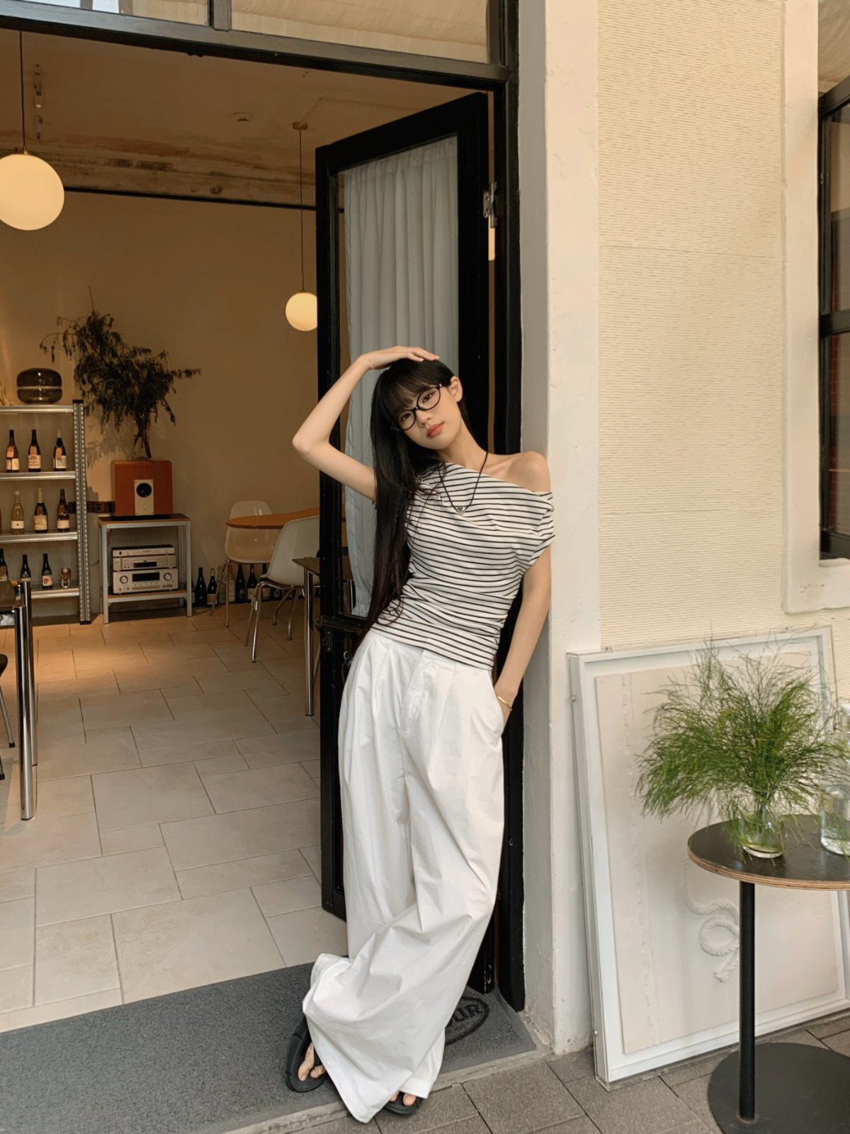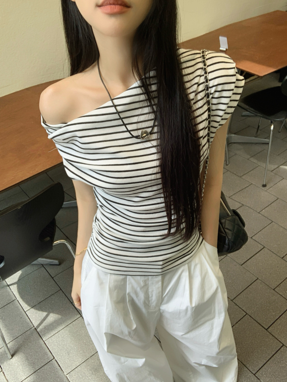 여름 여성을 위한 스트라이프 오프숄더 사선넥 반팔 티셔츠, 새로운 핫스타일, 핫걸, 순수한 섹시 스타일, 슬림하고 우아한 상의스토어 가기