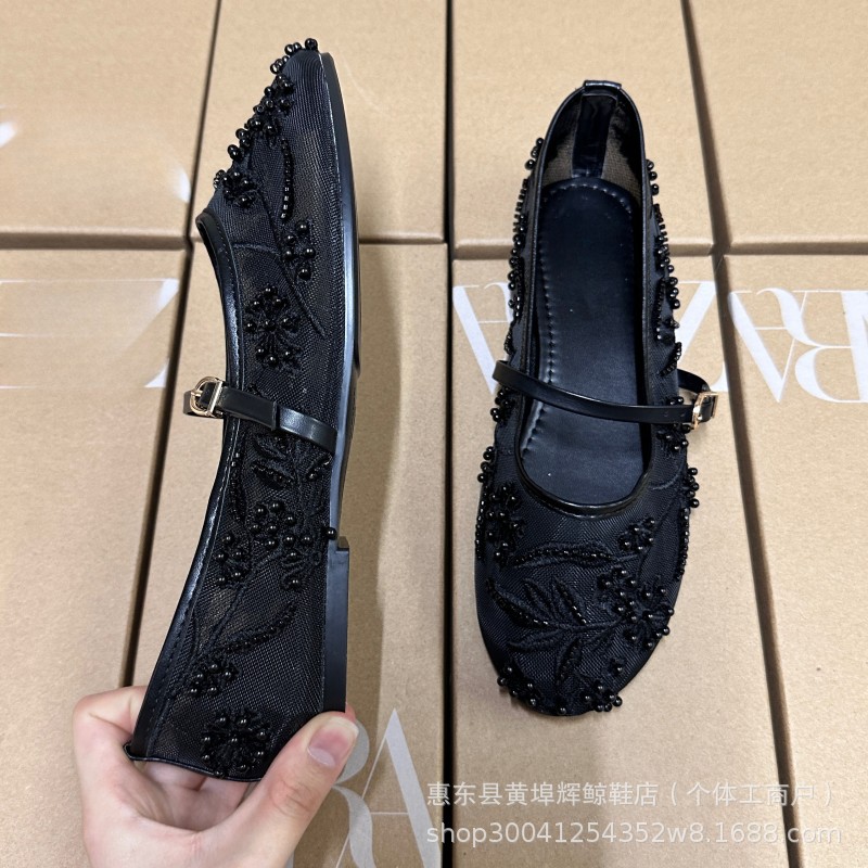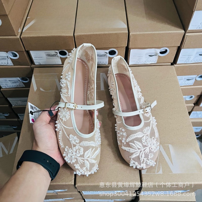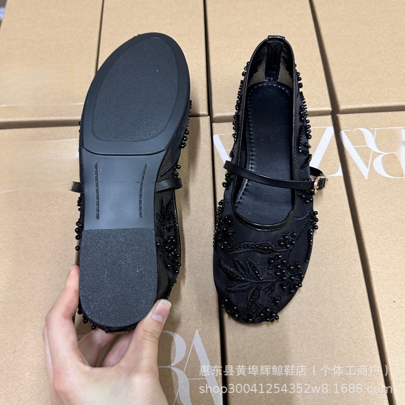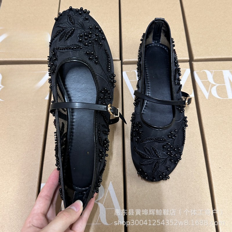 ZA 새로운 흰색 자수 진주 메쉬 플랫 슈즈 라운드 발가락 발레리나 여성 메리 제인 여성 신발스토어 가기