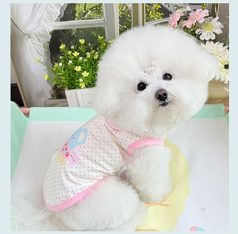 봄과 여름 애완 동물 옷, 귀여운 만화 개 조끼, 프린트, 세련된 마카롱 컬러 서스펜더, 비숑 프리제 포메라니안 옷스토어 가기