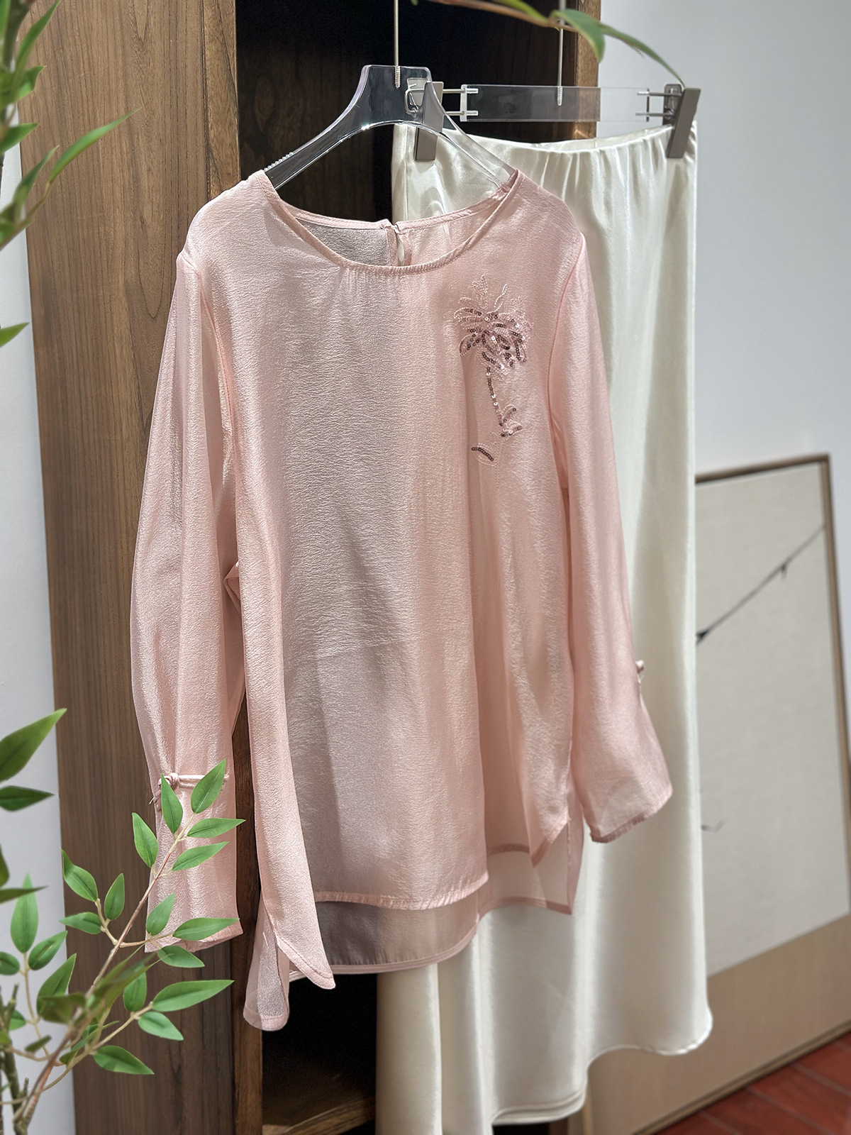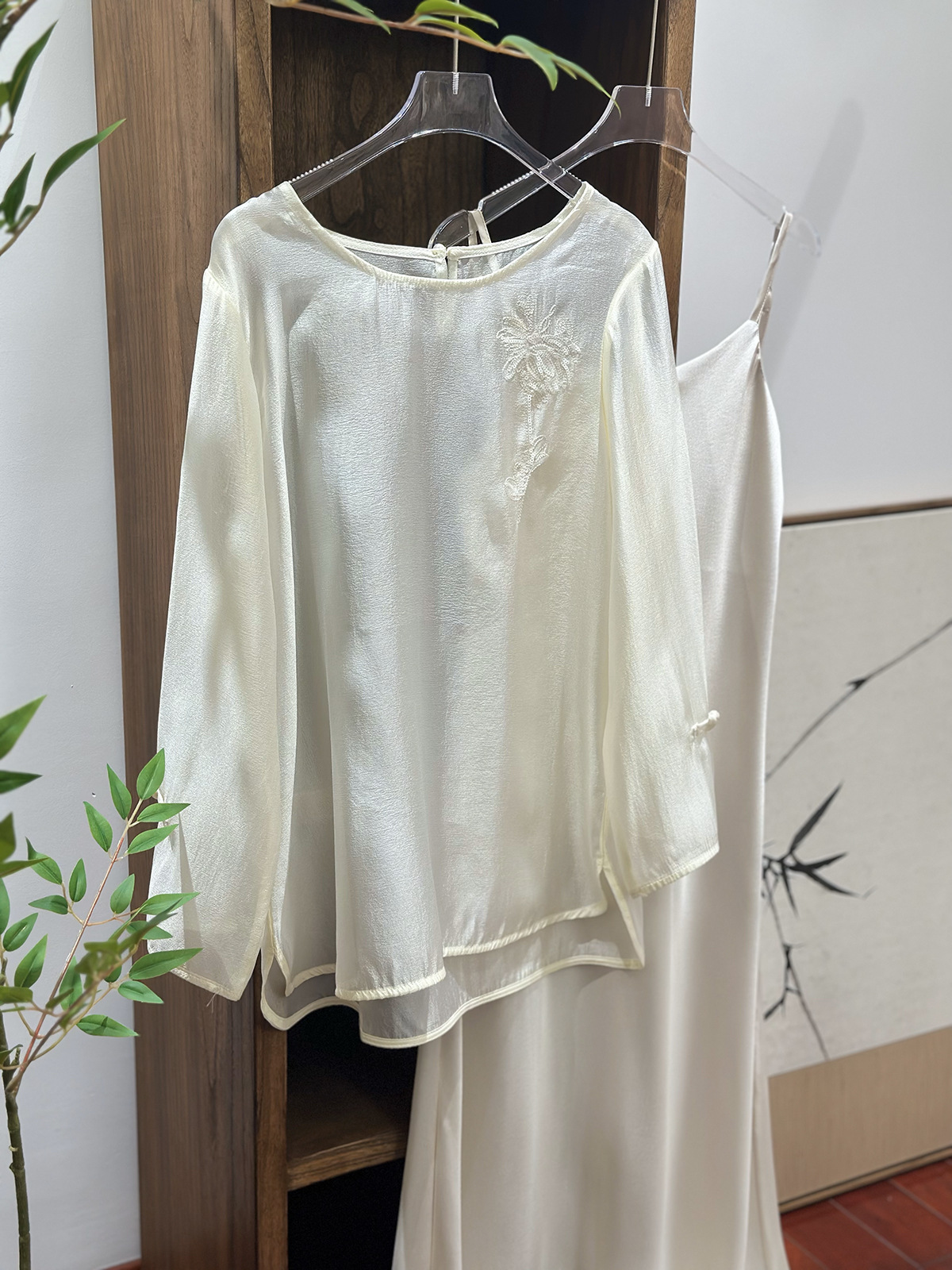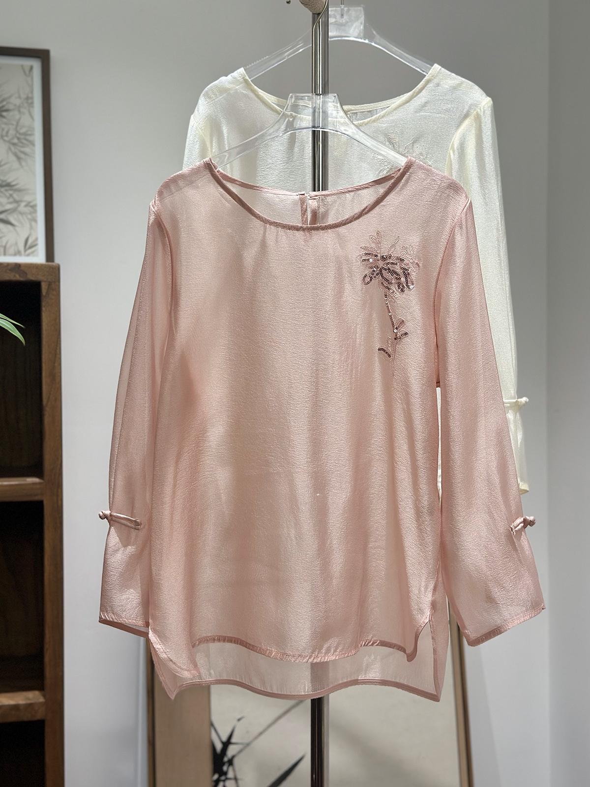 흰색 고급 진주 빛 텐셀 긴팔 셔츠 여성용 여름 메쉬 얇은 둥근 목 새로운 중국 스타일 팬 입 자수 커버스토어 가기