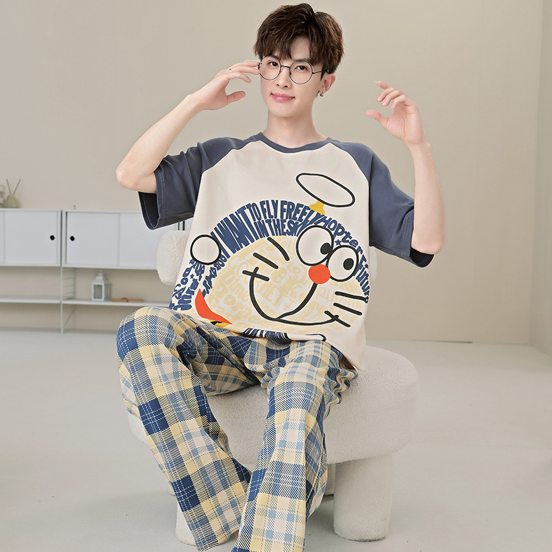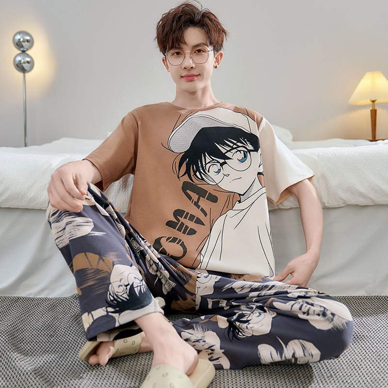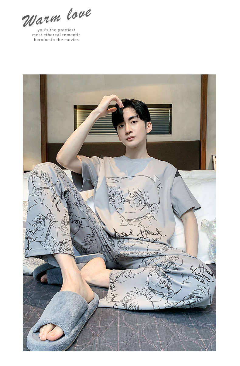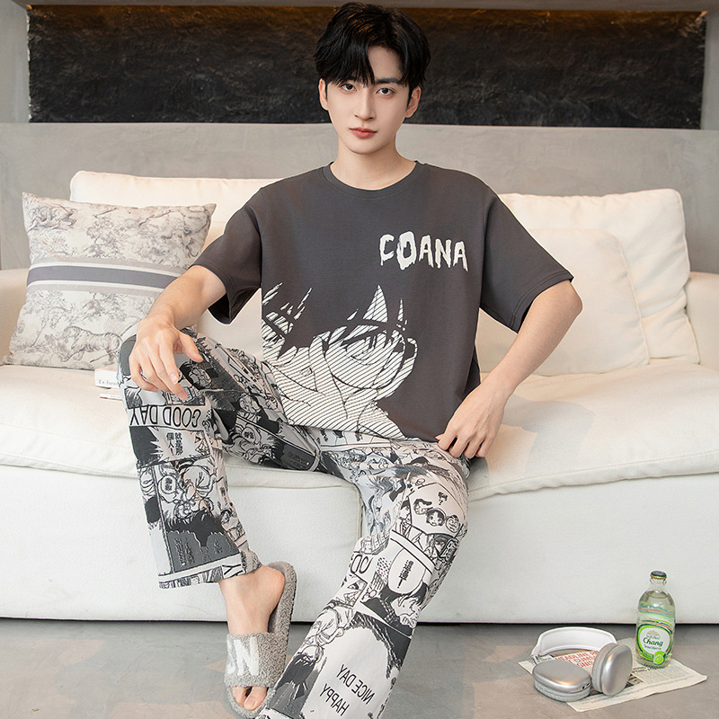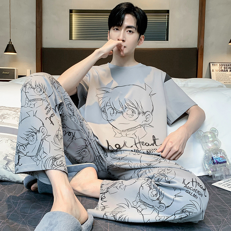 남성용 잠옷 2025 새로운 여름 순수 코튼 반팔 바지 얇은 가을 대형 만화 홈웨어 세트