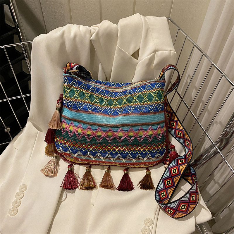 높은 가치의 민족 스타일 크로스 바디 백 여성의 새로운 패션 올 매치 와이드 숄더스트랩 숄더백 술 버킷 백 여성 도매스토어 가기