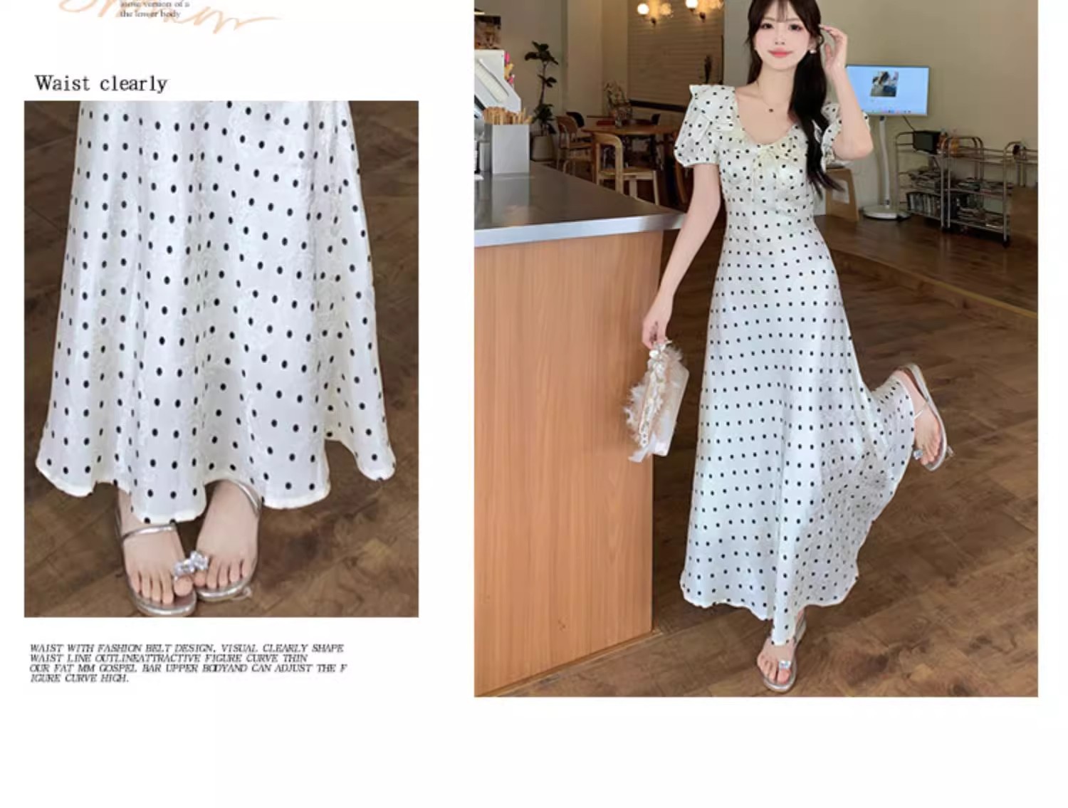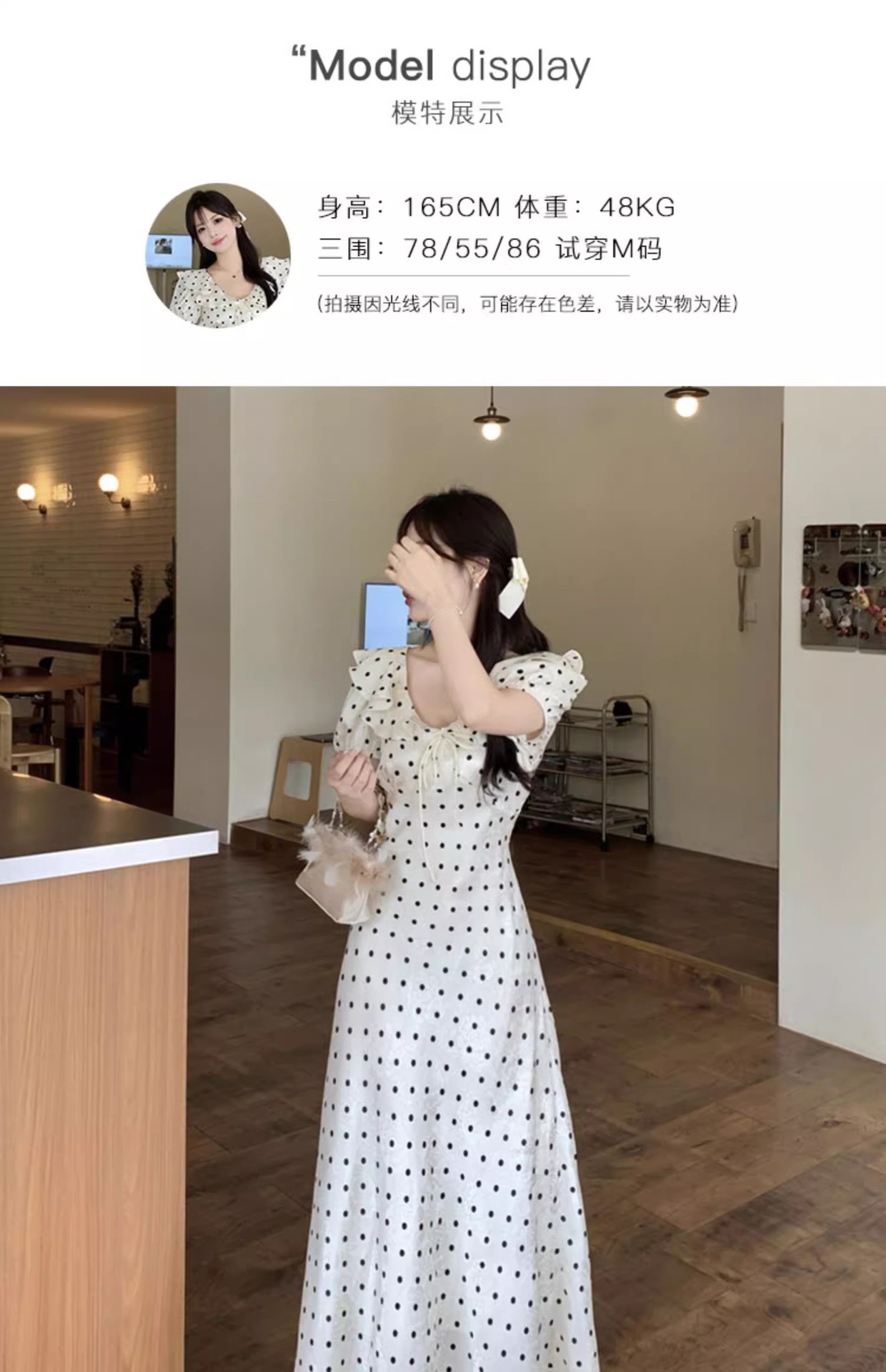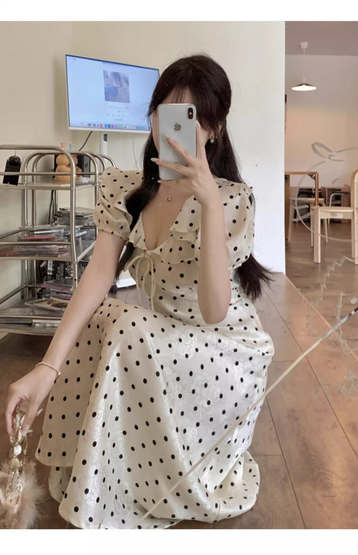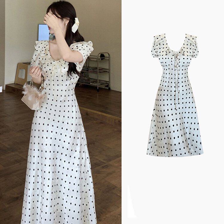 프랑스 스타일 웨이브 도트 퍼프 슬리브 원피스 여성 여름 해변 휴가 부드러운 스타일 웨이스트 우아한 독특한 아름다운 작은 원피스