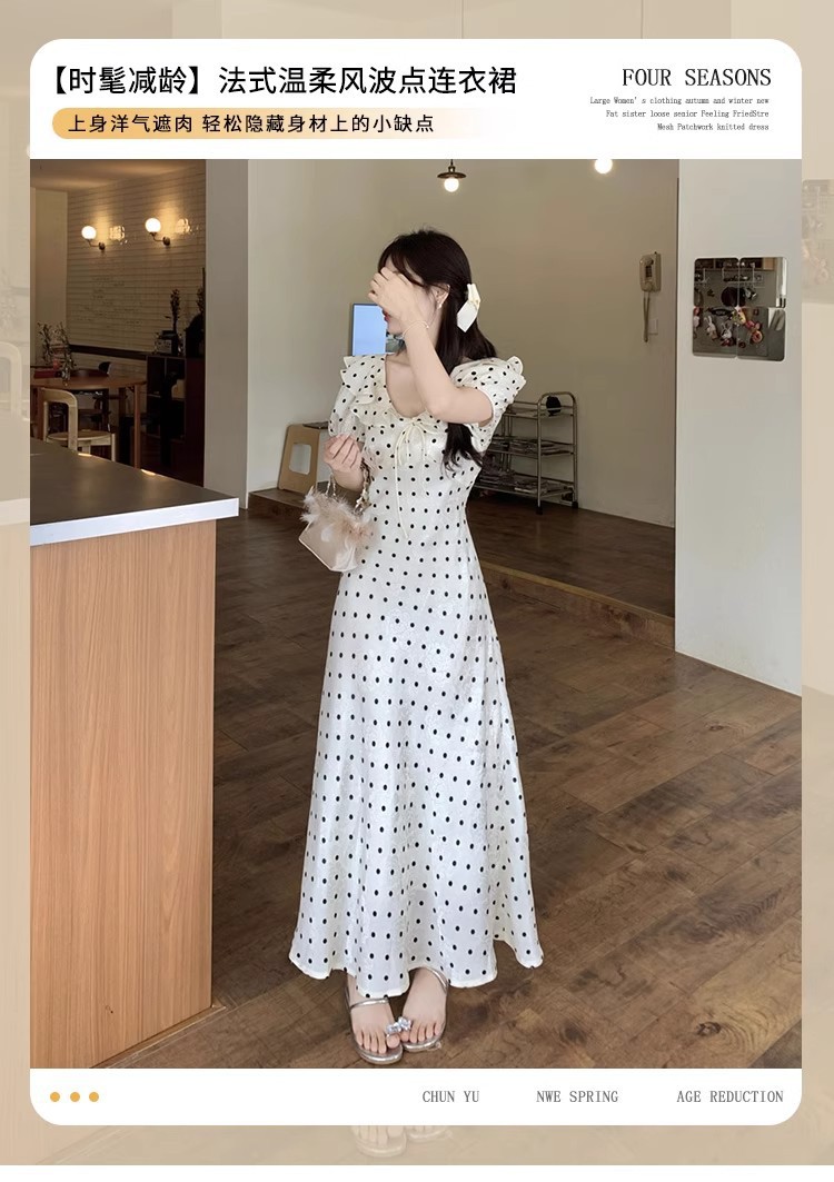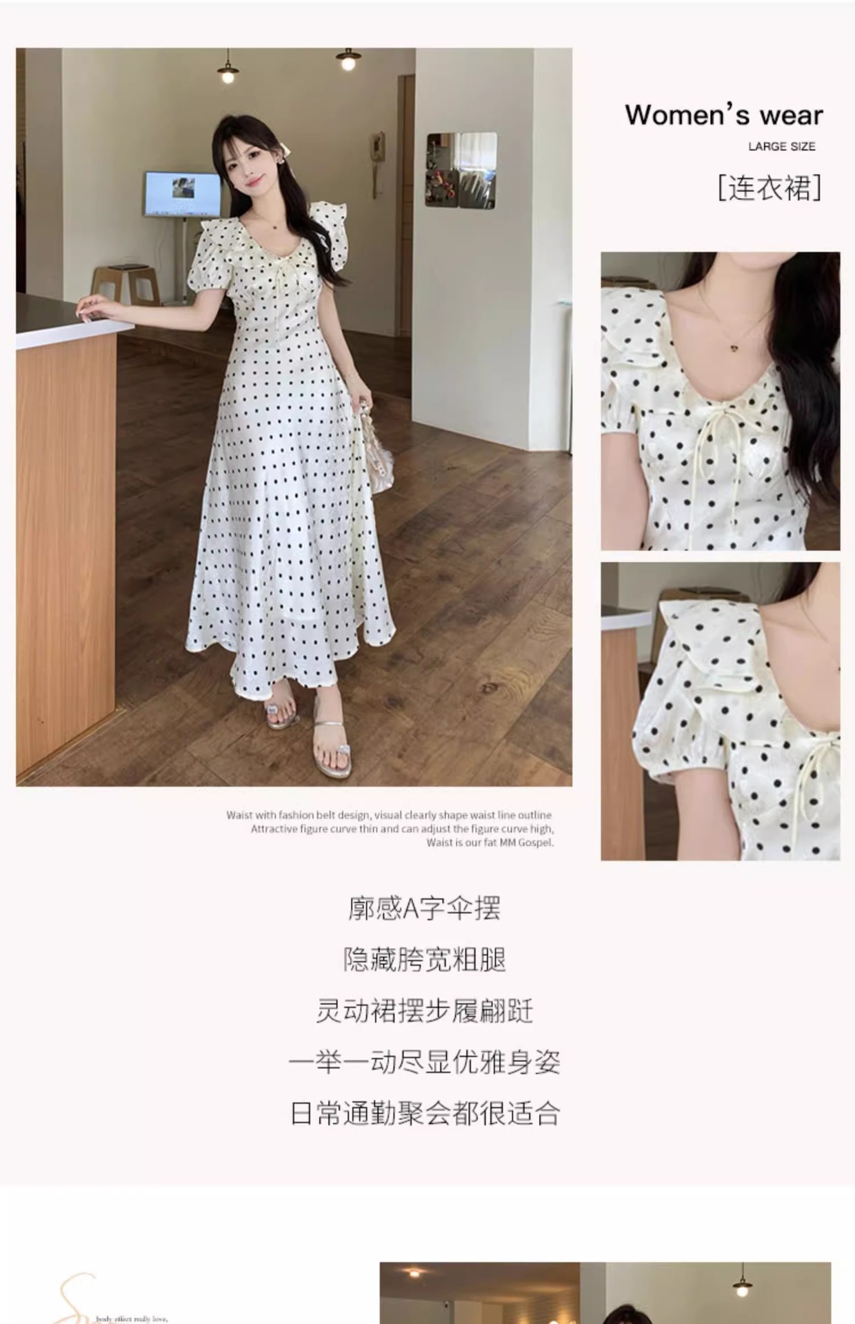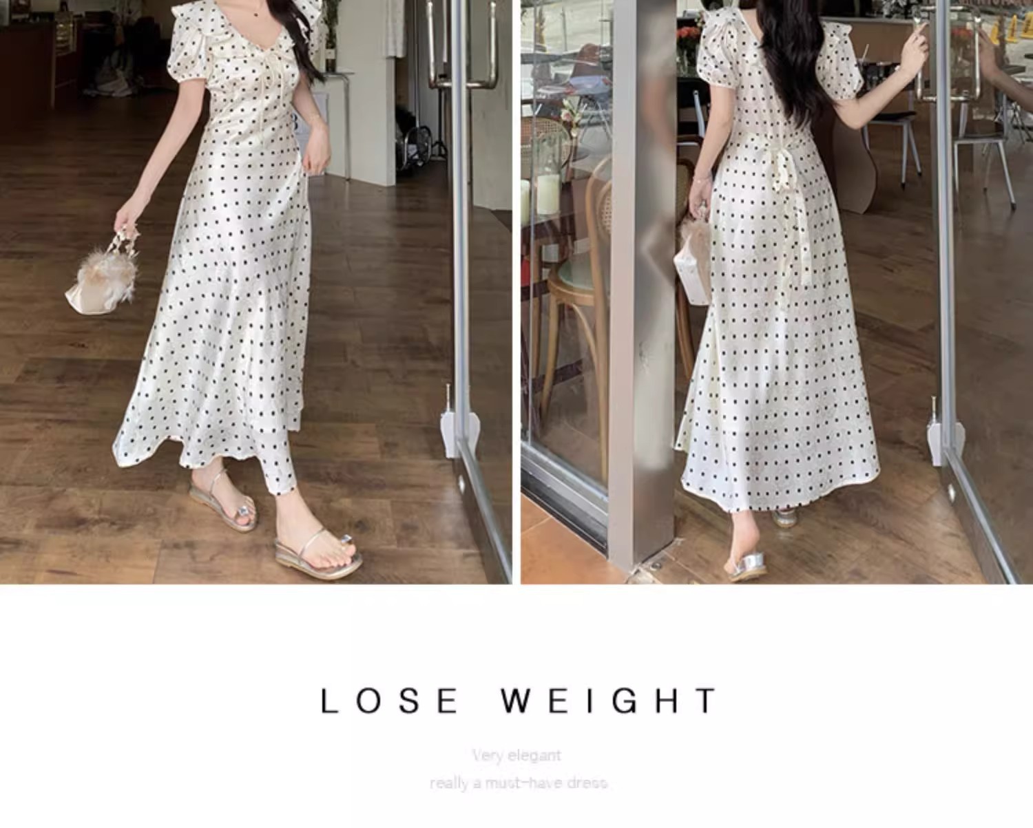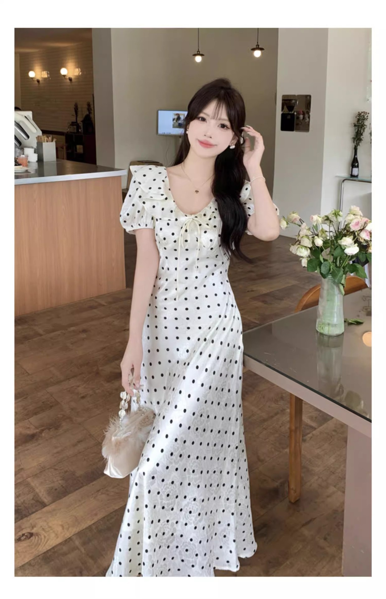 프랑스 스타일 웨이브 도트 퍼프 슬리브 원피스 여성 여름 해변 휴가 부드러운 스타일 웨이스트 우아한 독특한 아름다운 작은 원피스