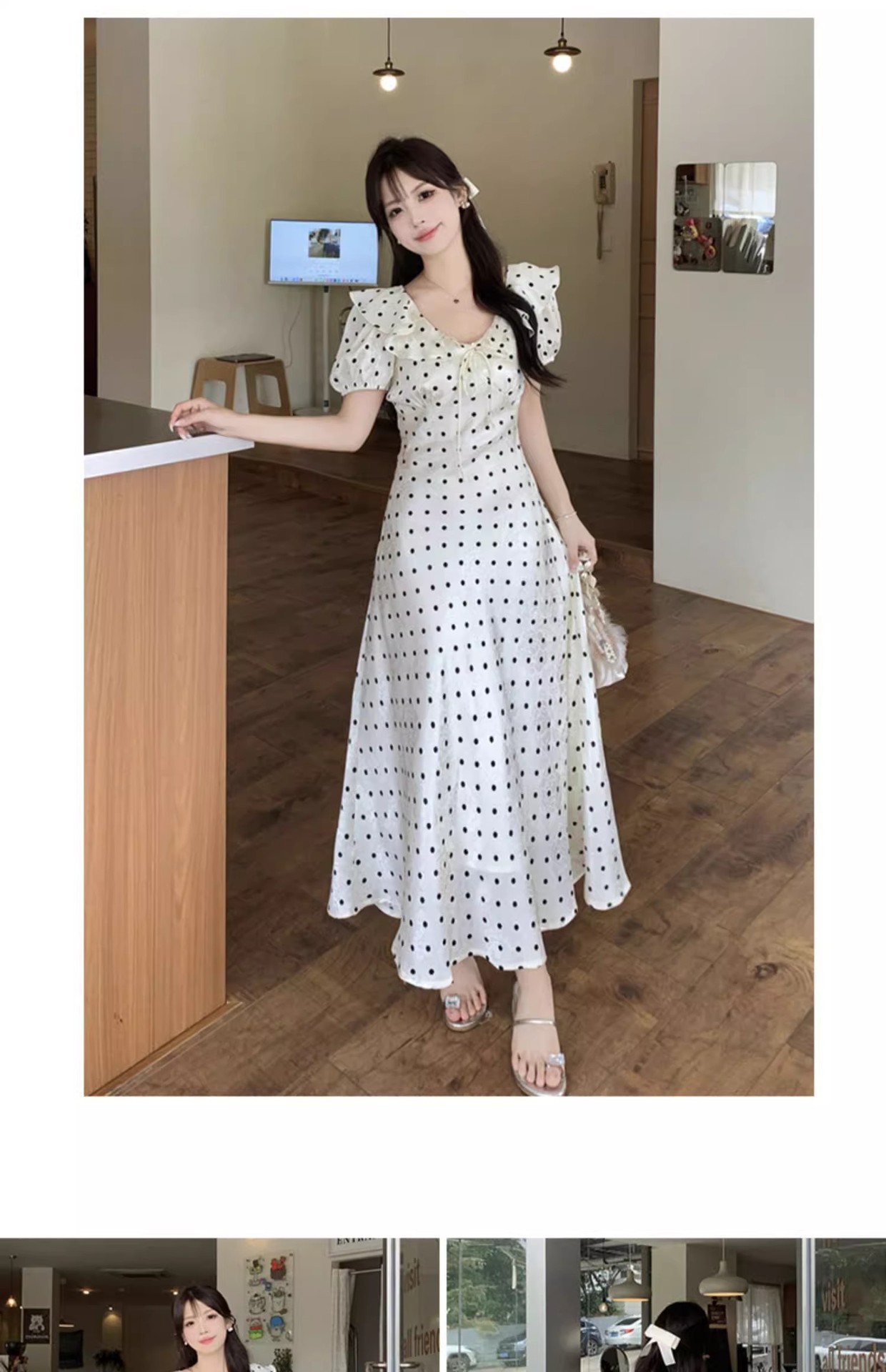 프랑스 스타일 웨이브 도트 퍼프 슬리브 원피스 여성 여름 해변 휴가 부드러운 스타일 웨이스트 우아한 독특한 아름다운 작은 원피스스토어 가기