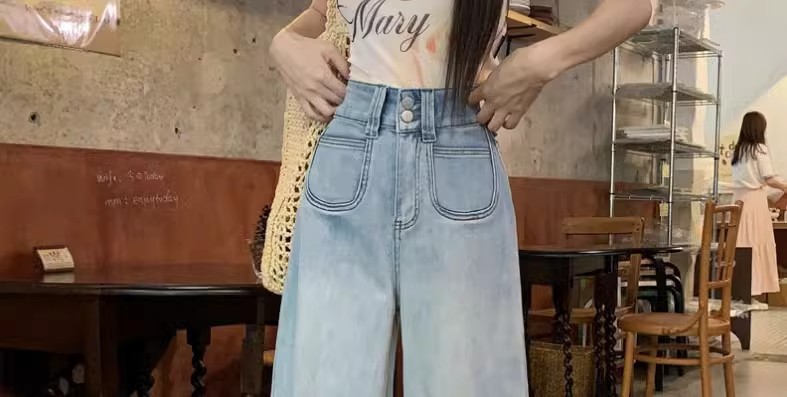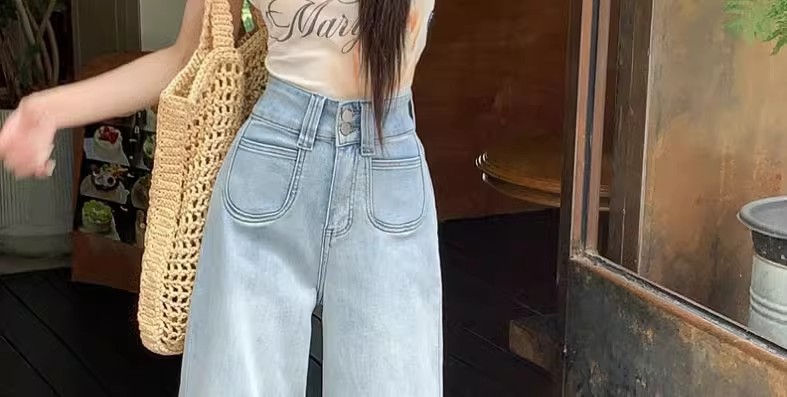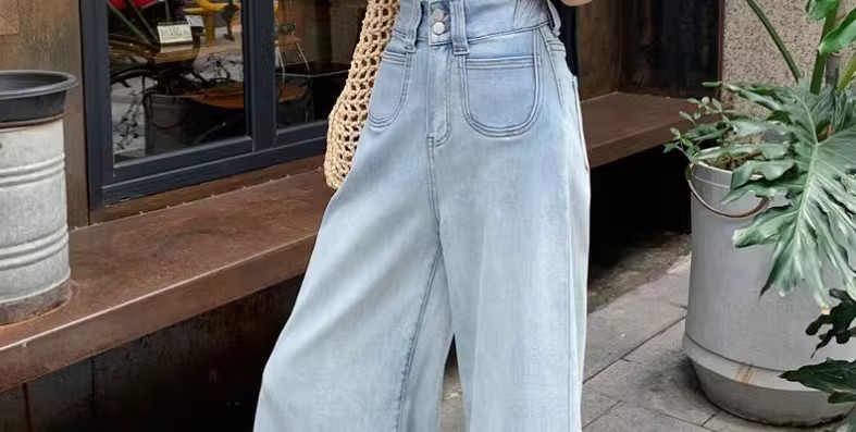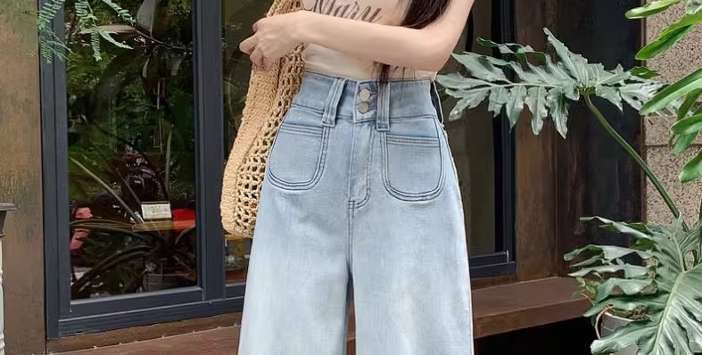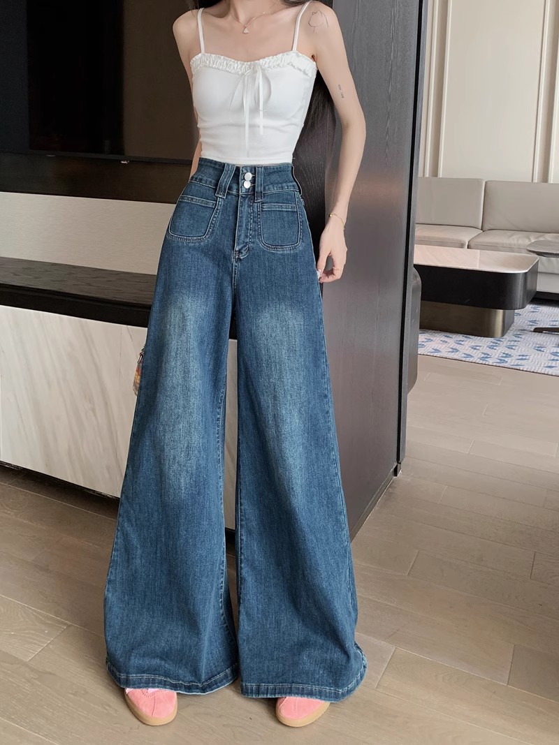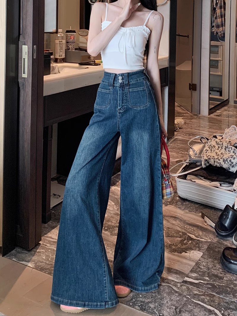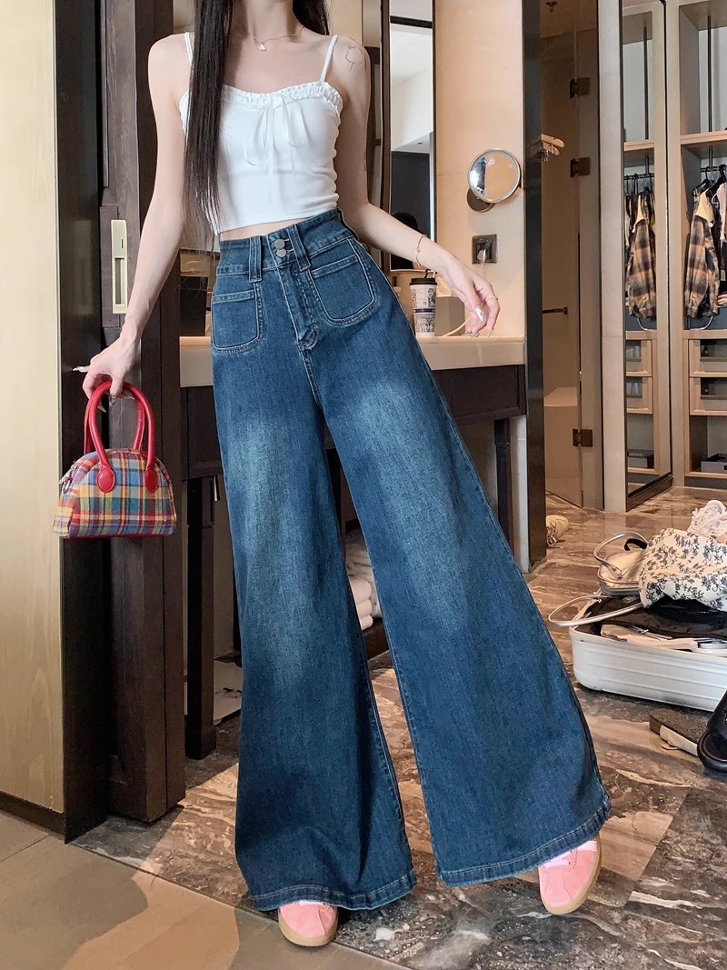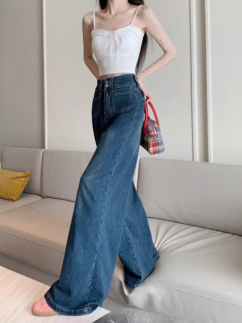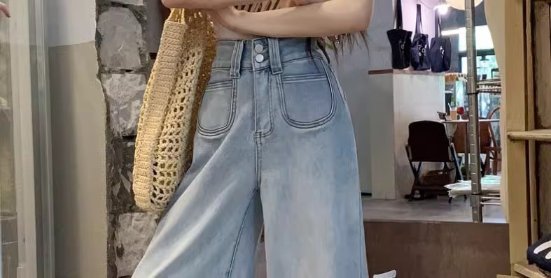 2025 봄 새로운 더블 버클 높은 허리 느슨하지 않은 약간의 청바지 여성의 닦아 넓은 다리 바지스토어 가기