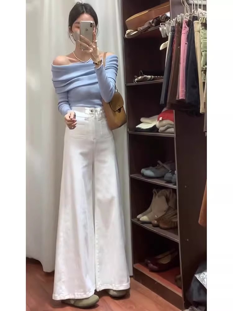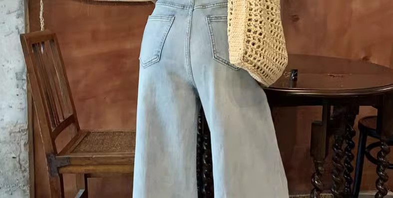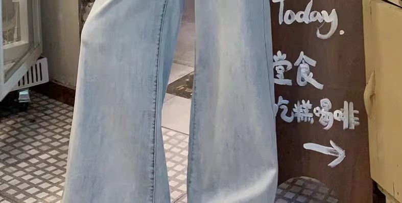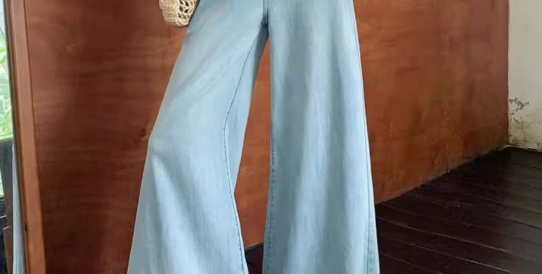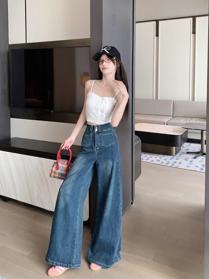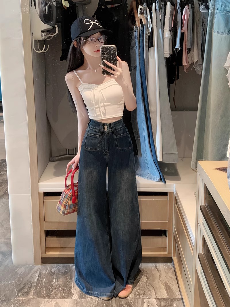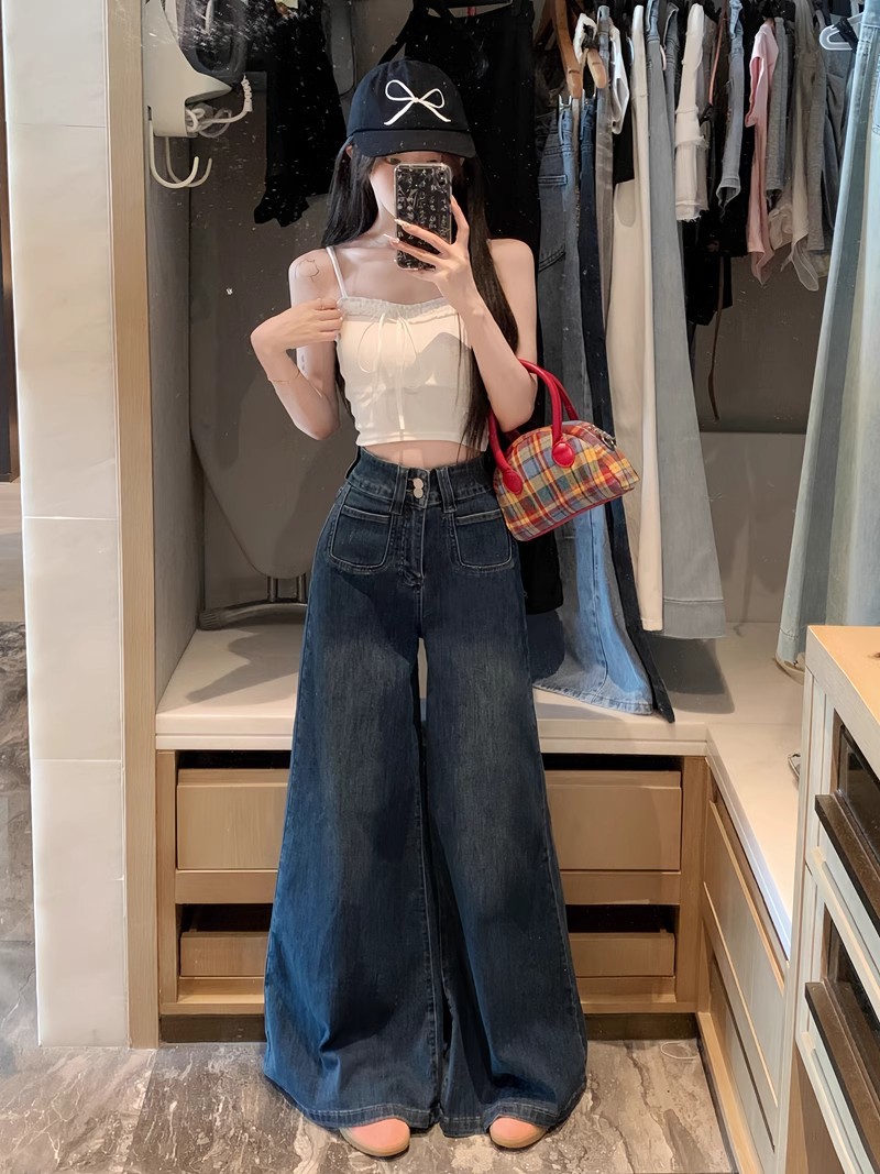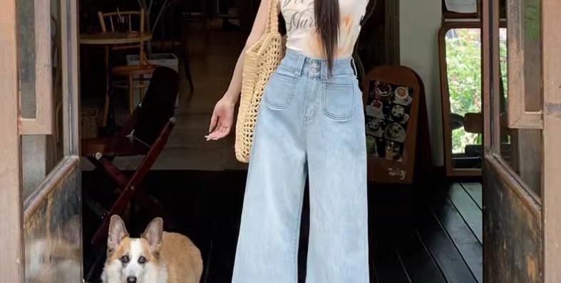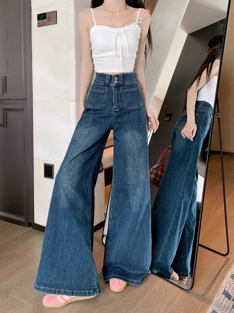 2025 봄 새로운 더블 버클 높은 허리 느슨하지 않은 약간의 청바지 여성의 닦아 넓은 다리 바지스토어 가기