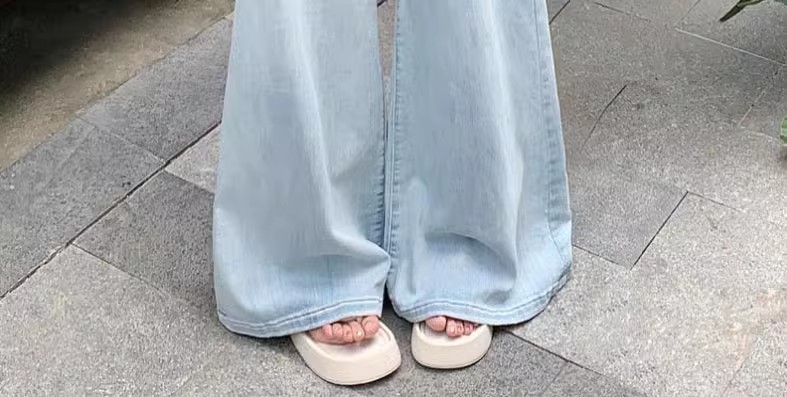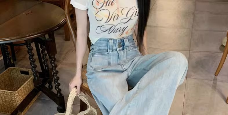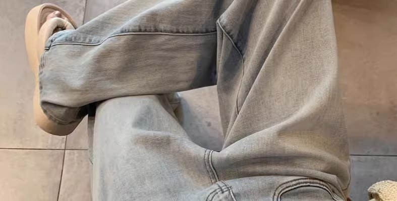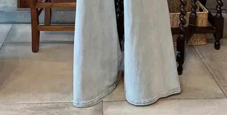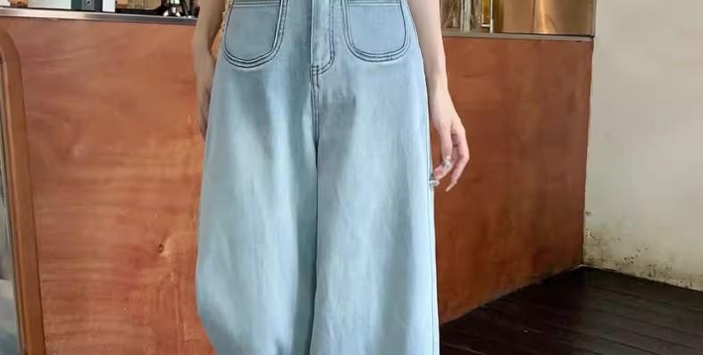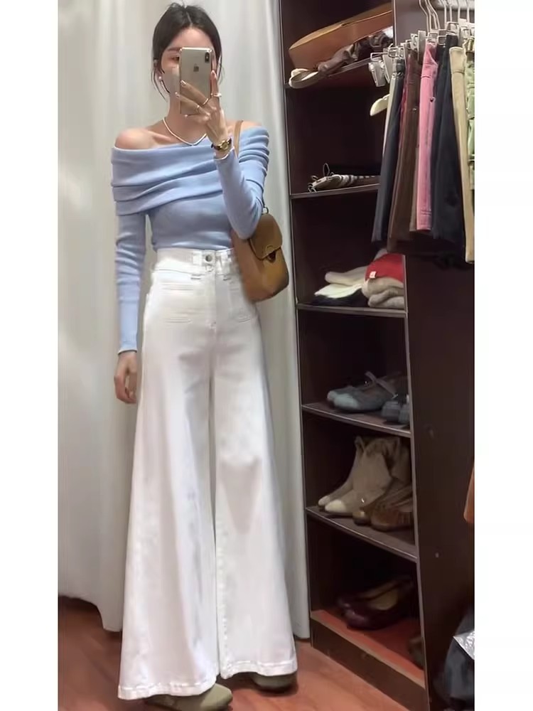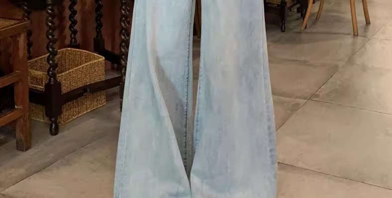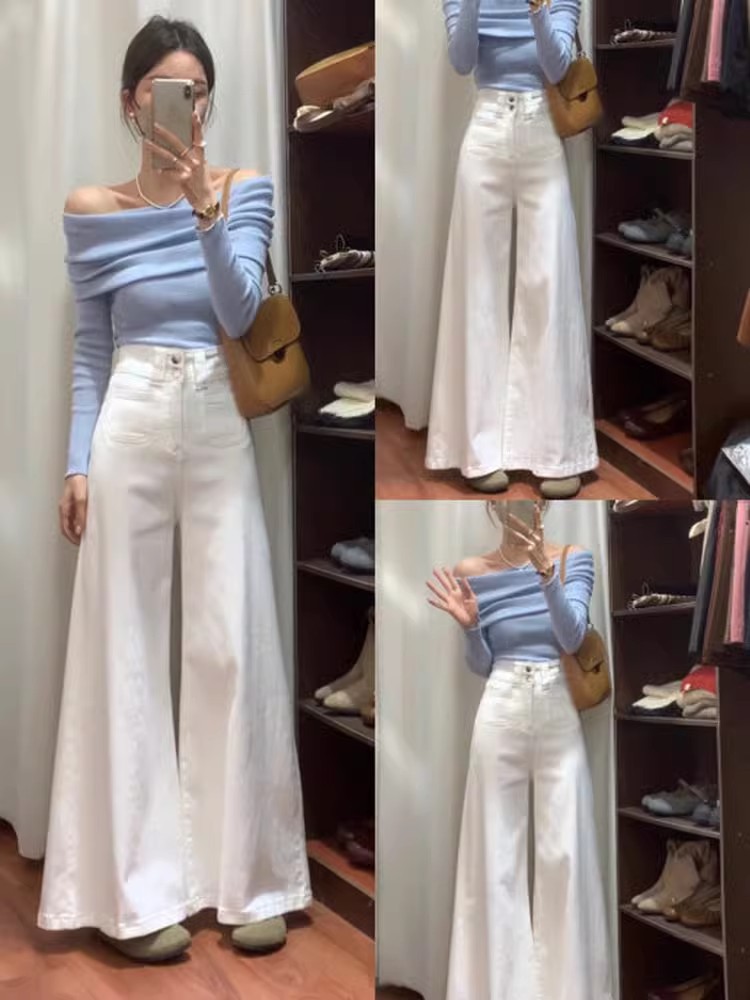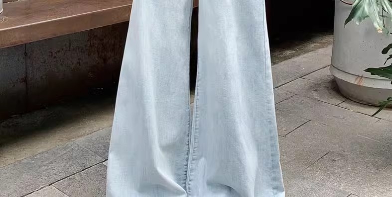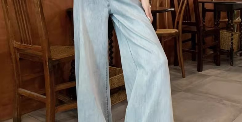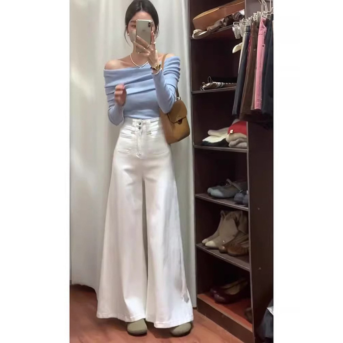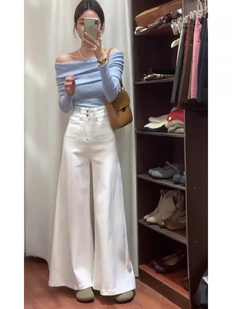 2025 봄 새로운 더블 버클 높은 허리 느슨하지 않은 약간의 청바지 여성의 닦아 넓은 다리 바지스토어 가기
