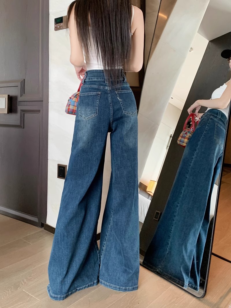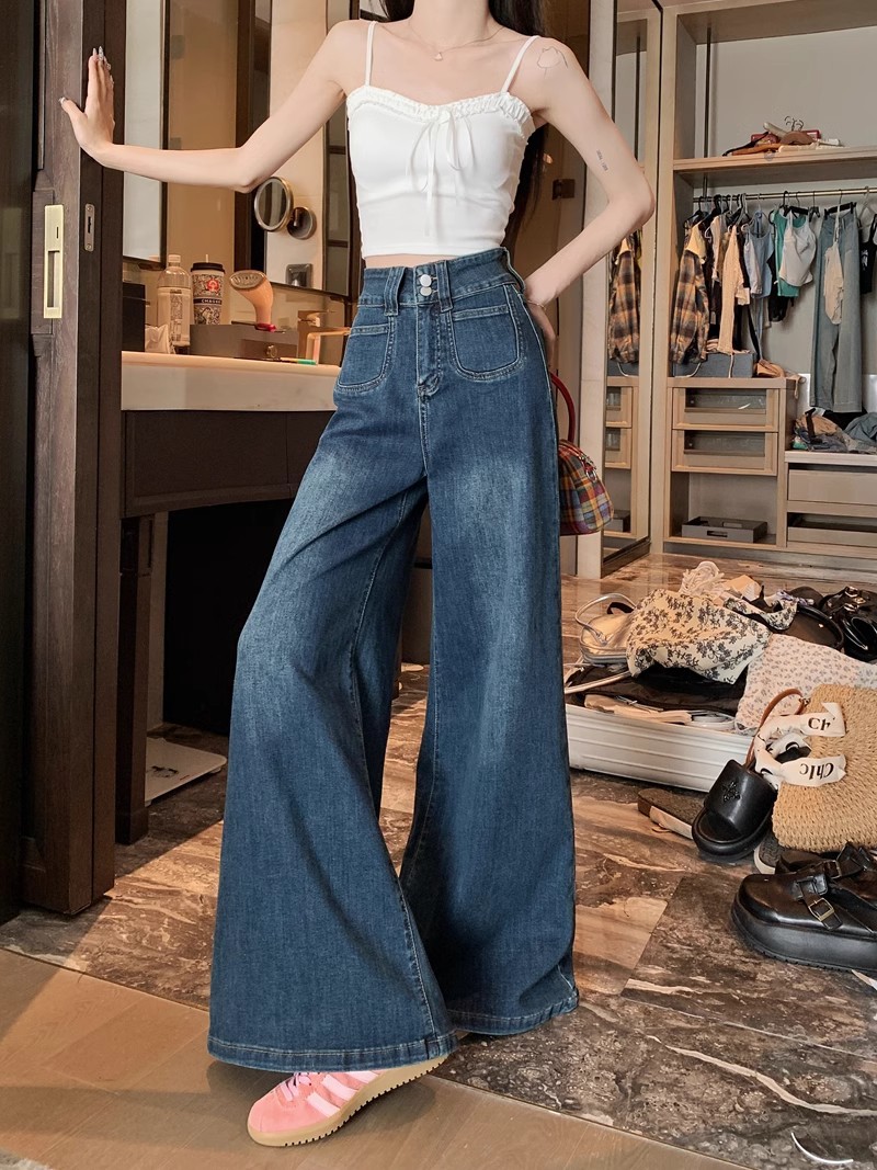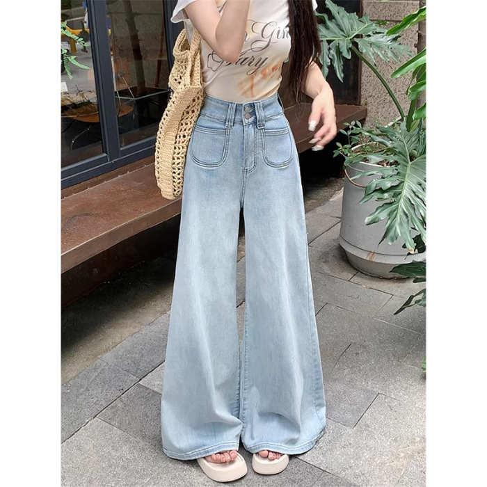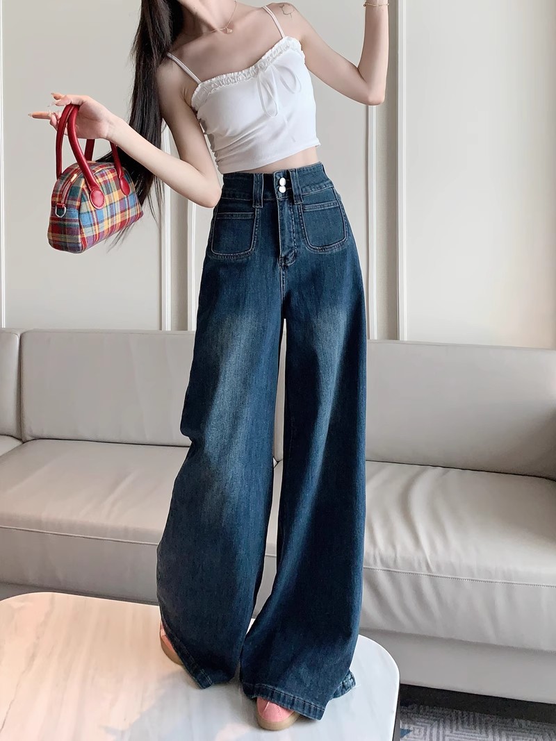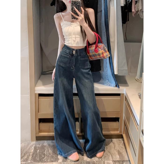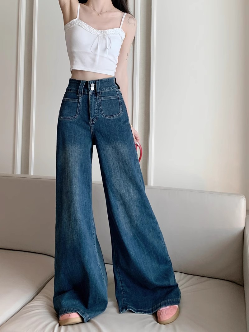 2025 봄 새로운 더블 버클 높은 허리 느슨하지 않은 약간의 청바지 여성의 닦아 넓은 다리 바지
