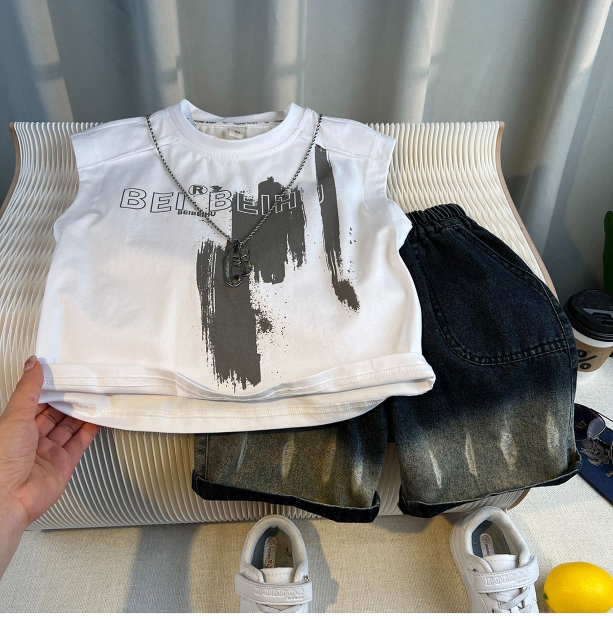 한국 스타일 유행 소년 조끼 세트 2025 년 여름 새로운 도착 리퍼 잘 생긴 어린이 여름 옷 아기 민소매 옷스토어 가기