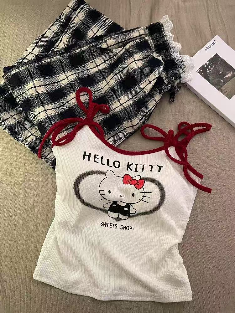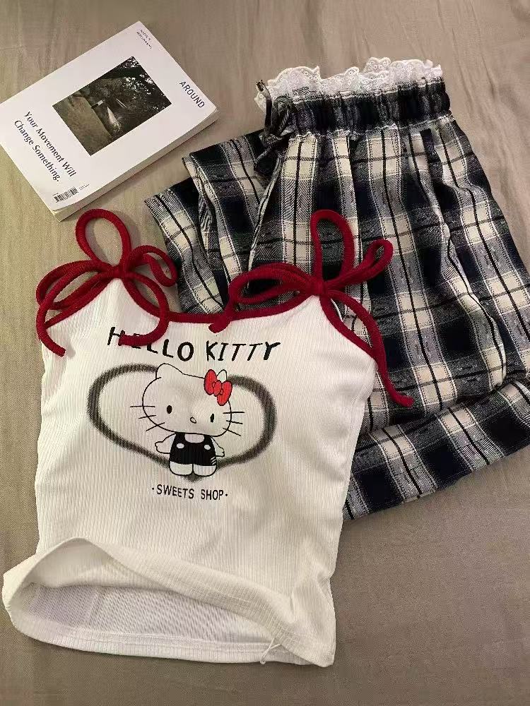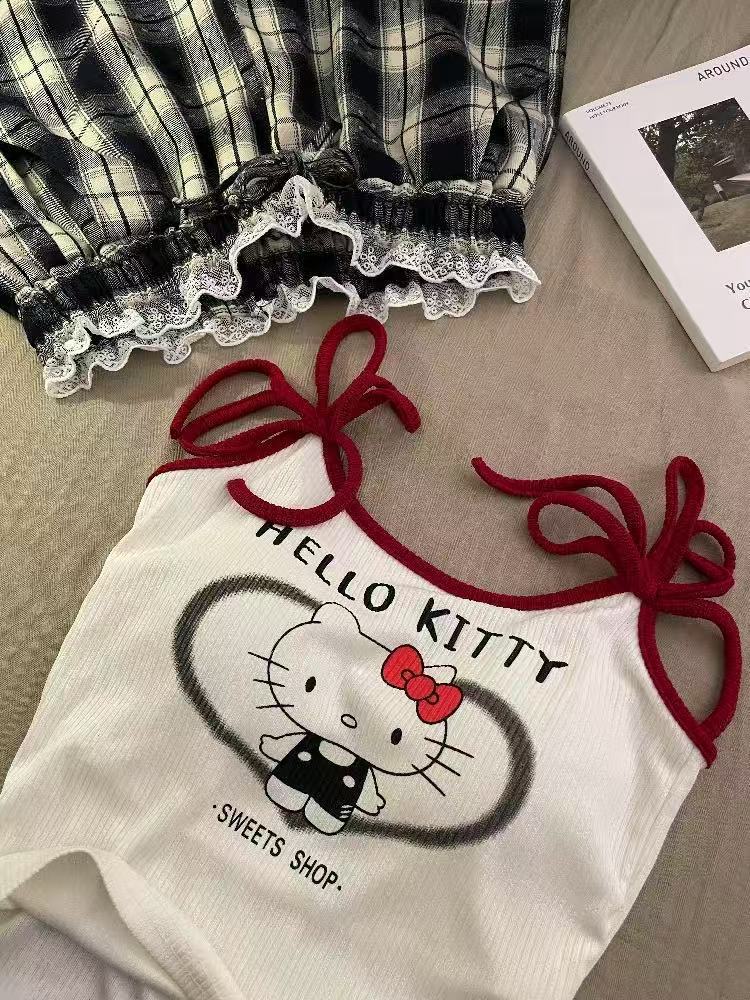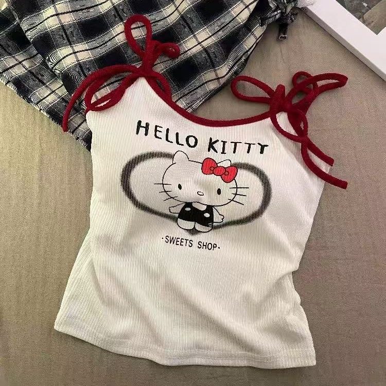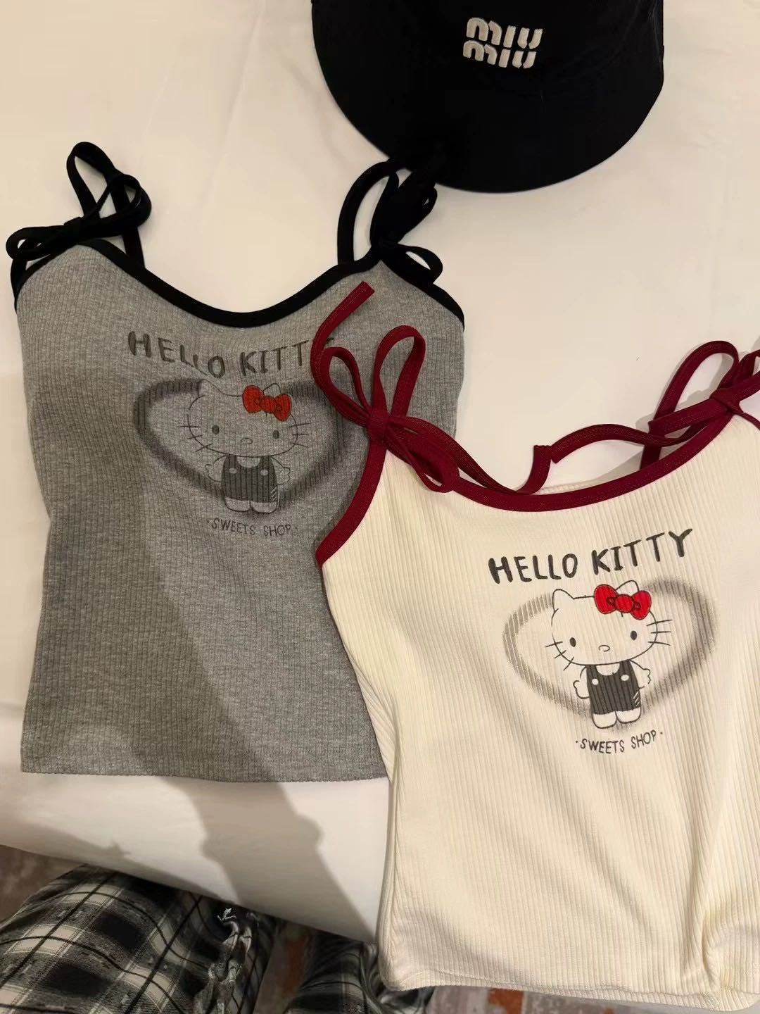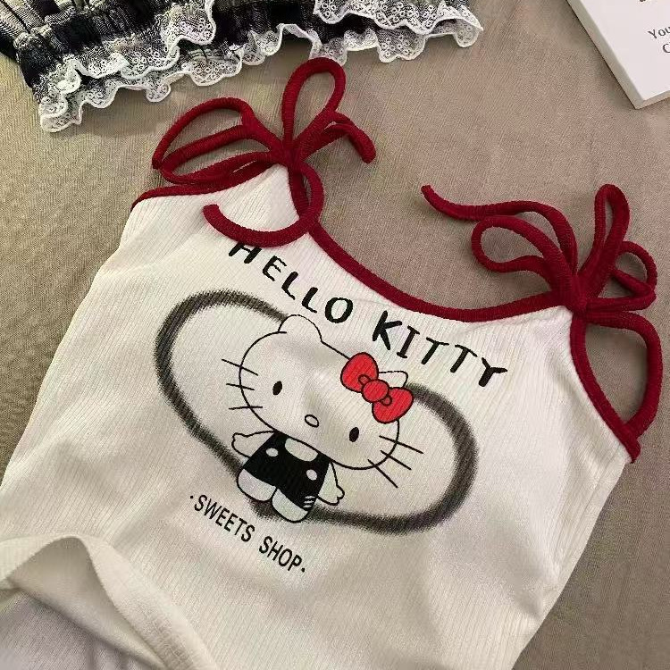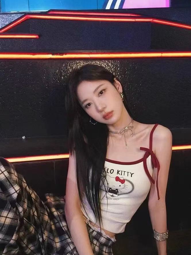 인터넷 연예인 달콤하고 매운 키티 고양이 프린트 대비 색상 드로스트링 슬링 핫걸 섹시 베스트(가슴 패드 포함) 이너탑