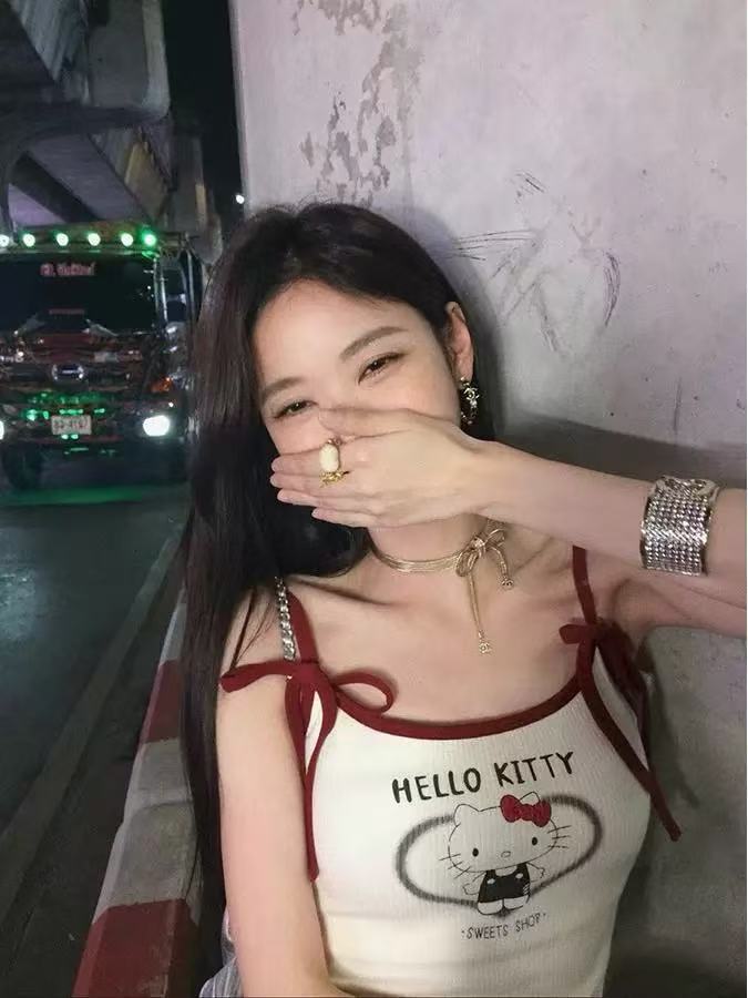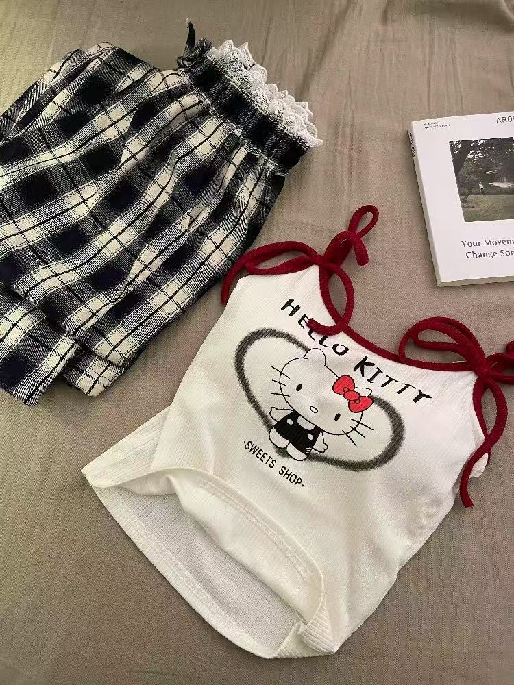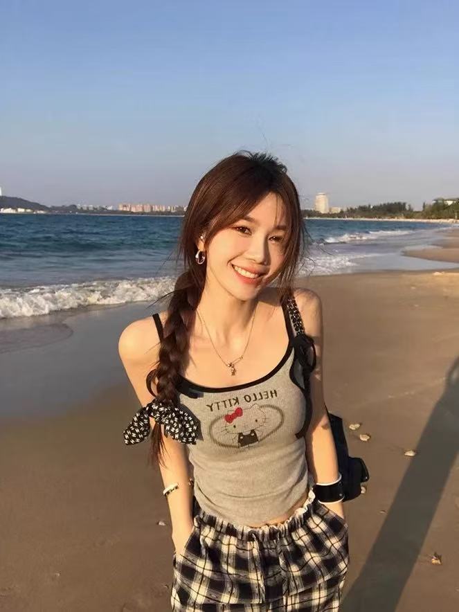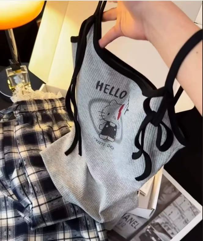 인터넷 연예인 달콤하고 매운 키티 고양이 프린트 대비 색상 드로스트링 슬링 핫걸 섹시 베스트(가슴 패드 포함) 이너탑스토어 가기