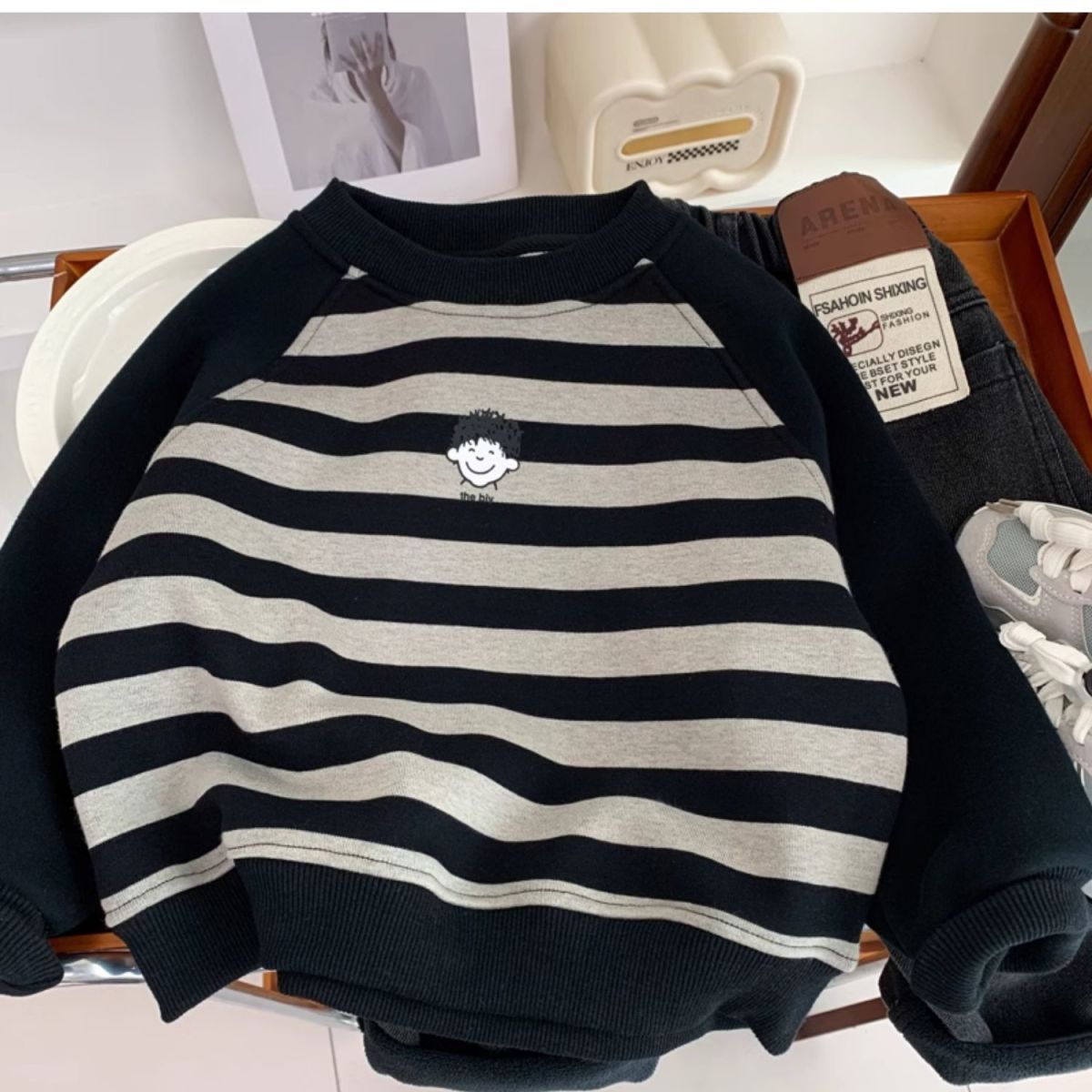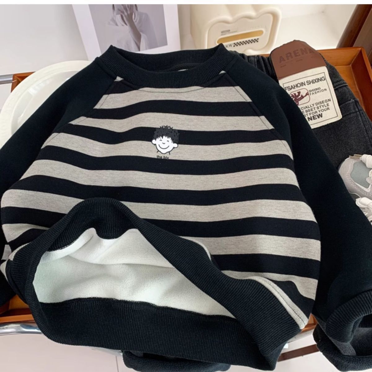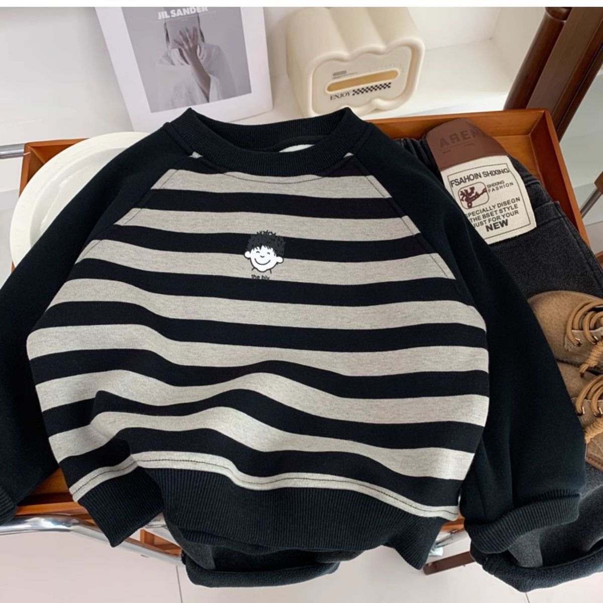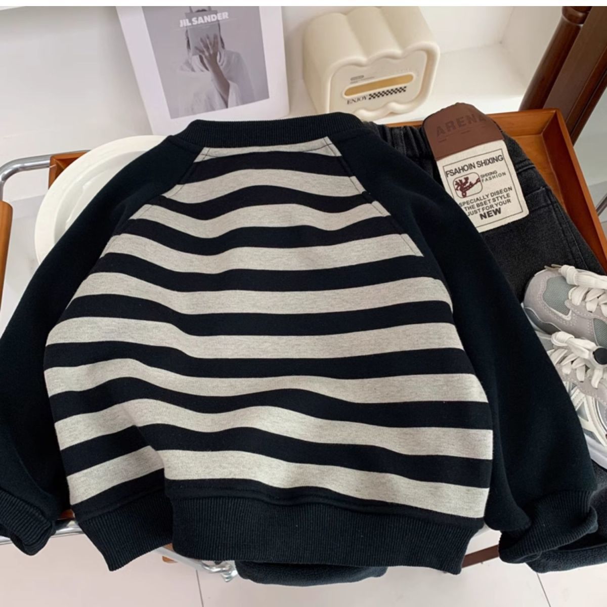 남아용 스트라이프 벨벳 스웨트셔츠, 멋진 남아용 원피스 벨벳 소프트 풀오버, 아동용 한국식 가을 겨울 상의, 트렌디스토어 가기