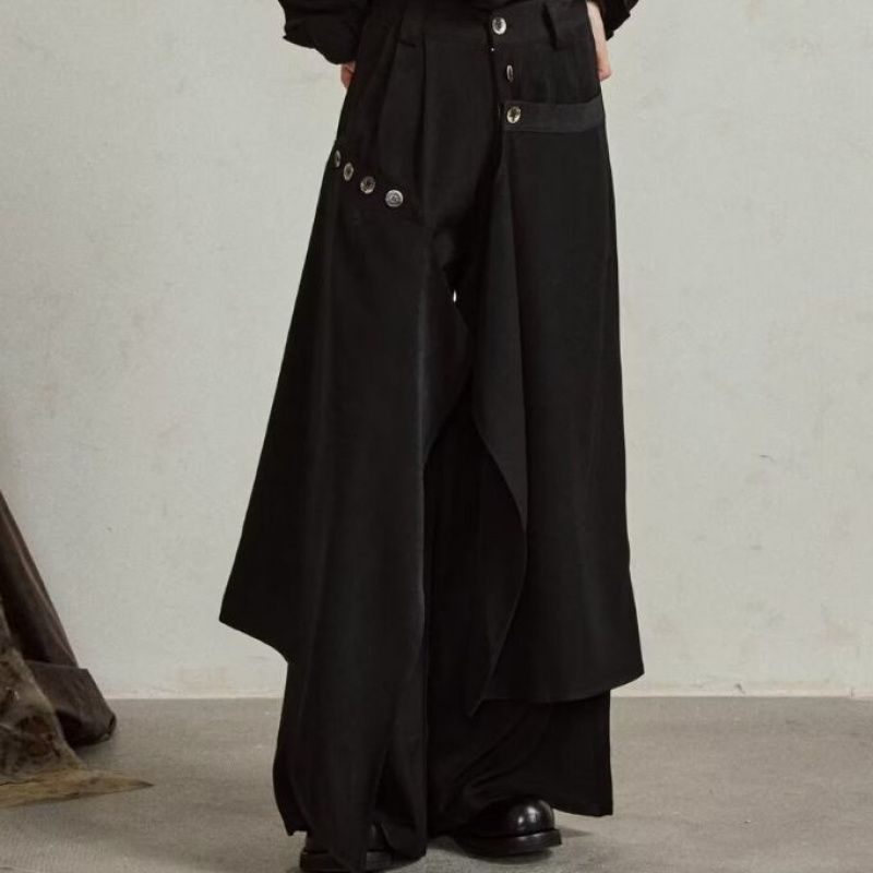 고급 감각 멀티 버튼 불규칙한 Culottes Yamamoto 성별없는 바지 스커트 디자인 센스 틈새 자른 넓은 다리 바지