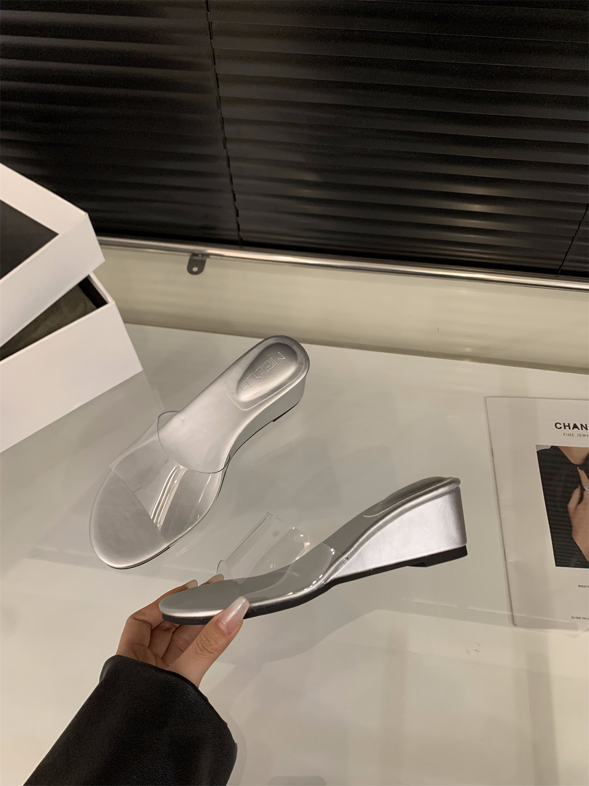 웨지힐, 투명 스트랩 슬리퍼, 여름 2025 아우터용 페어리 슈즈, 스커트, 실버 샌들스토어 가기