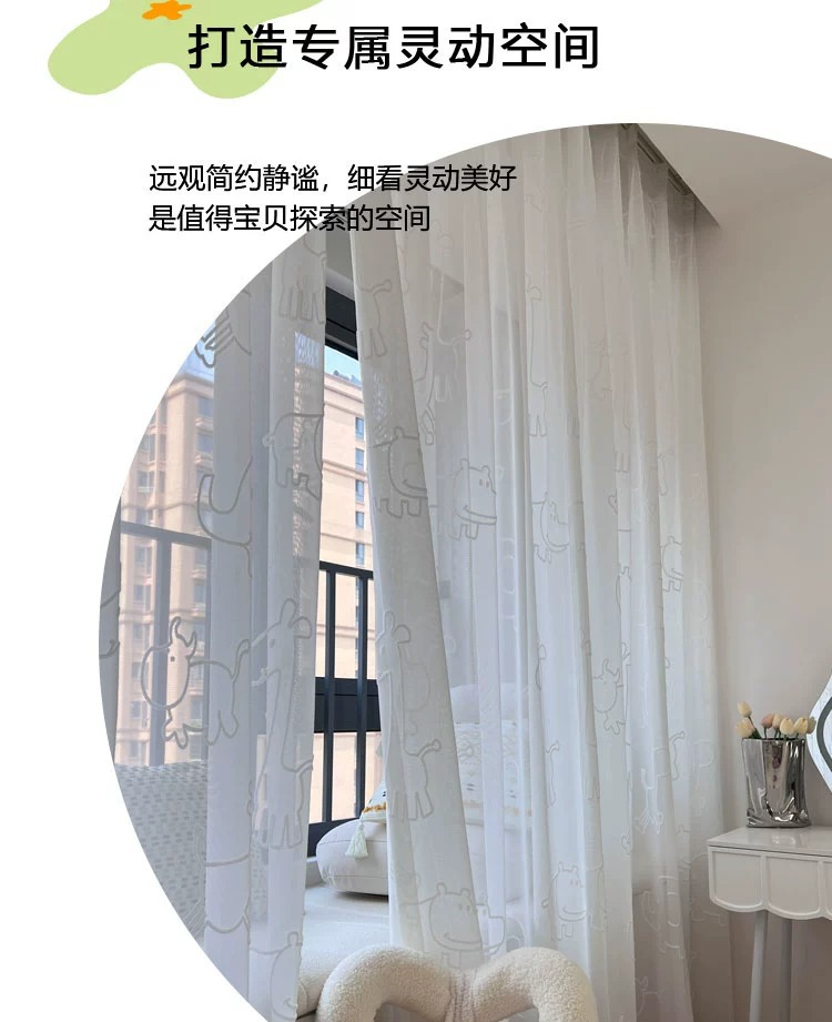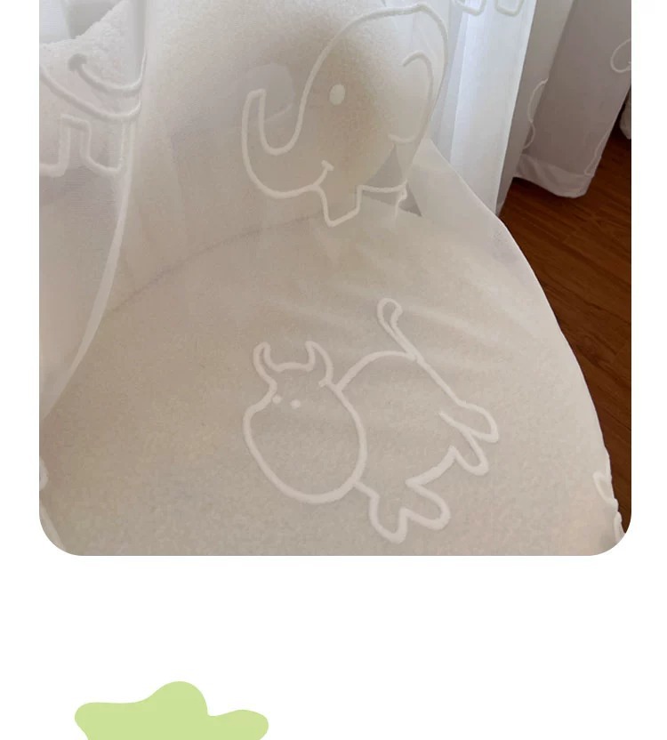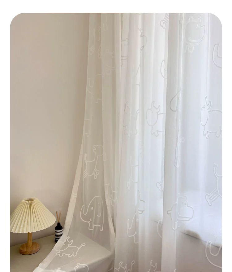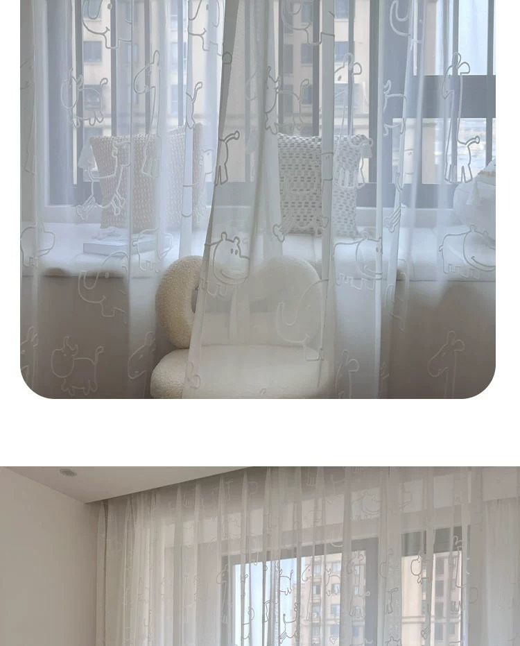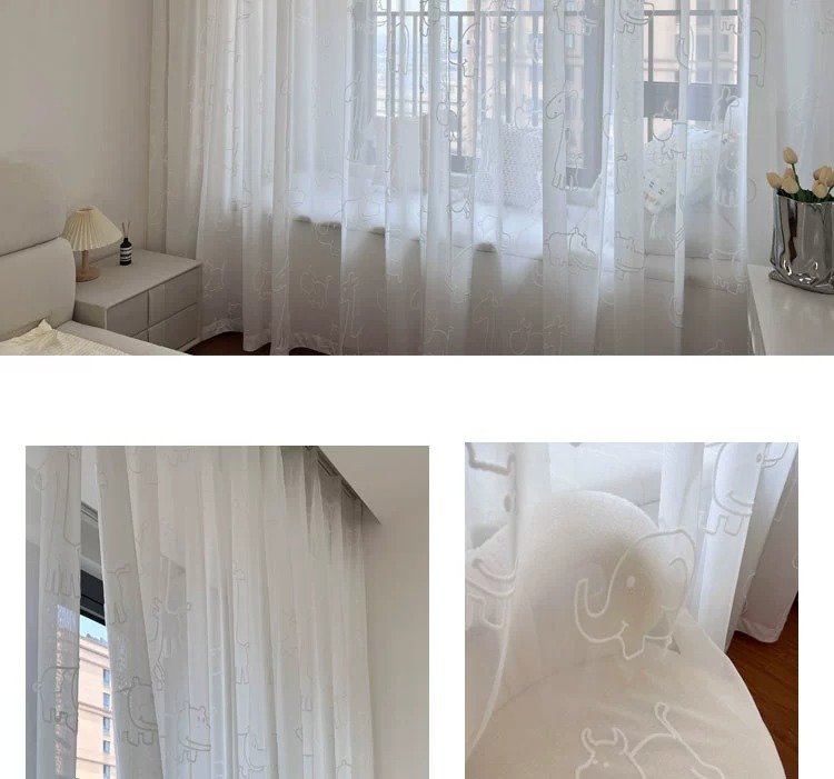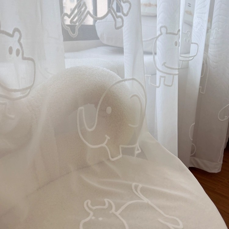 [동물의 왕국] 어린이 방 창 스크린 3D 입체 양각 자수 거즈 커튼 흰색 만화 커튼 침실 베드 창