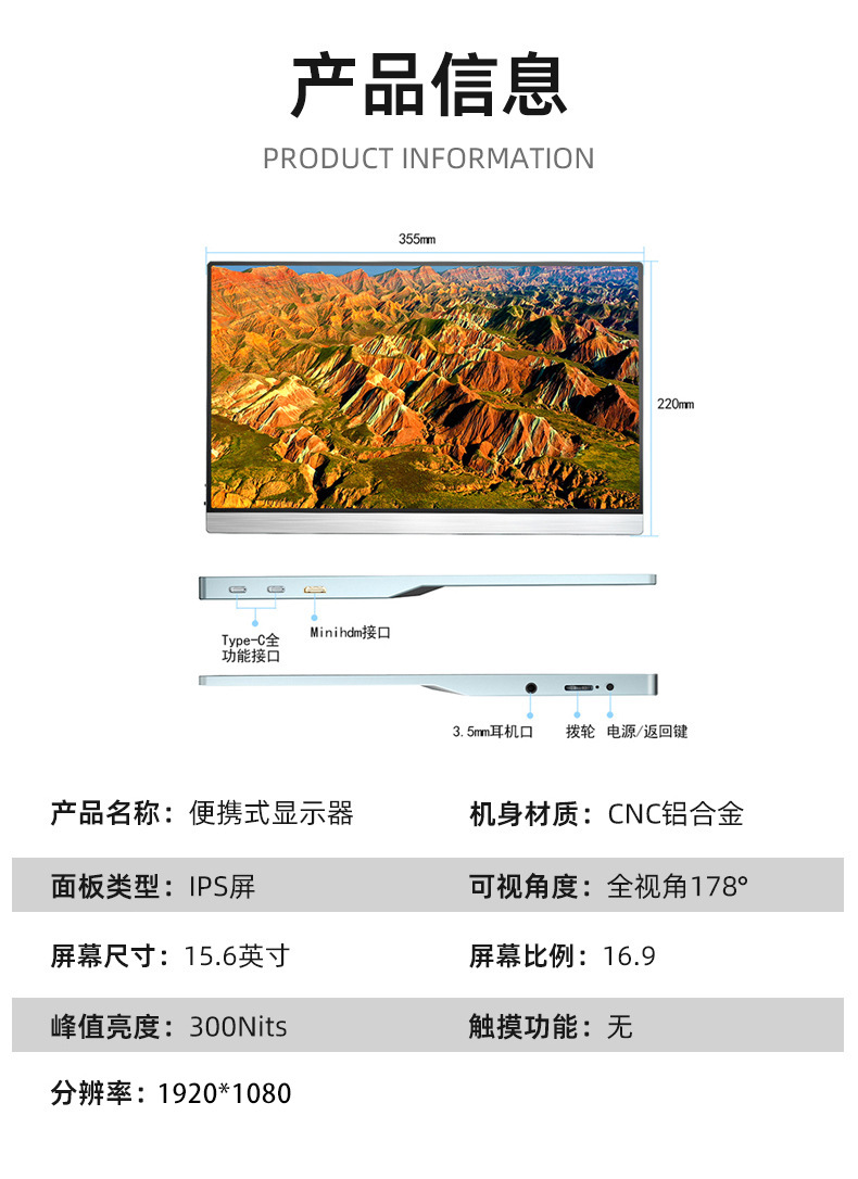 Cross-border 15.6inch 휴대용 디스플레이 HD 디스플레이 보조 화면 통합 확장 듀얼 Type-C 원라인 휴대폰스토어 가기