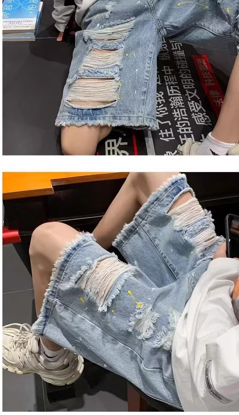 남성용 여름 얇은 5부 데님 반바지 한국 스타일 트렌디 찢어진 슬림 캐주얼 트렌디 브랜드 바지 남성용 5부 바지스토어 가기