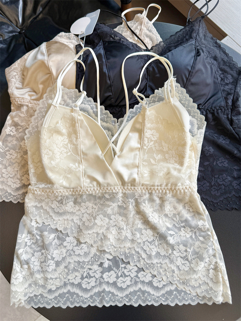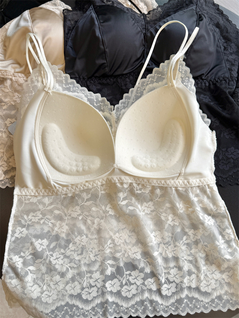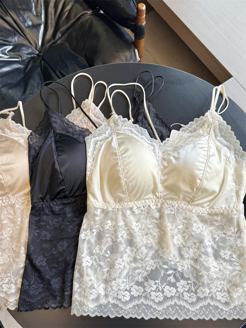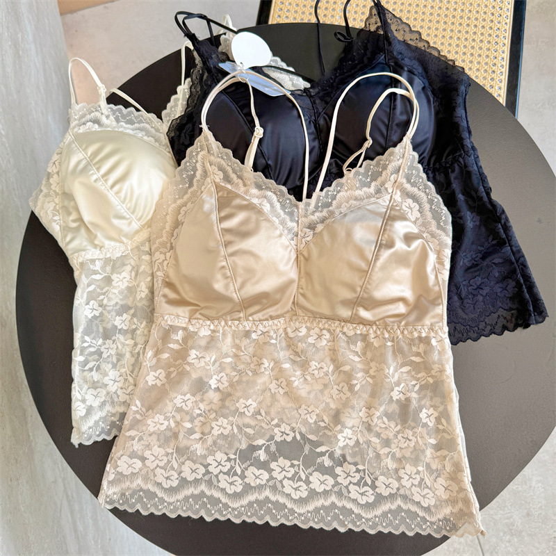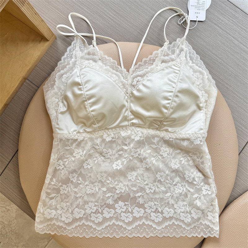 가슴 패드와 아름다운 등이 있는 여름용 얇은 스타일의 새로운 가벼운 럭셔리 새틴 섹시한 레이스 캐미솔 여성용 이너웨어스토어 가기