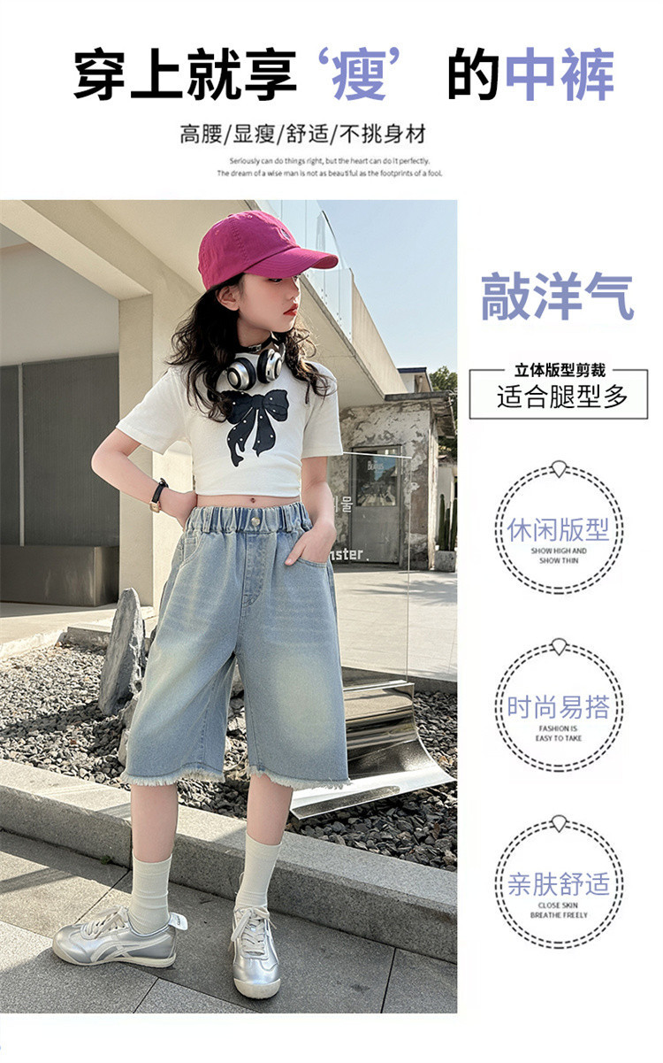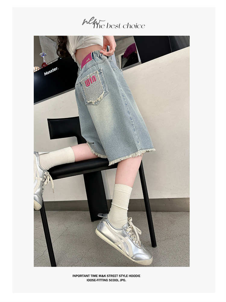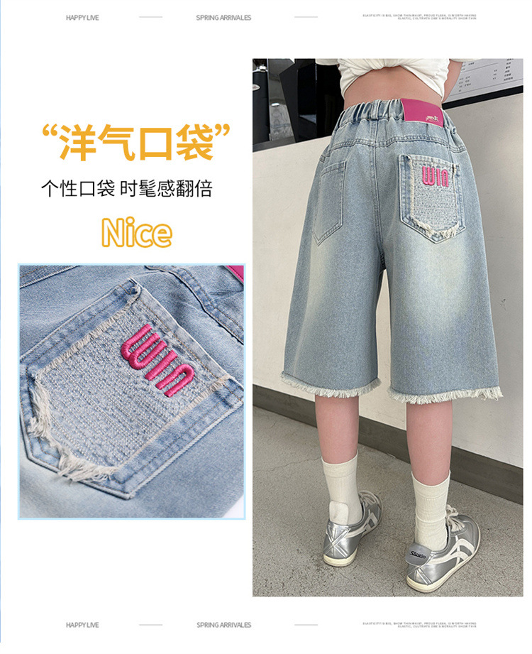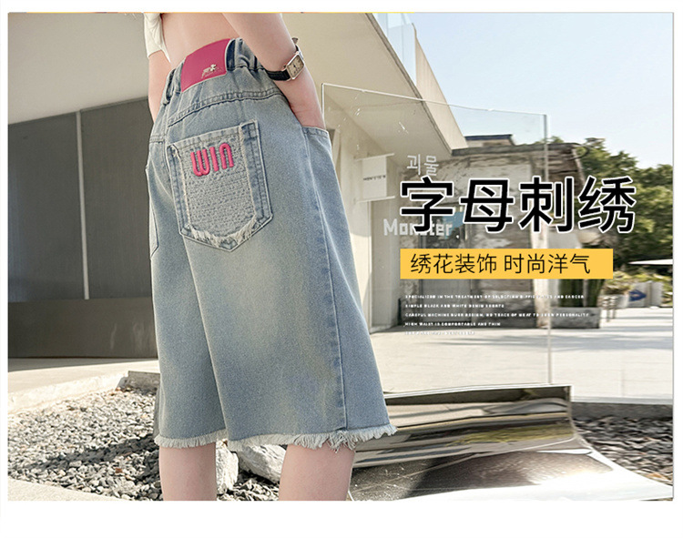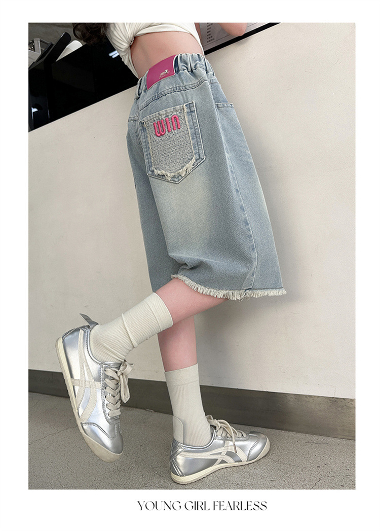 여아 데님 반바지 2026 여름 중대형 아동용 한국 스타일 레터링 다용도 루즈핏 트렌디한 밑단이 웨이브 처리된 얇은 5부 바지