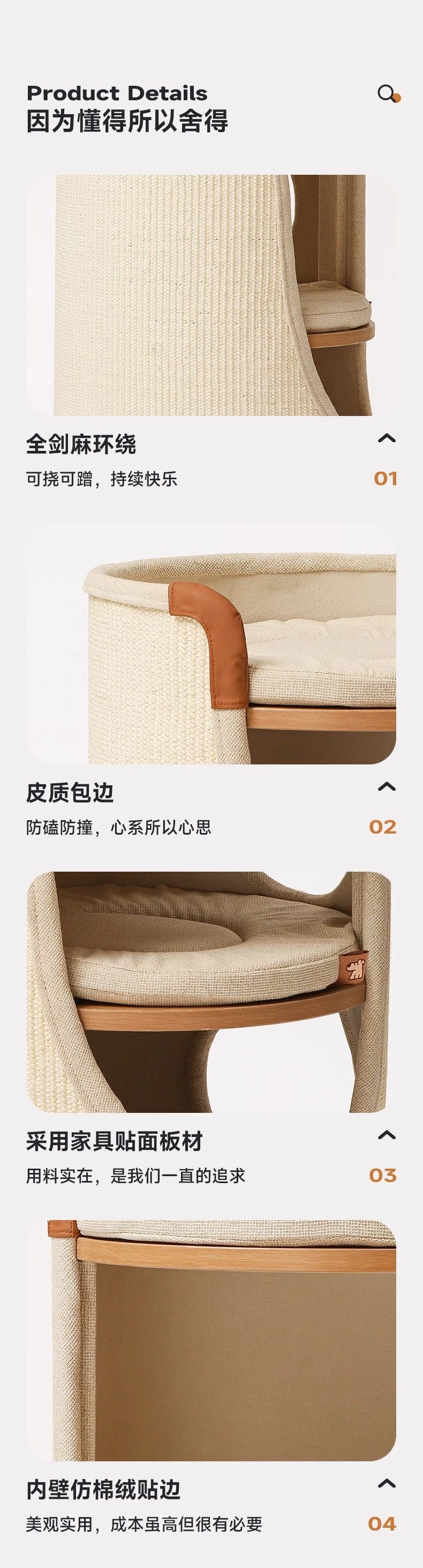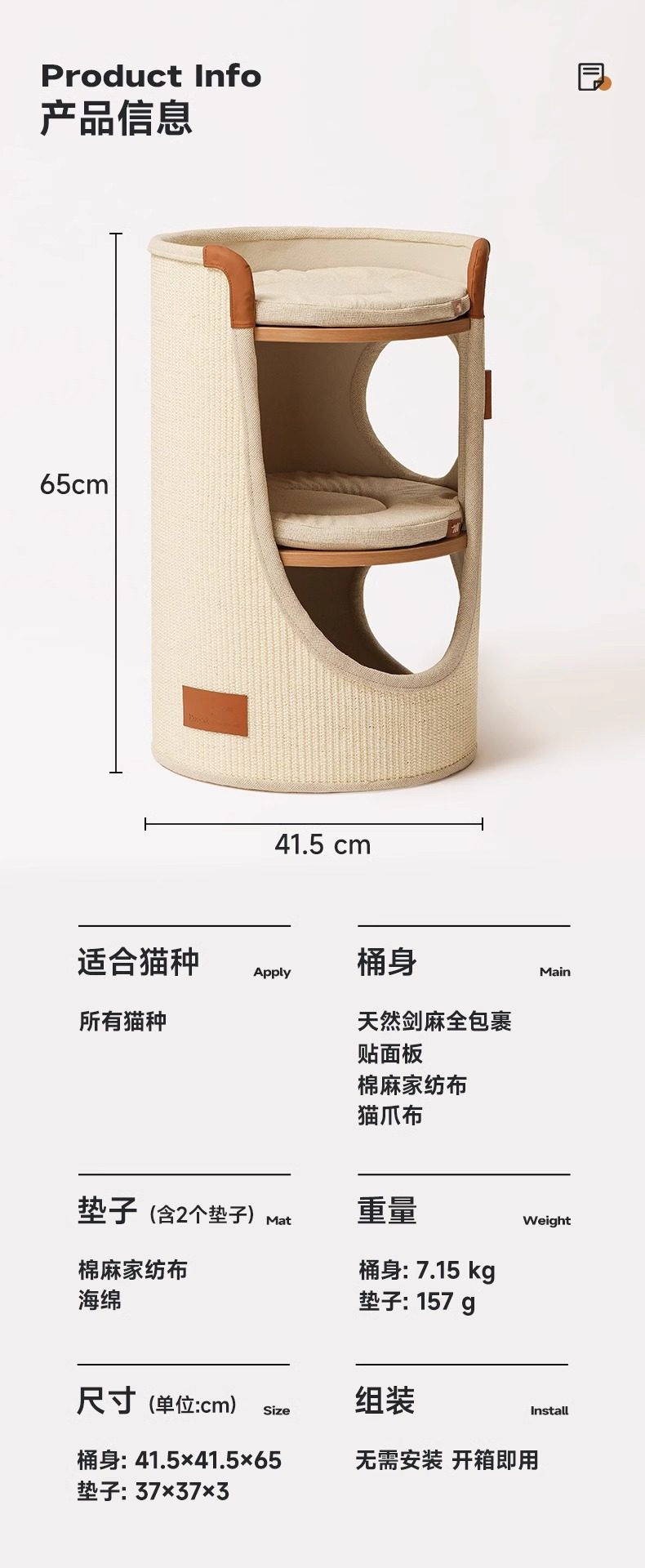 【材质】:桶身:天然剑麻全包裹、贴面板、棉麻家纺布、猫爪布,垫子:棉麻家纺布、海绵