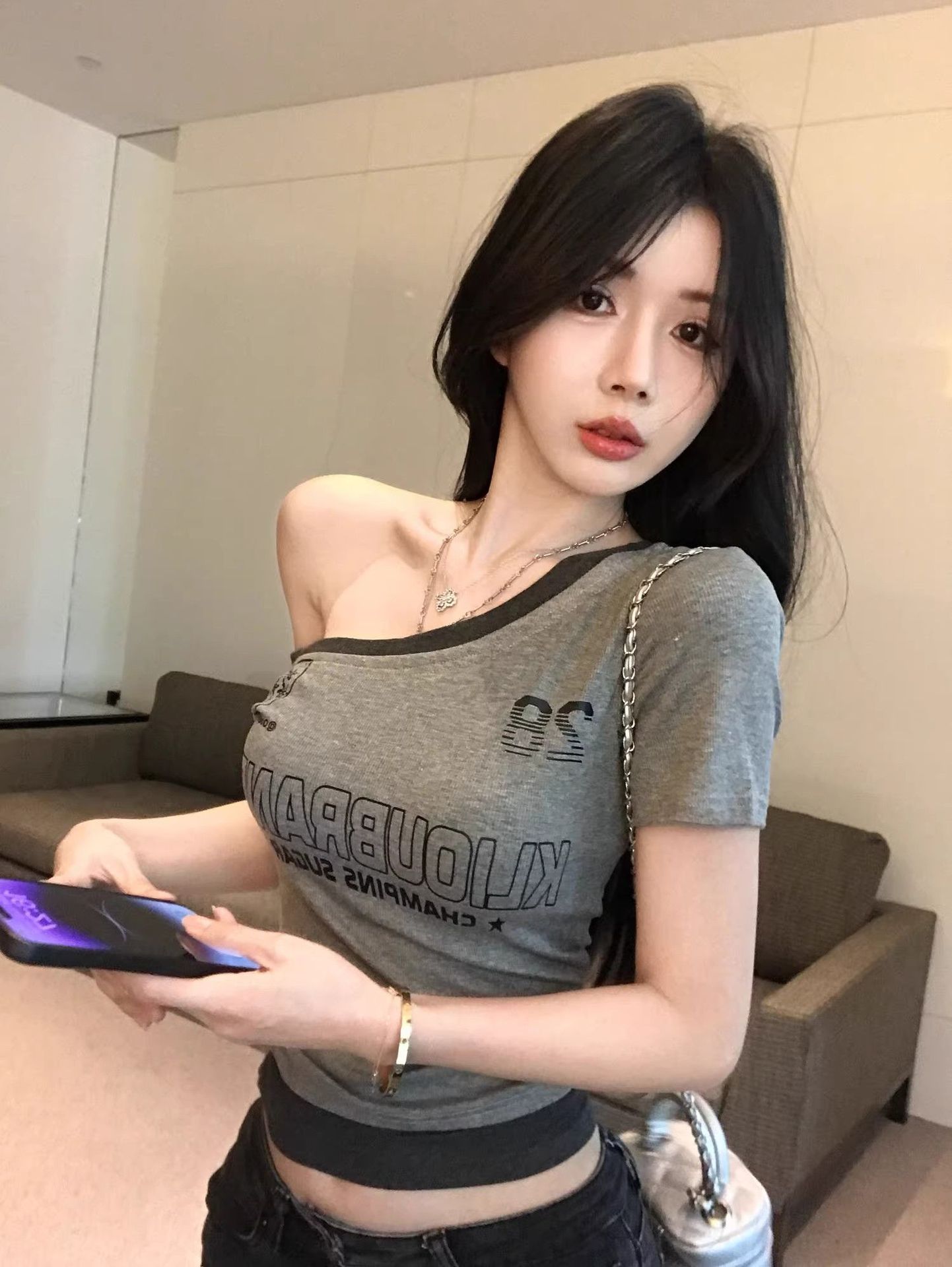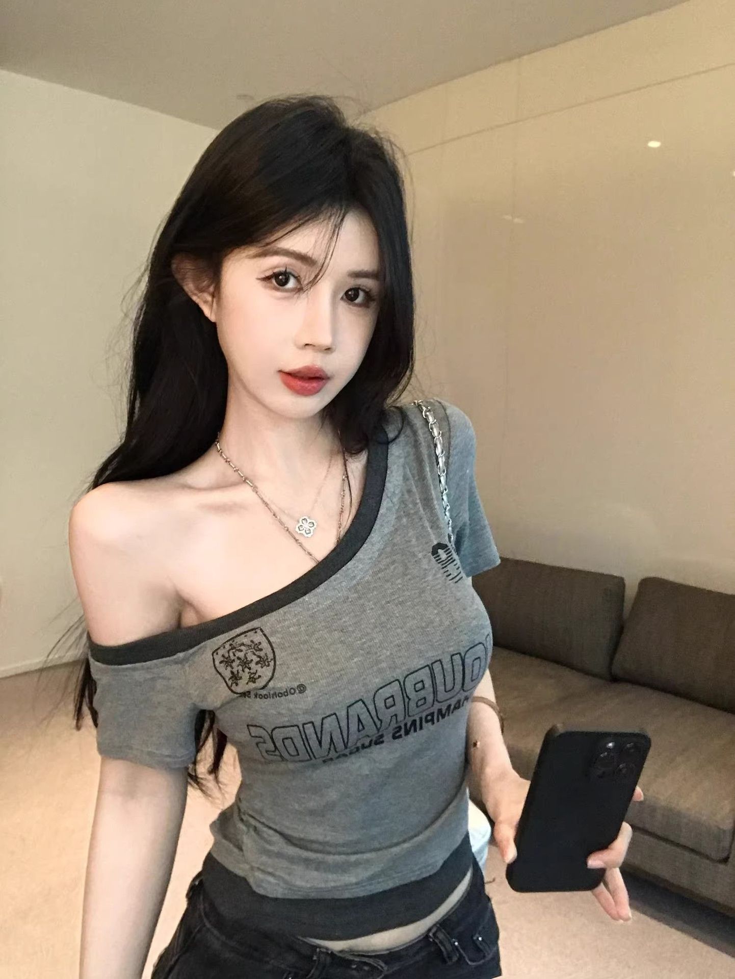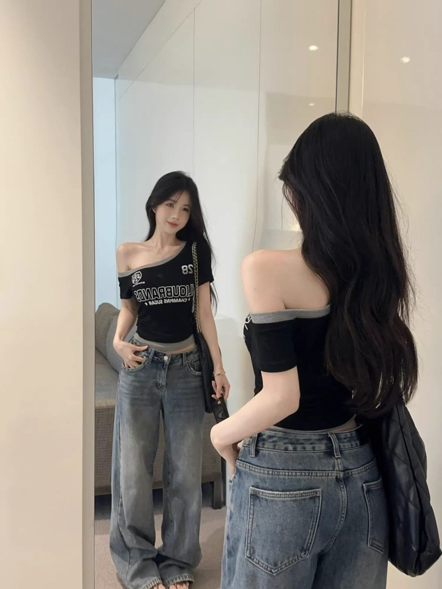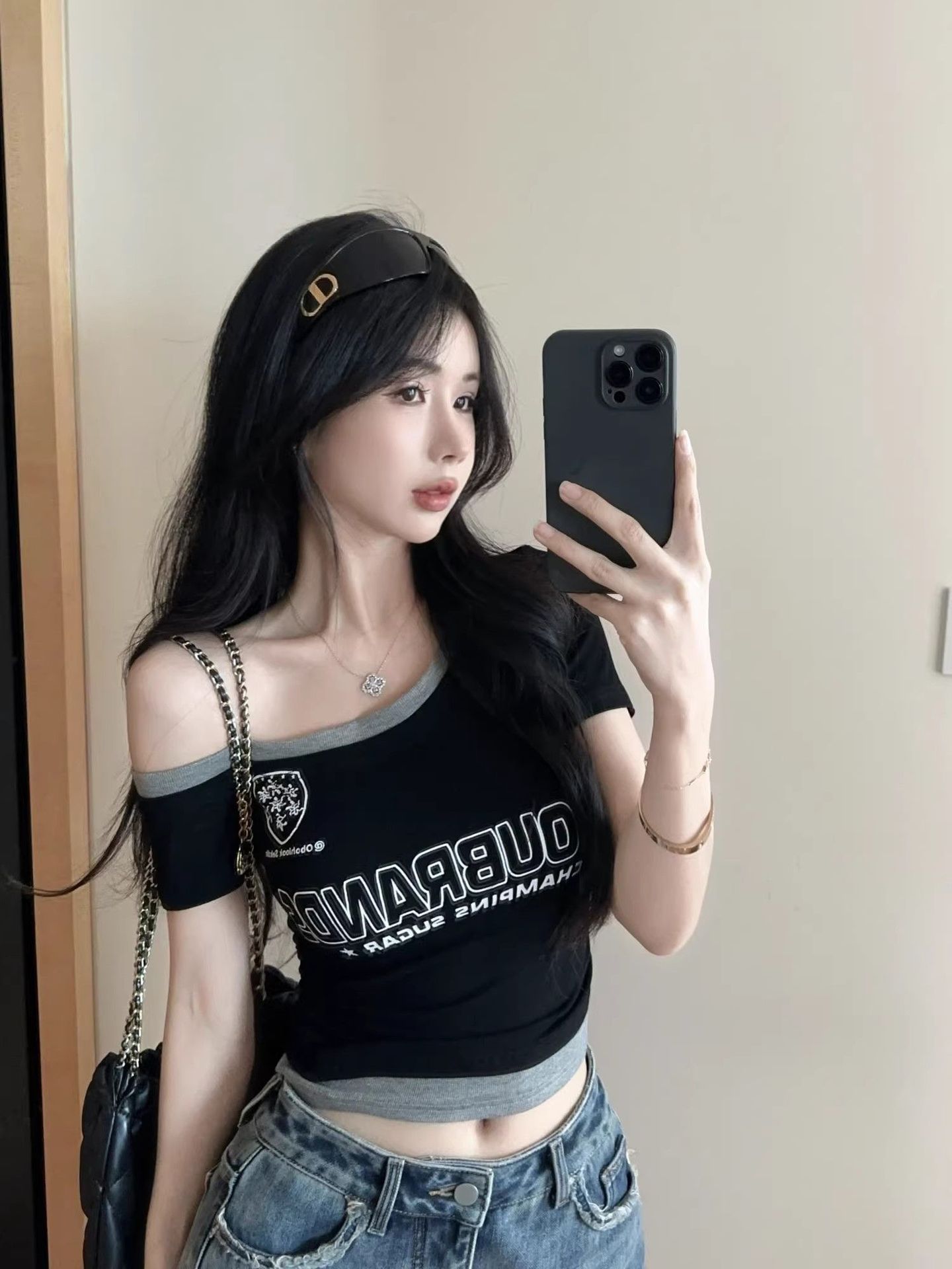 아메리칸 스타일 달콤하고 매운 V 넥 대비 컬러 스티칭 인쇄 반팔 티셔츠 여성용 여름 새로운 슬림 핏 올 매치 슬림 핏 스파이스 걸 탑