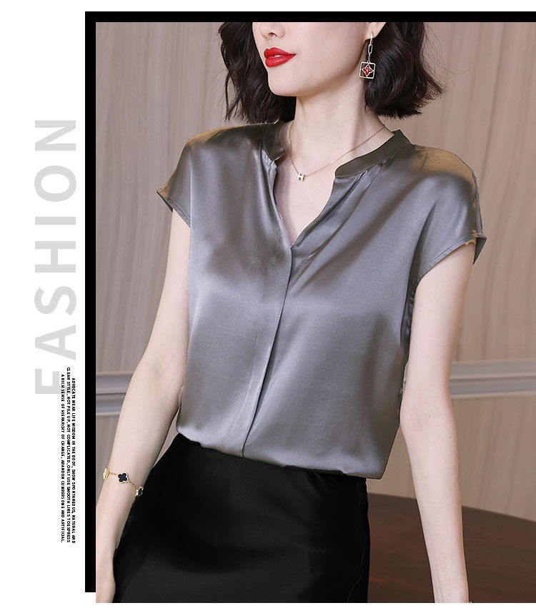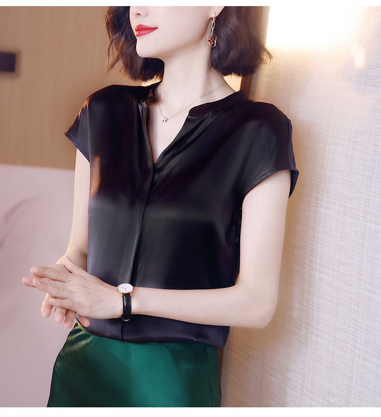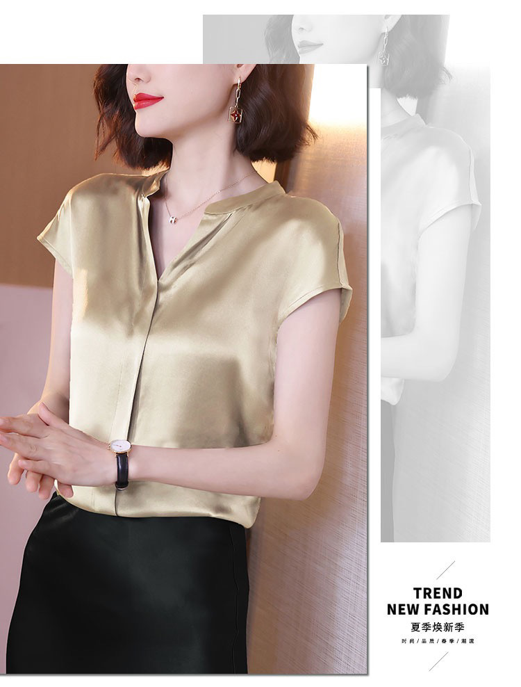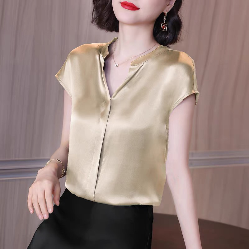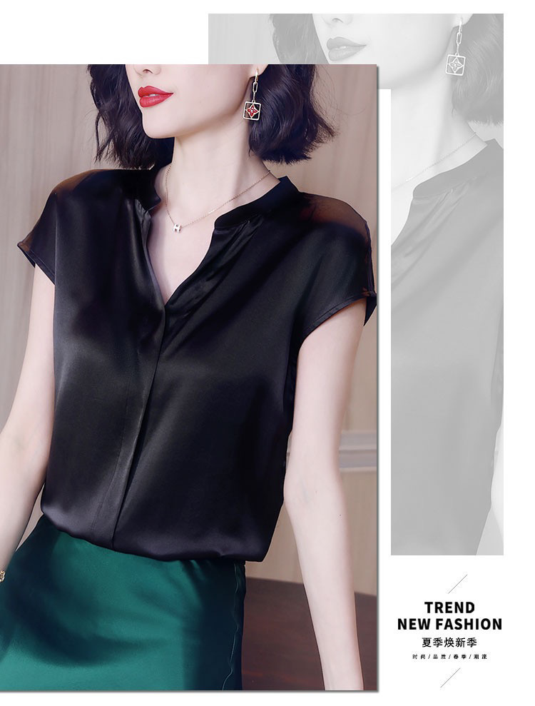 여성용 쉬폰 셔츠, 반팔 디자인, 여성용 니치 브이넥 드레이프 새틴 셔츠, 여성용 여름 얇은 루즈 탑스토어 가기