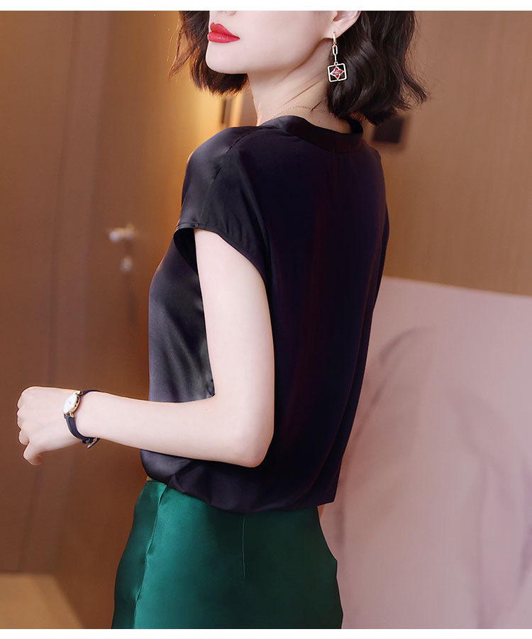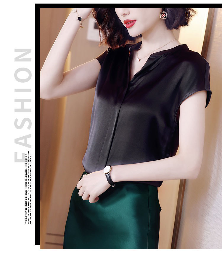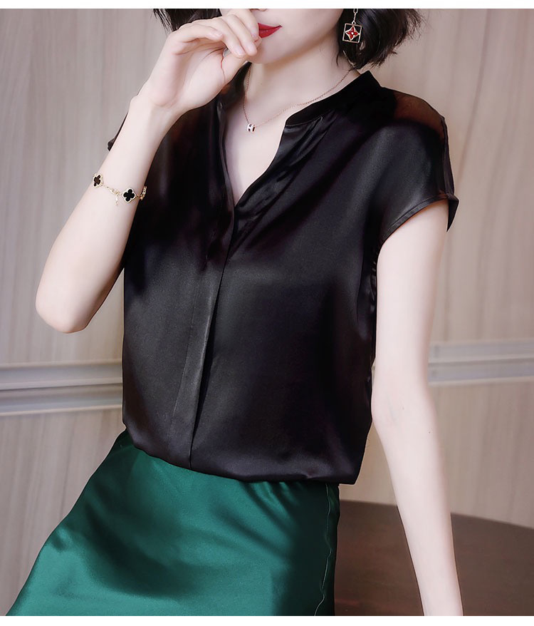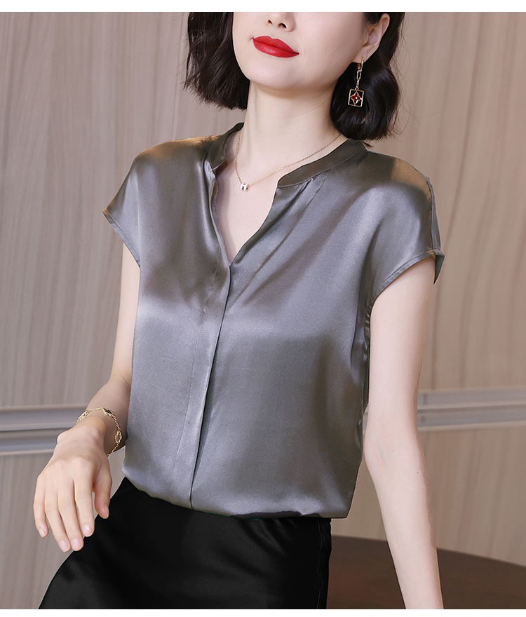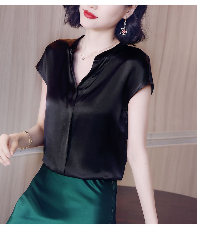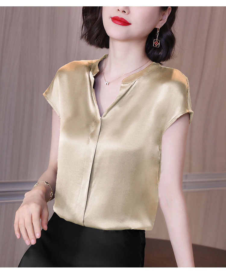여성용 쉬폰 셔츠, 반팔 디자인, 여성용 니치 브이넥 드레이프 새틴 셔츠, 여성용 여름 얇은 루즈 탑스토어 가기