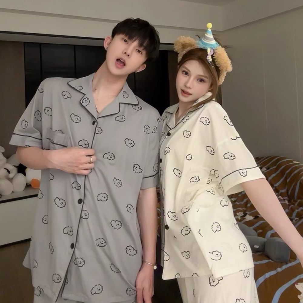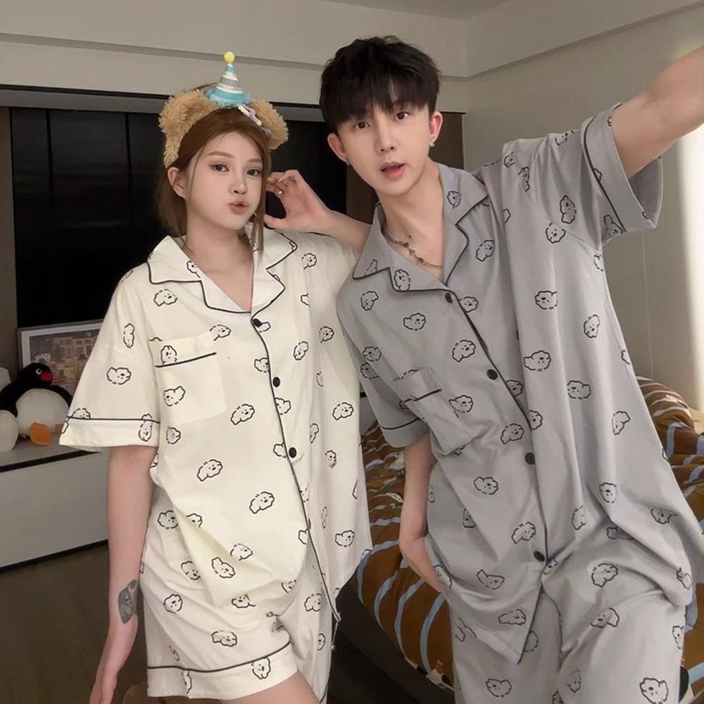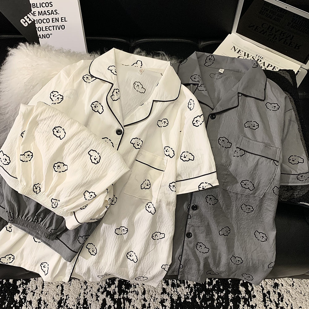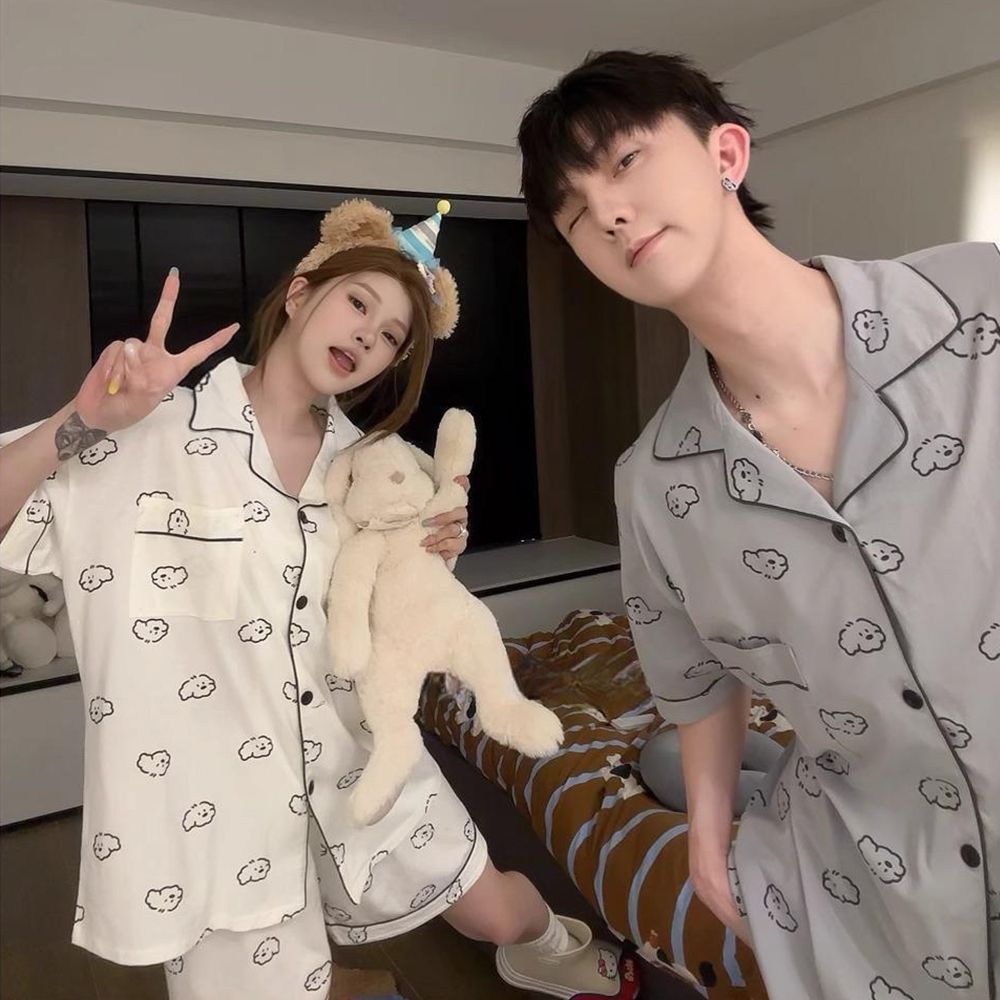 여성을위한 한국어 스타일 귀여운 만화 강아지 커플 잠옷 여름 순수 코튼 반팔 반바지 남성 캐주얼 홈웨어 세트