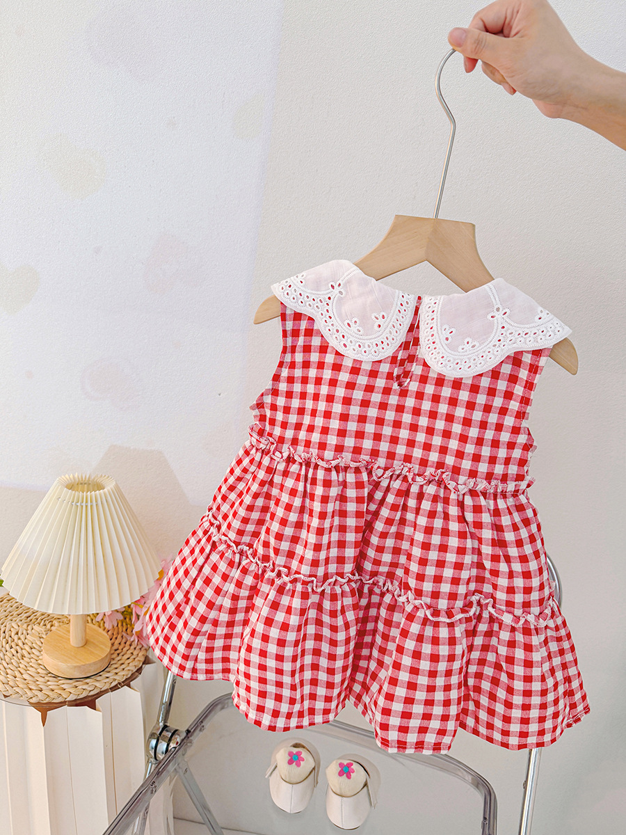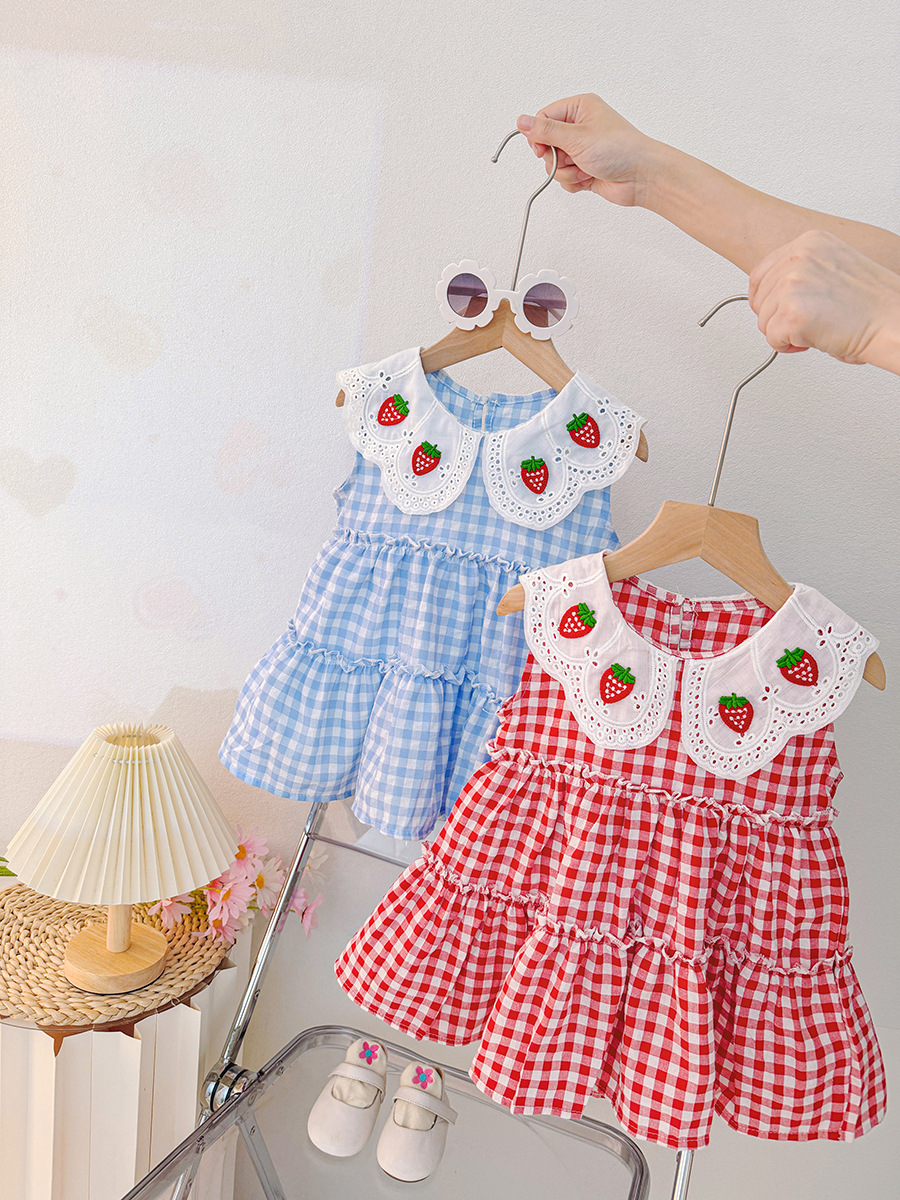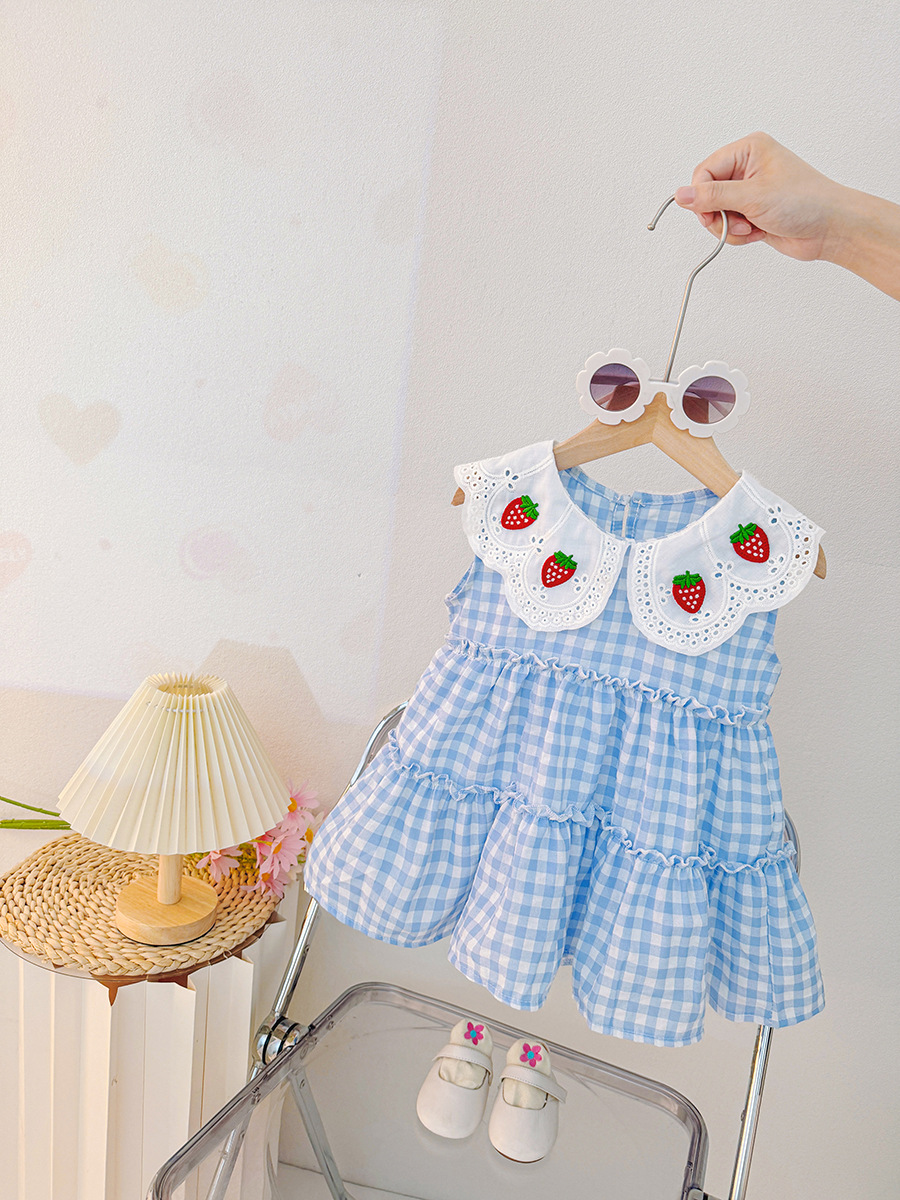 한국 스타일 원피스 2025 여자 아기 소녀 봄 가을 여름 원피스 공주 원피스 스타일 민소매 격자 인형 칼라 원피스스토어 가기
