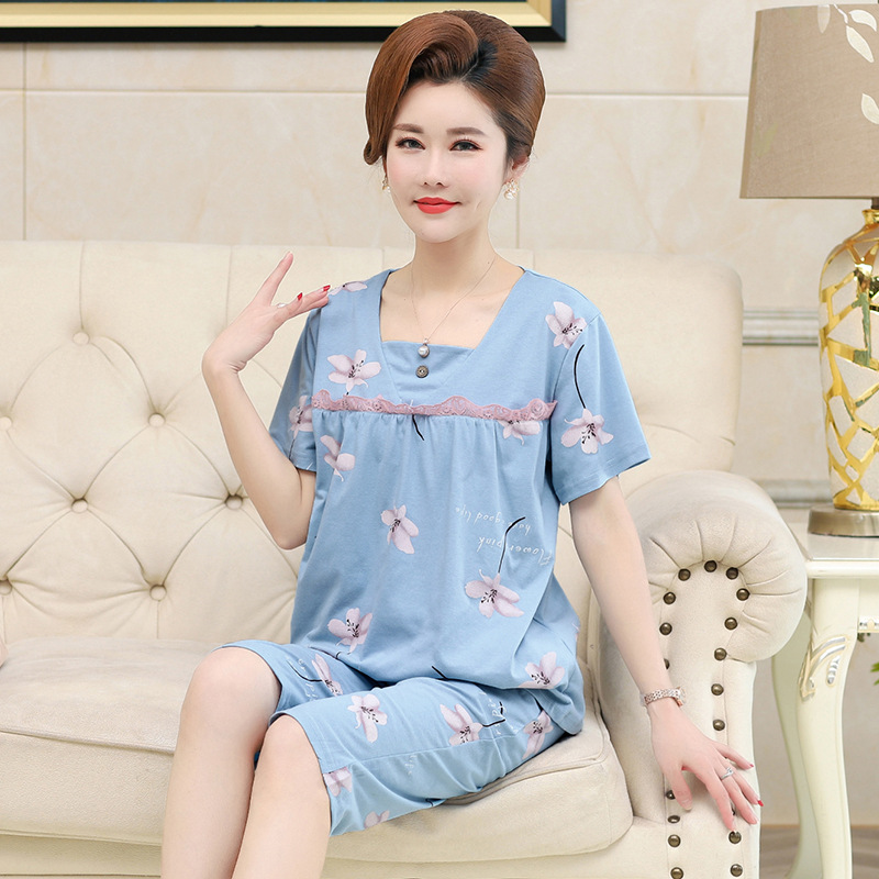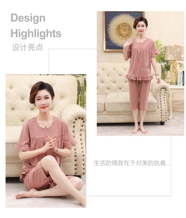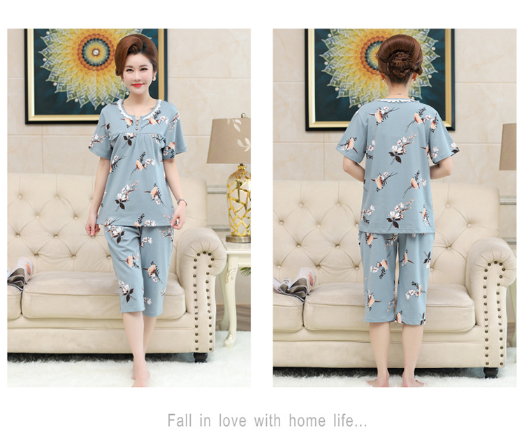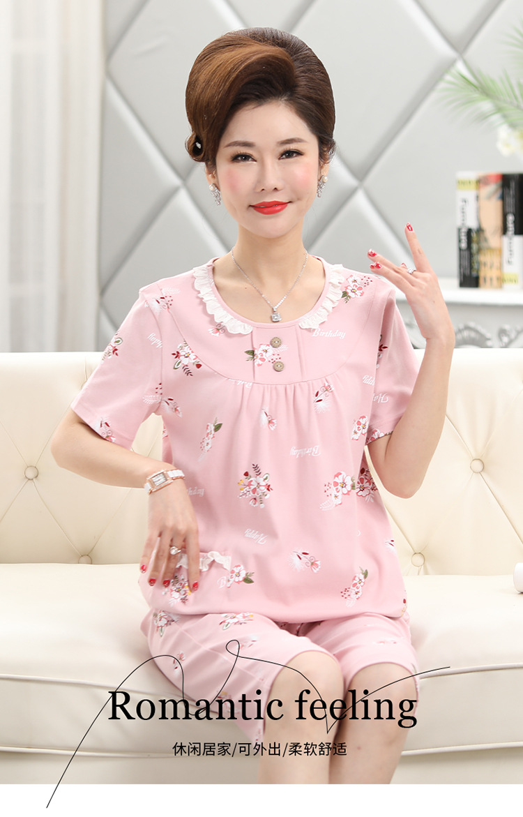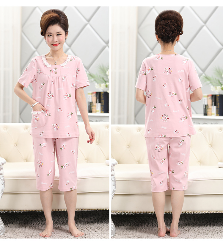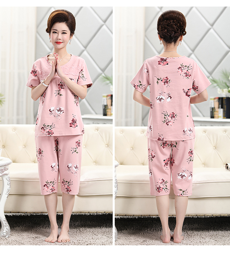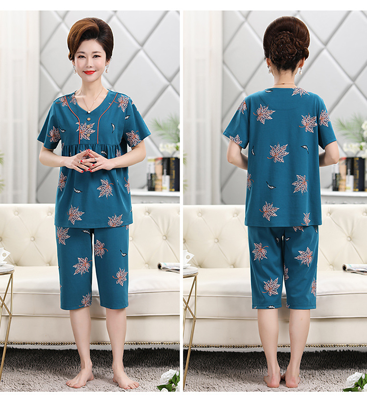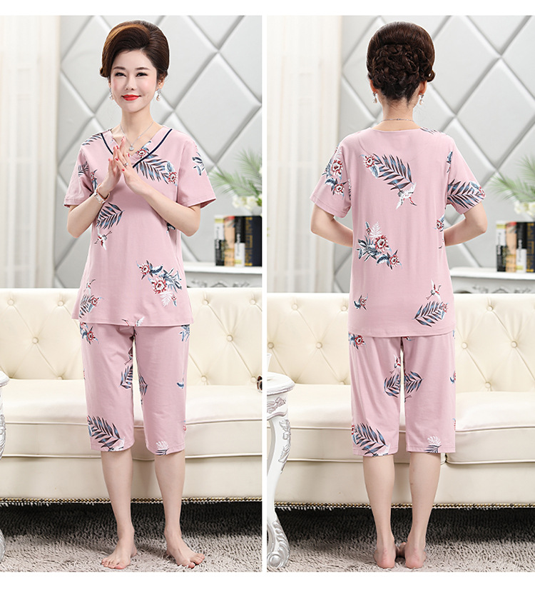 2025년 여름 신제품 중노년 어머니 면 잠옷 여성 반팔 크롭 팬츠 대형 홈웨어 투피스 세트 크로스보더스토어 가기