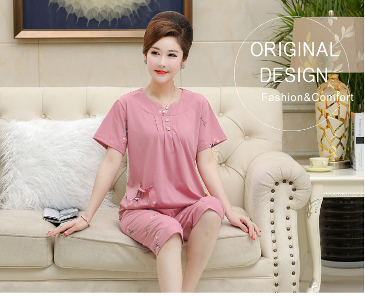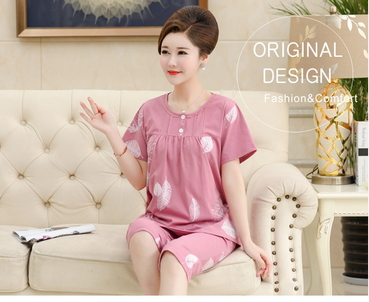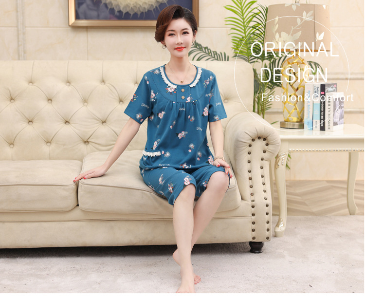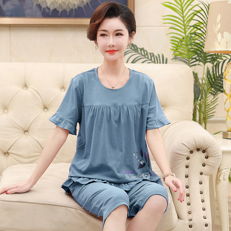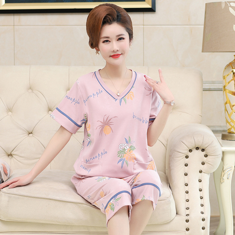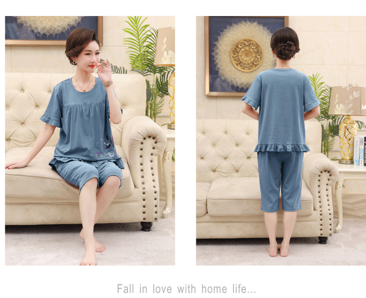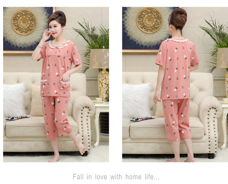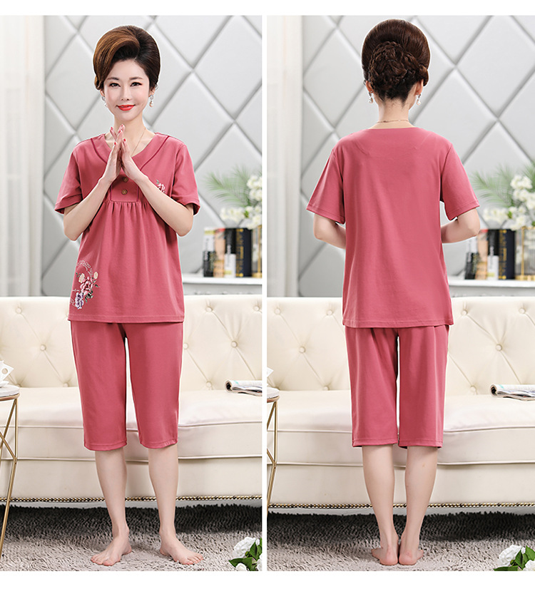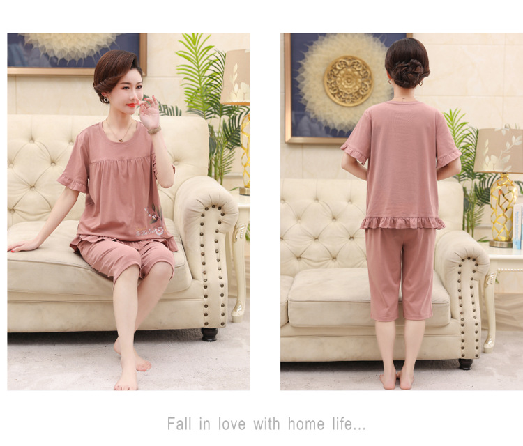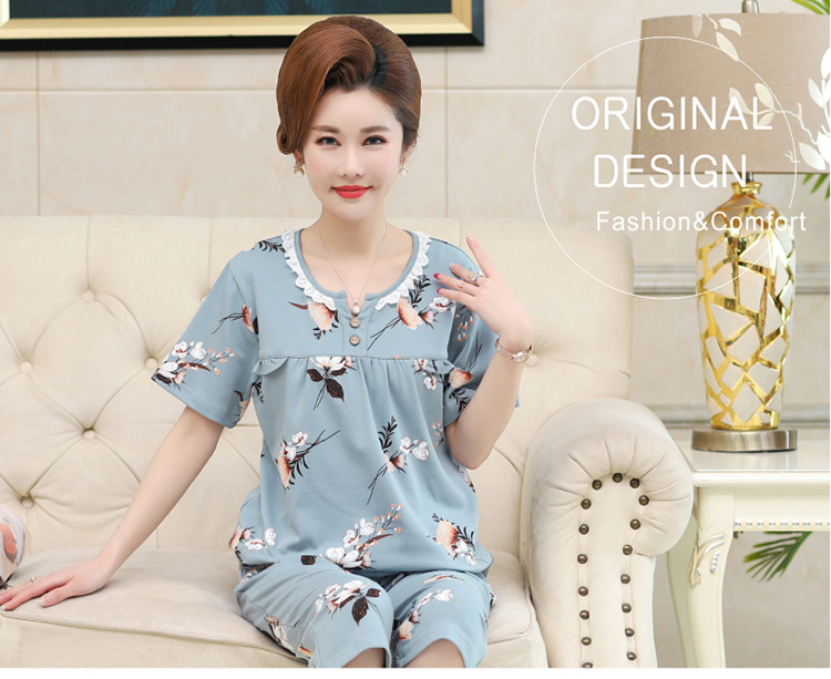 2025년 여름 신제품 중노년 어머니 면 잠옷 여성 반팔 크롭 팬츠 대형 홈웨어 투피스 세트 크로스보더스토어 가기