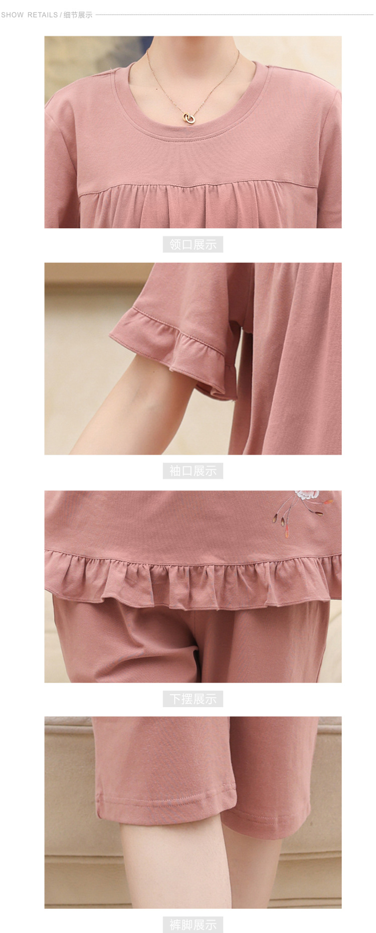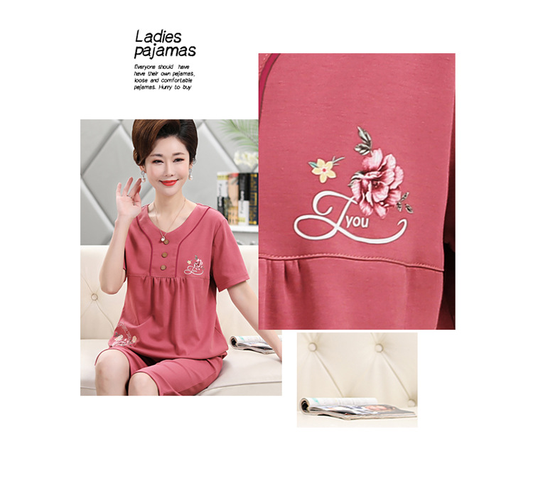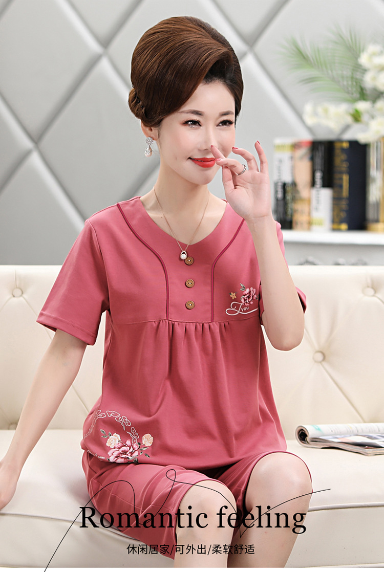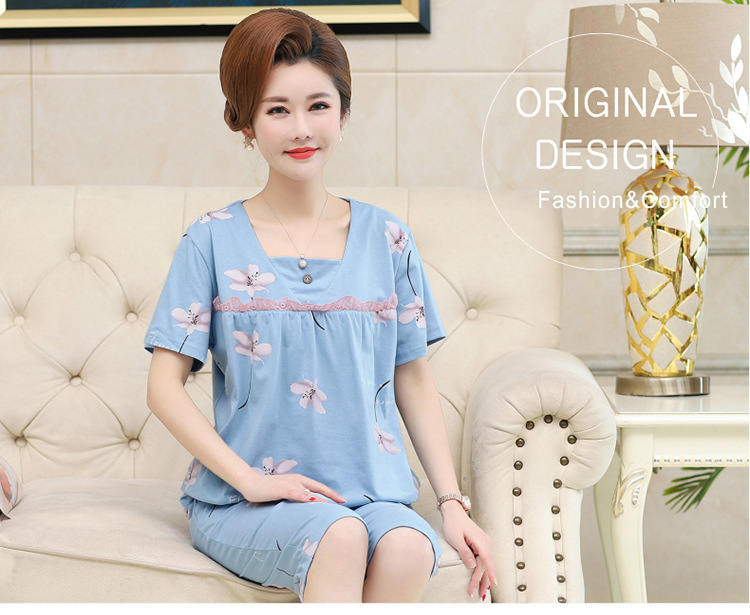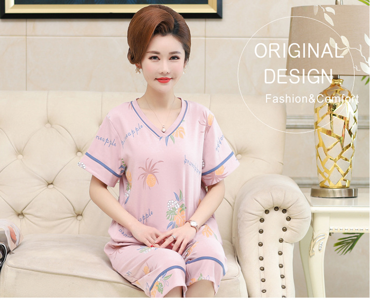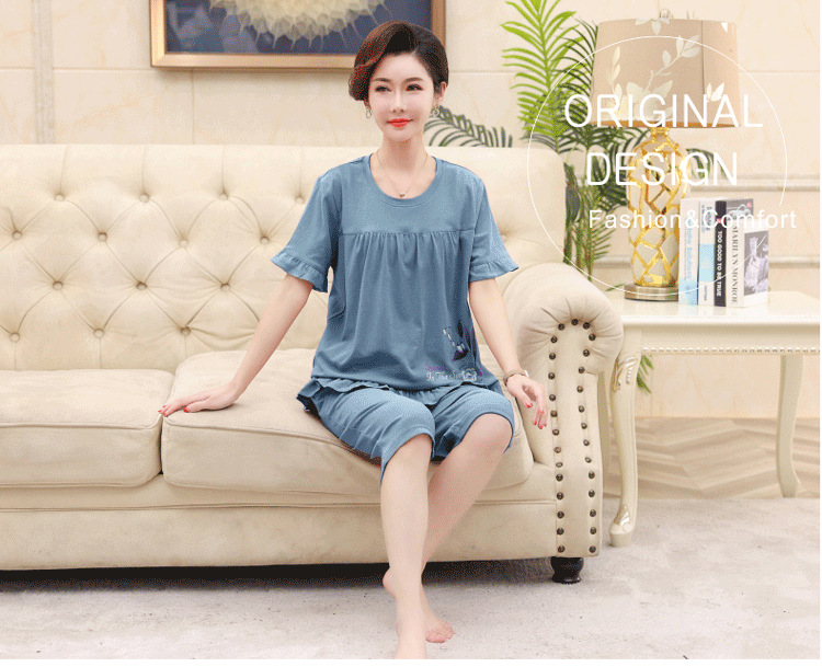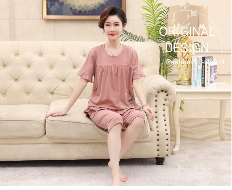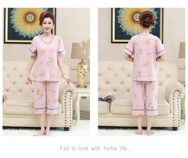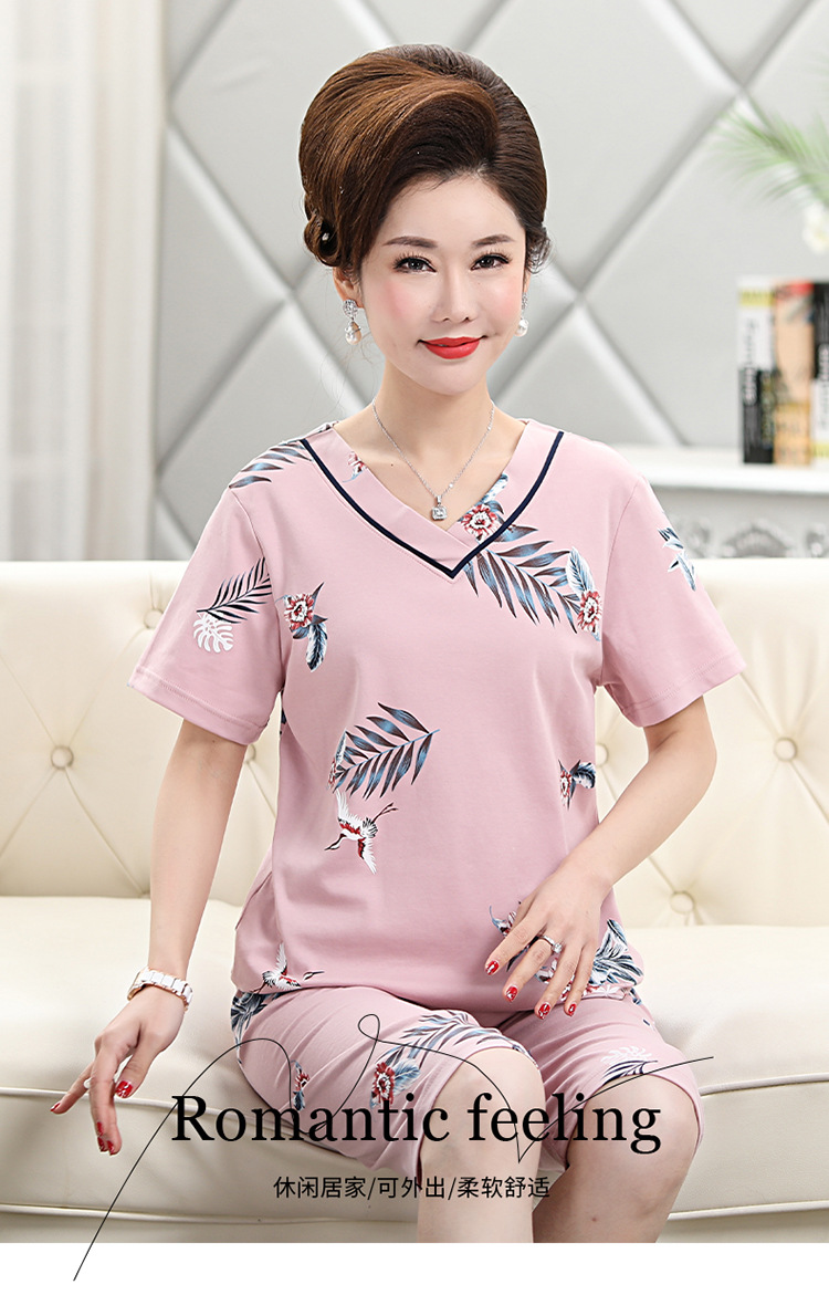 2025년 여름 신제품 중노년 어머니 면 잠옷 여성 반팔 크롭 팬츠 대형 홈웨어 투피스 세트 크로스보더스토어 가기