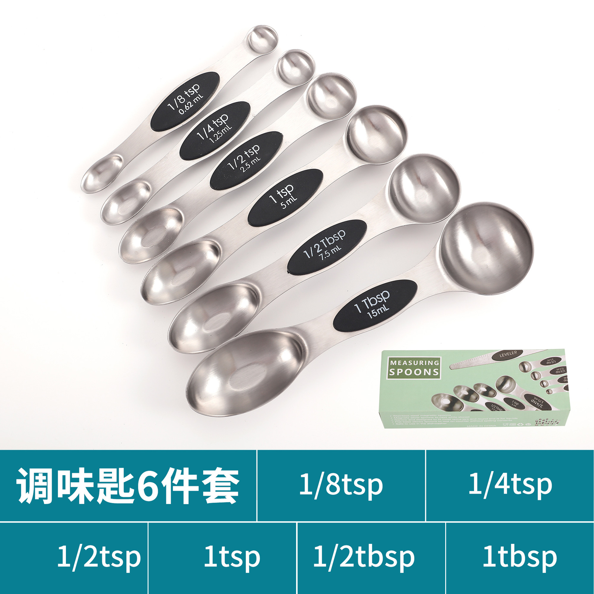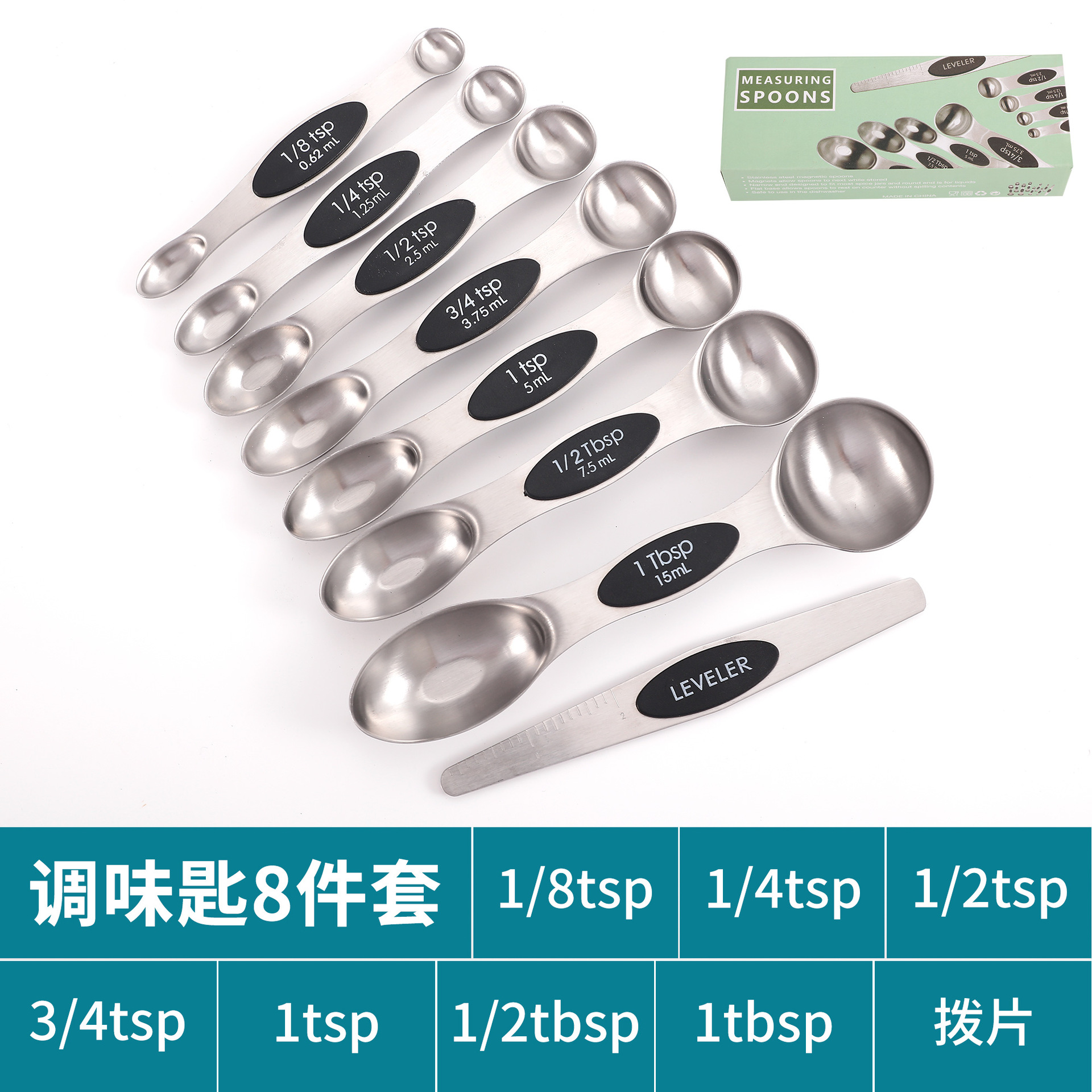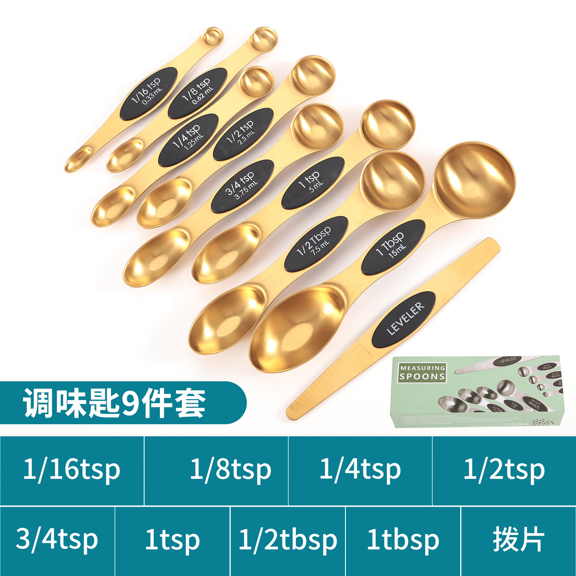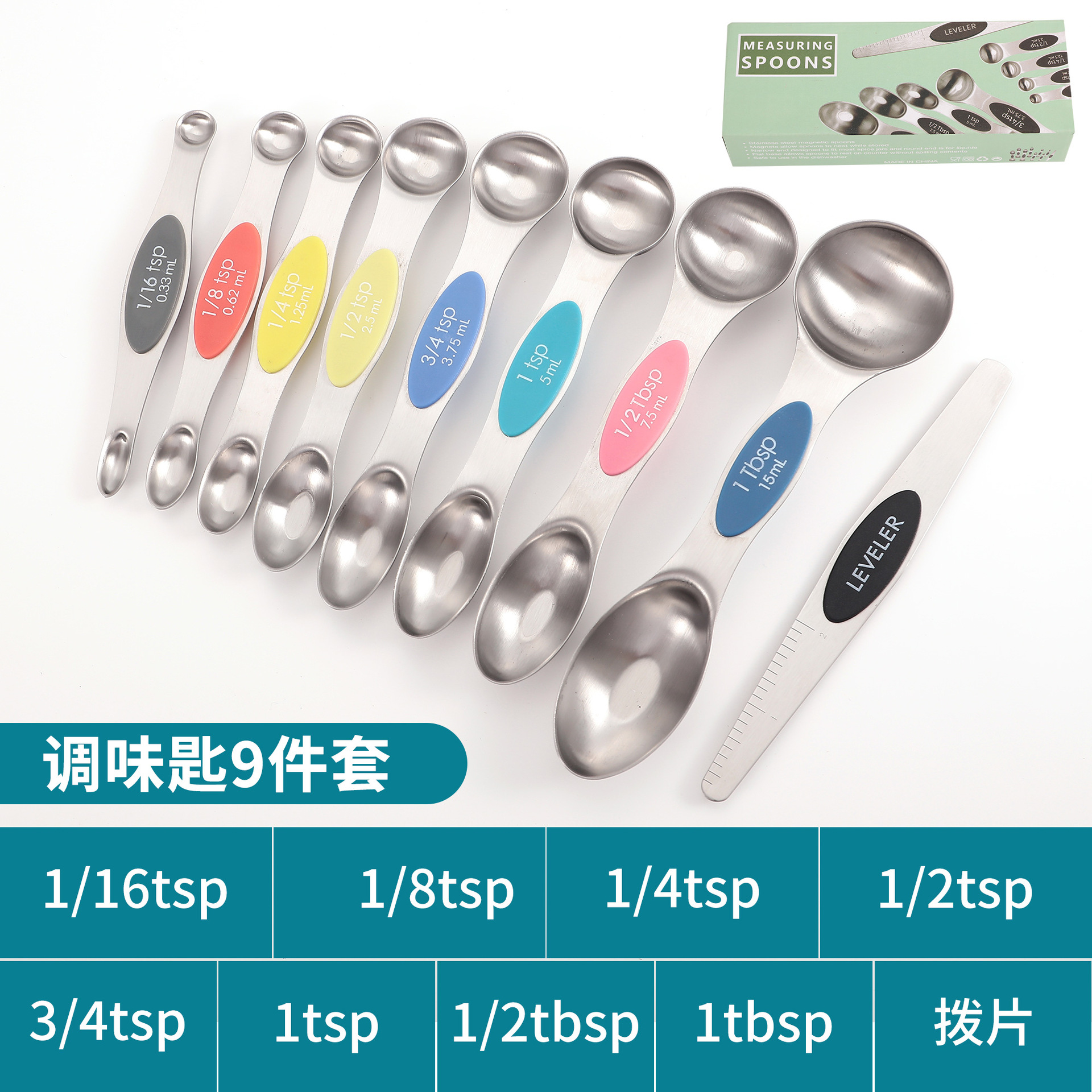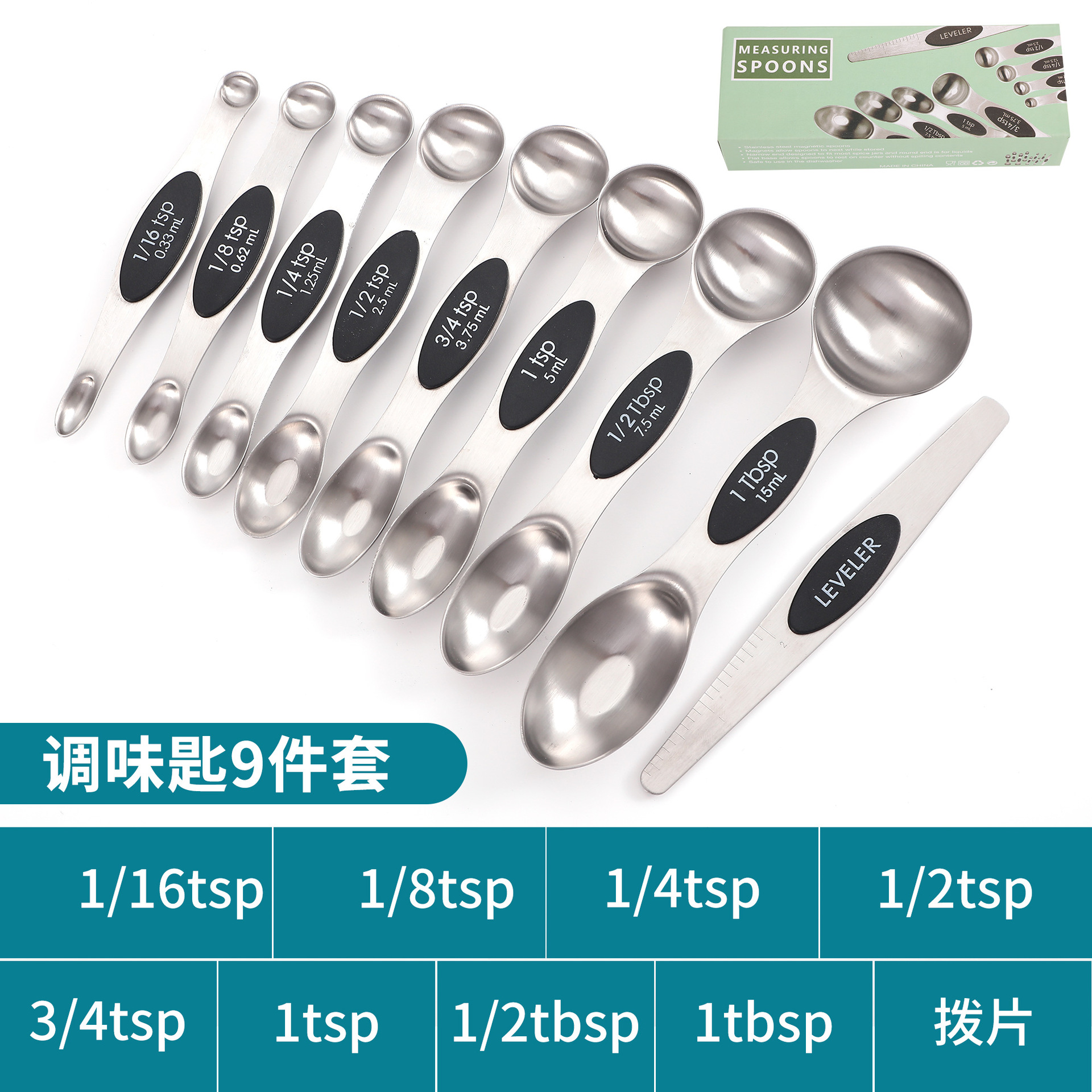 공장 재고 마그네틱 더블 헤드 측정 스푼 9 피스 세트 아마존 스테인레스 스틸 베이킹 가정용 주방 측정 조미료 스푼스토어 가기