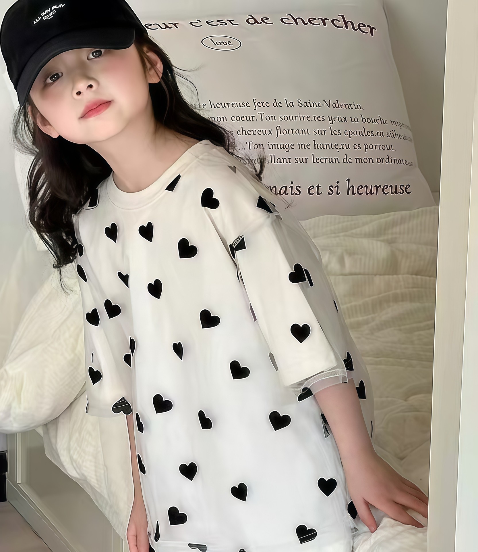 여자 여름 반팔 티셔츠 2025 새로운 여름 사랑 메쉬 톱 어린이 소녀 느슨한 달콤한 티셔츠