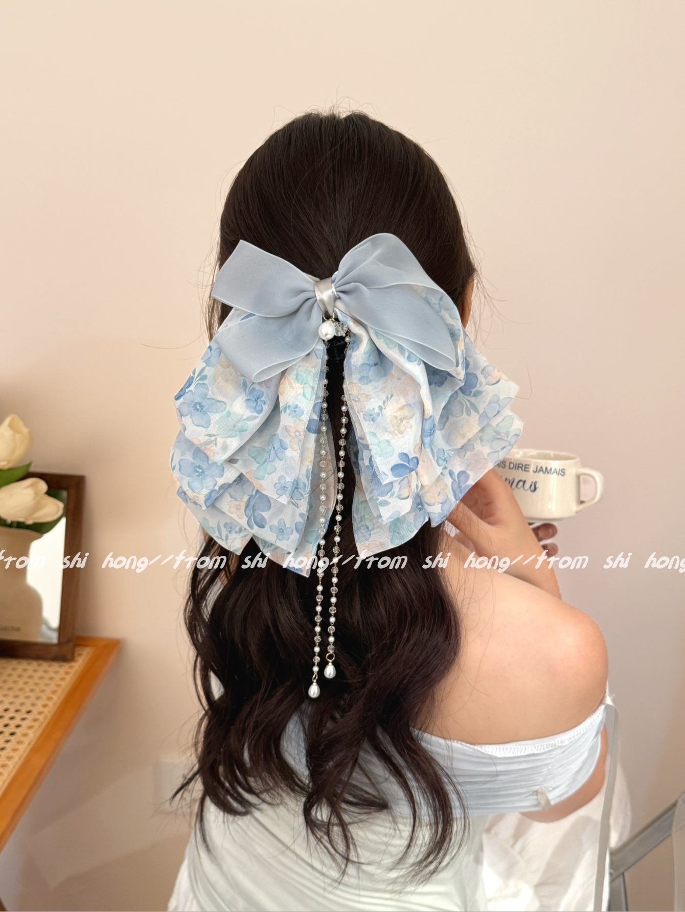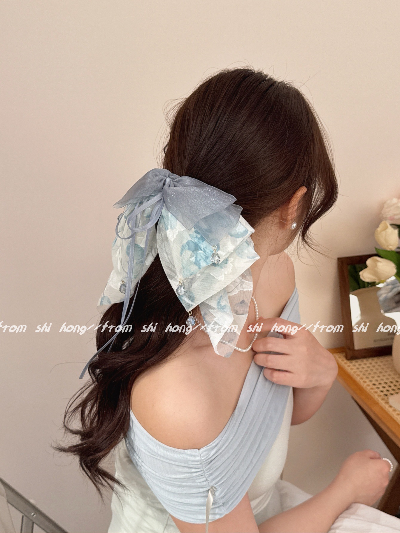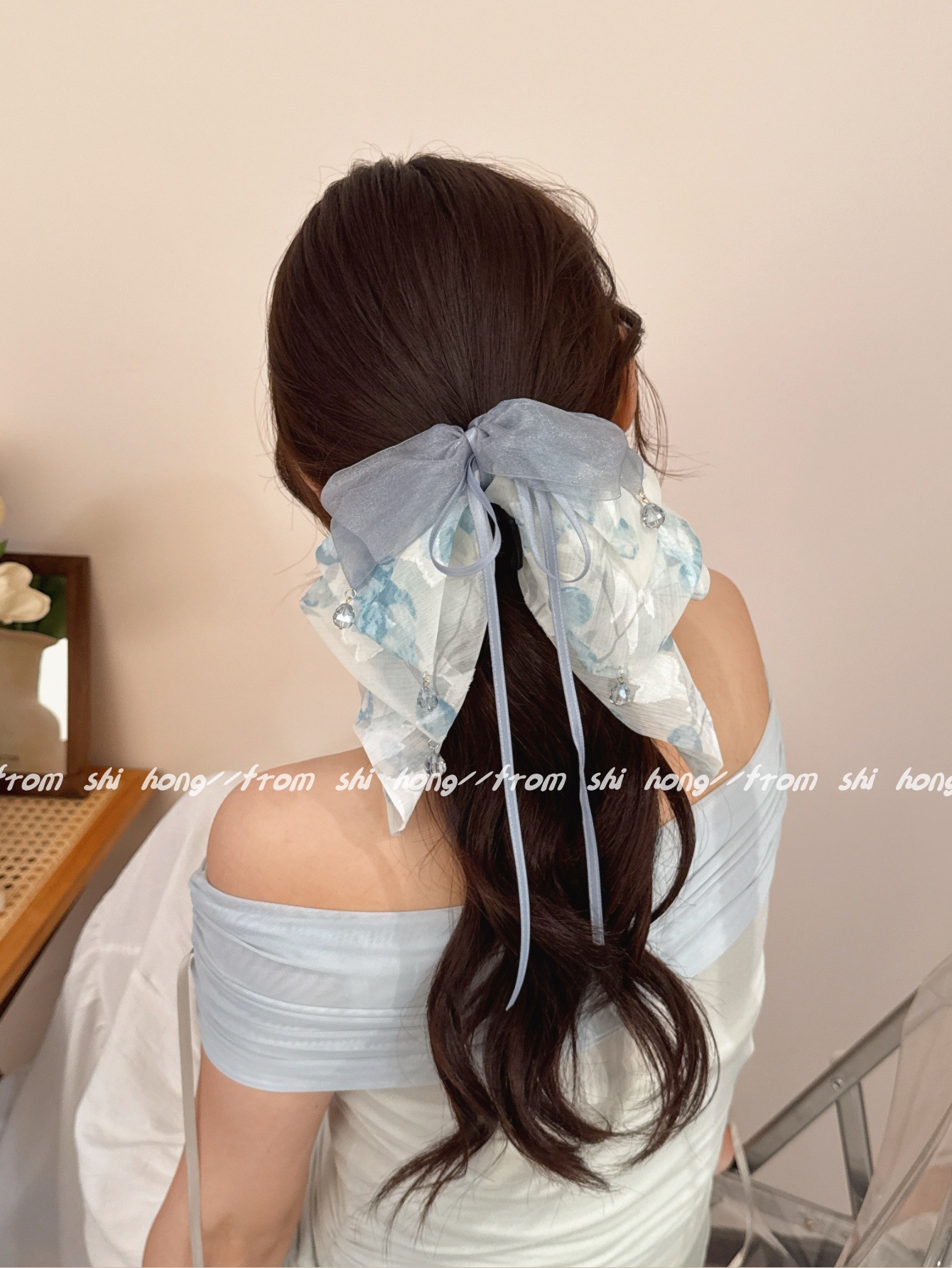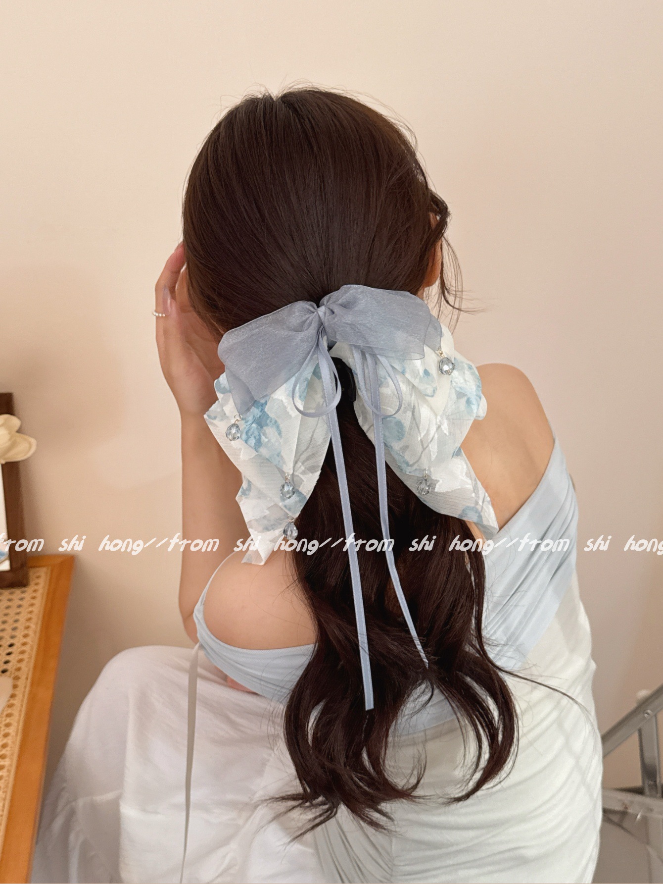 바다 소금 블루 리본 활 포니 테일 그립 클립 여성의 새로운 크리스탈 장식 높은 두개골 탑 패션 헤어 그립 상어 클립스토어 가기