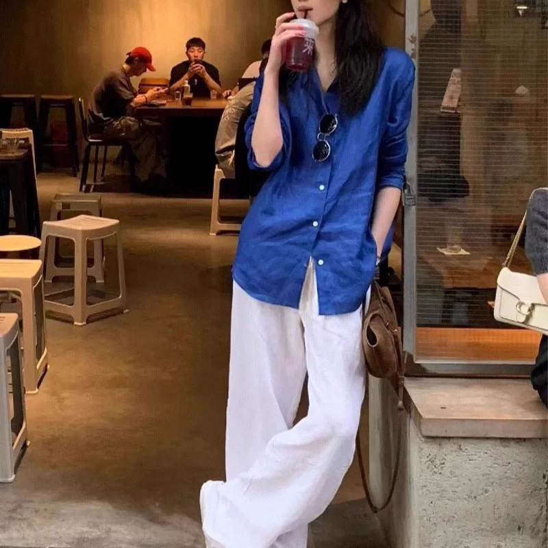 Lao Qian Feng Linen 세트 여성 셔츠 여름 새로운 패션 선 스크린 화이트 코튼 리넨 셔츠 고급 센스 와이드 레그 바지스토어 가기