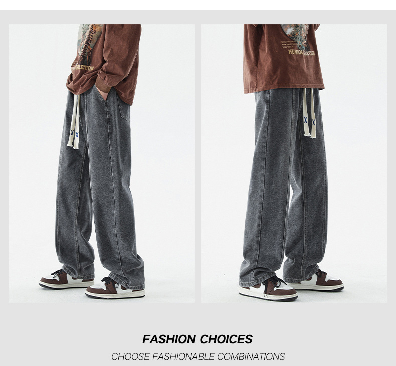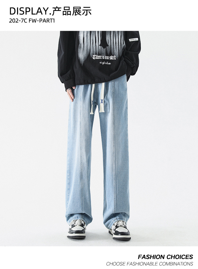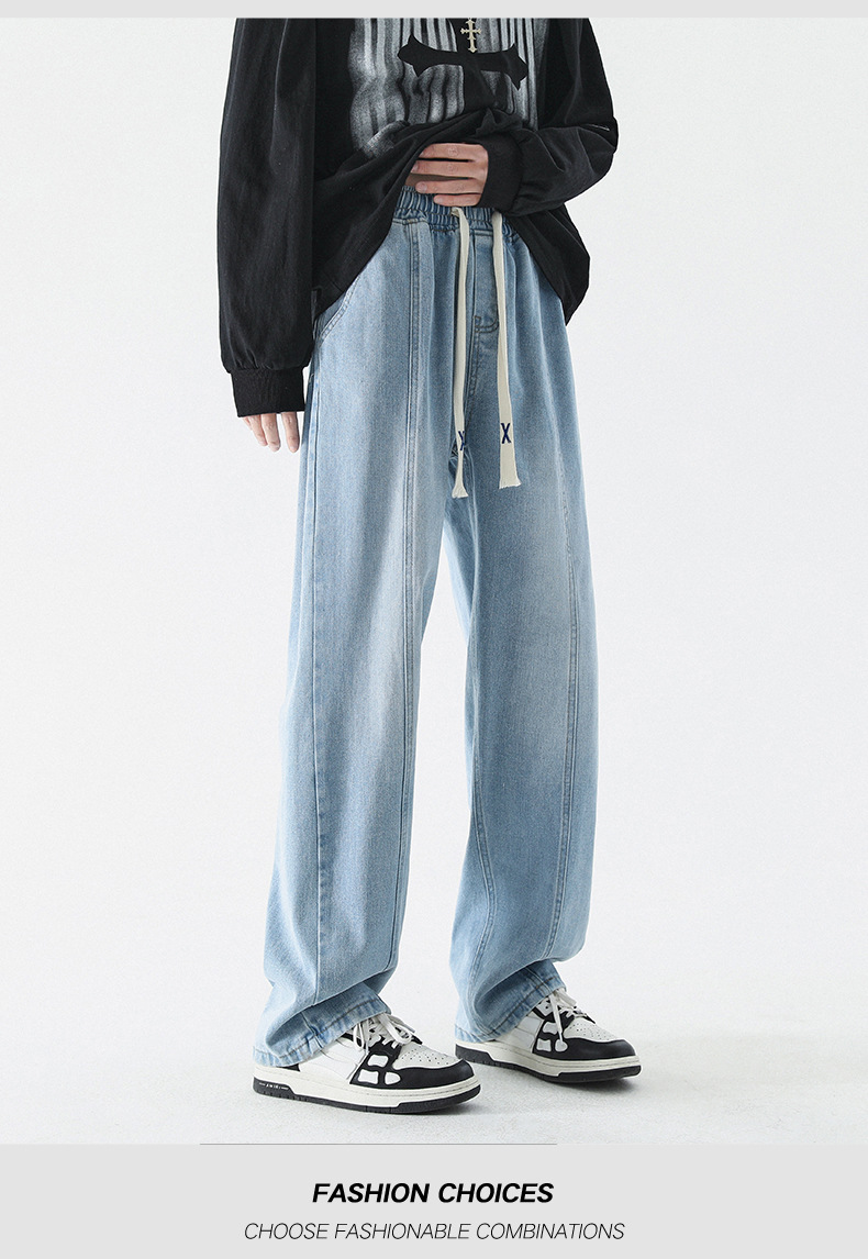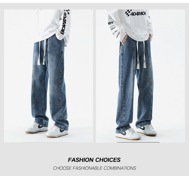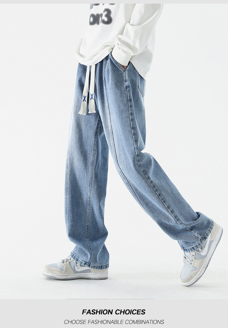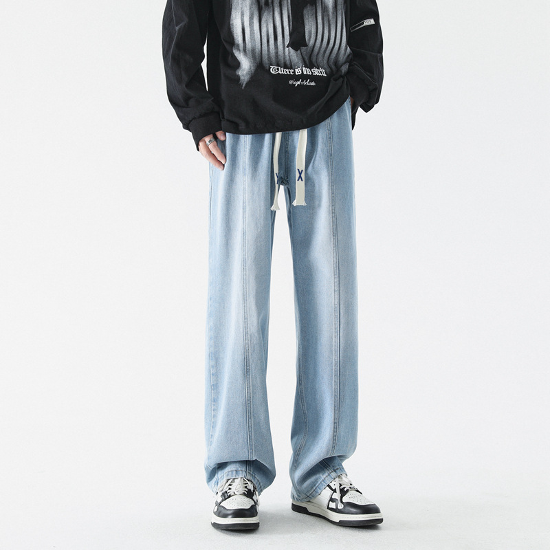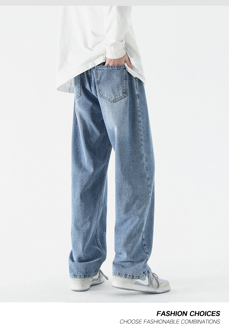 남성 봄, 가을 새로운 루즈 스트레이트 청바지 남성 아메리칸 하이 스트리트 패션 브랜드 남성용 와이드 레그 캐주얼 롱 팬츠스토어 가기