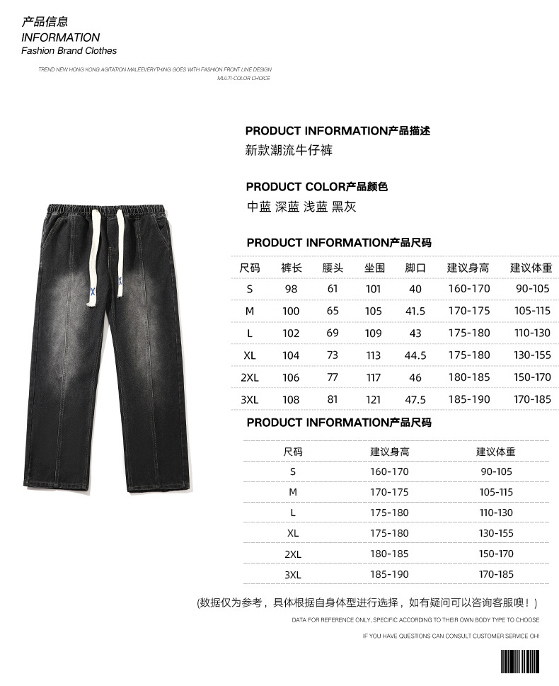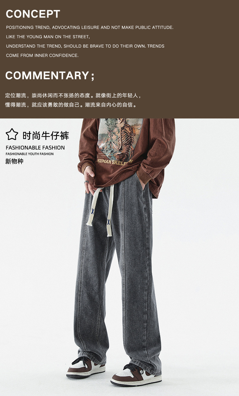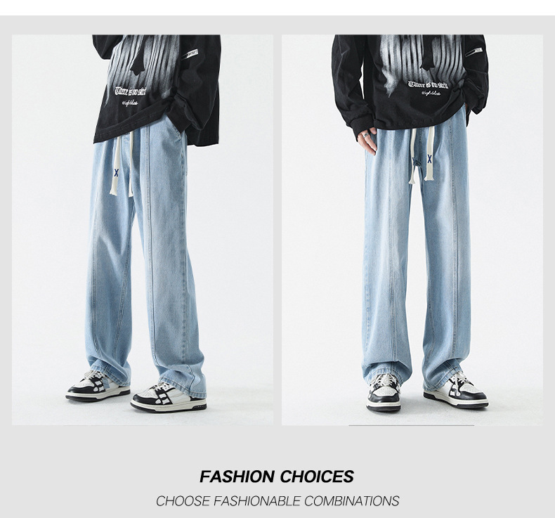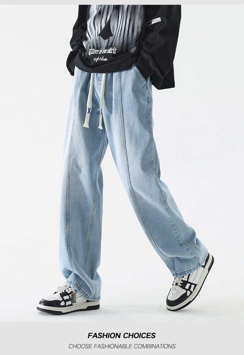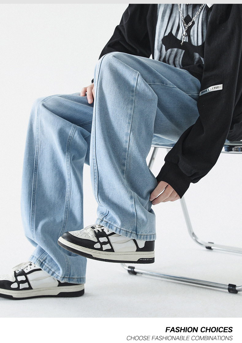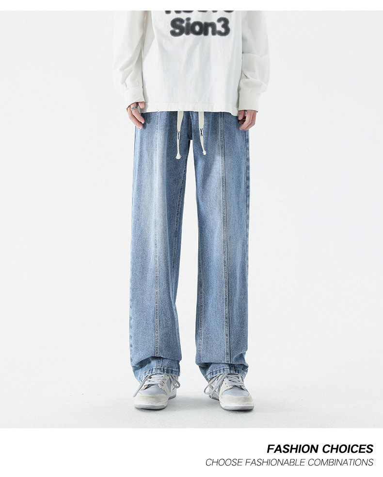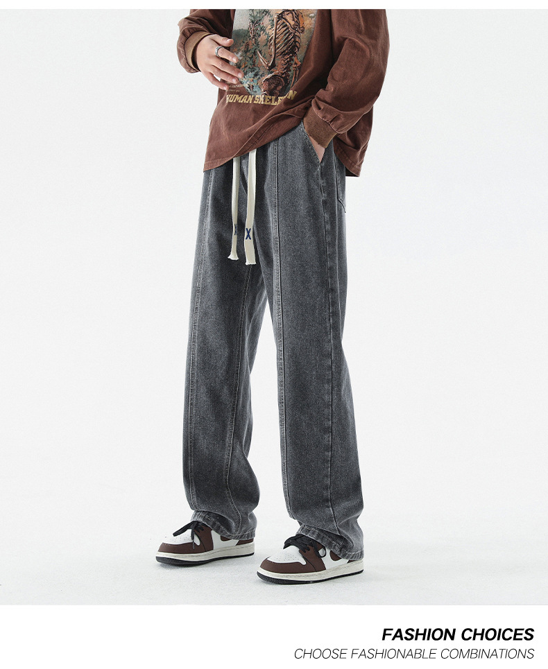남성 봄, 가을 새로운 루즈 스트레이트 청바지 남성 아메리칸 하이 스트리트 패션 브랜드 남성용 와이드 레그 캐주얼 롱 팬츠스토어 가기