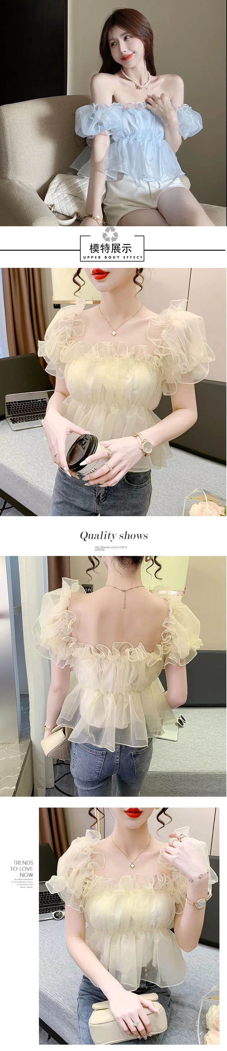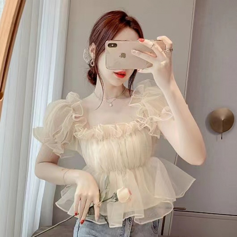러플 원 숄더 탑 2023 뉴 여름 스위트 슈퍼 요정 푹신한 오프 숄더 슬림 퍼프 슬리브 쉬폰 셔츠스토어 가기