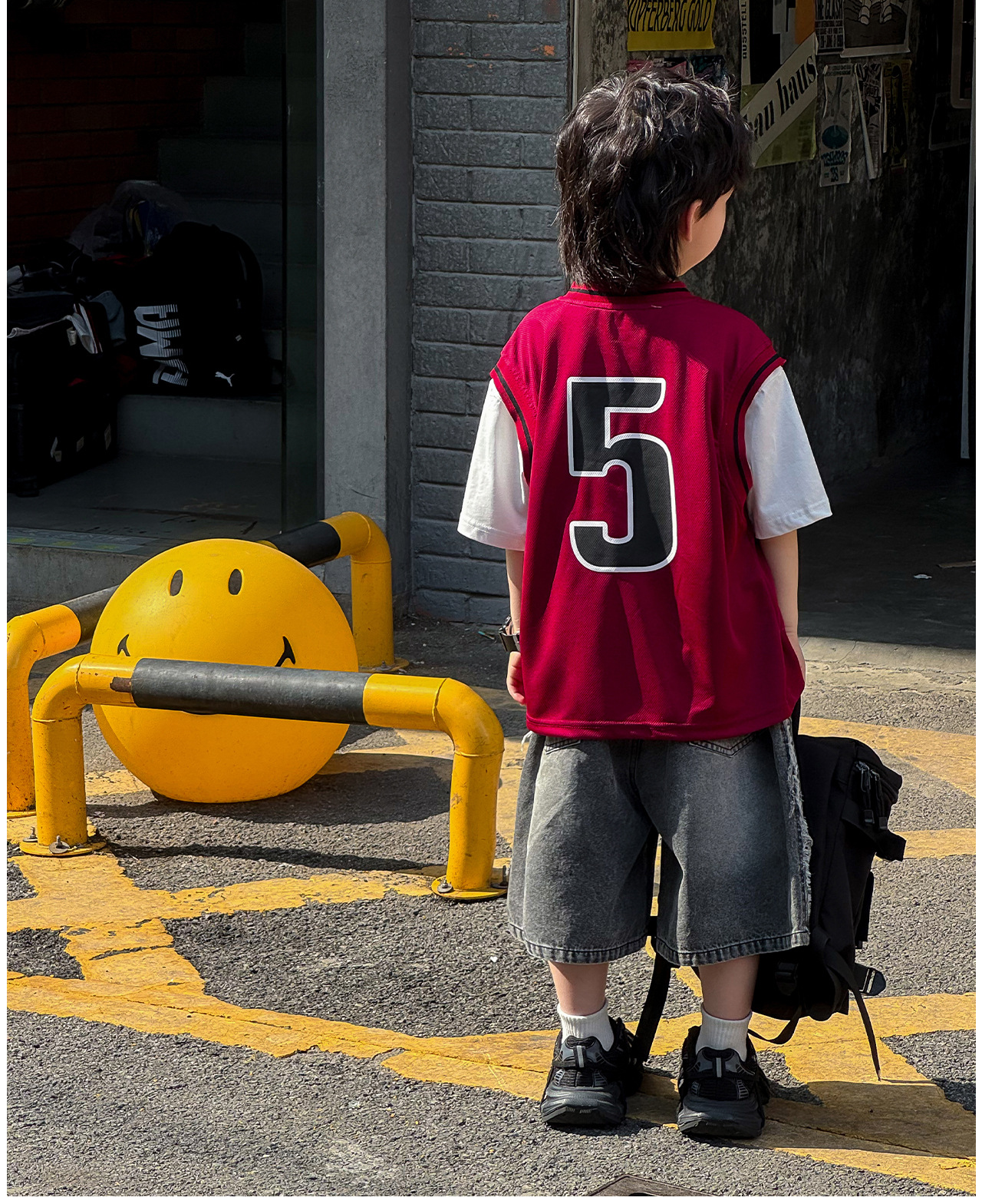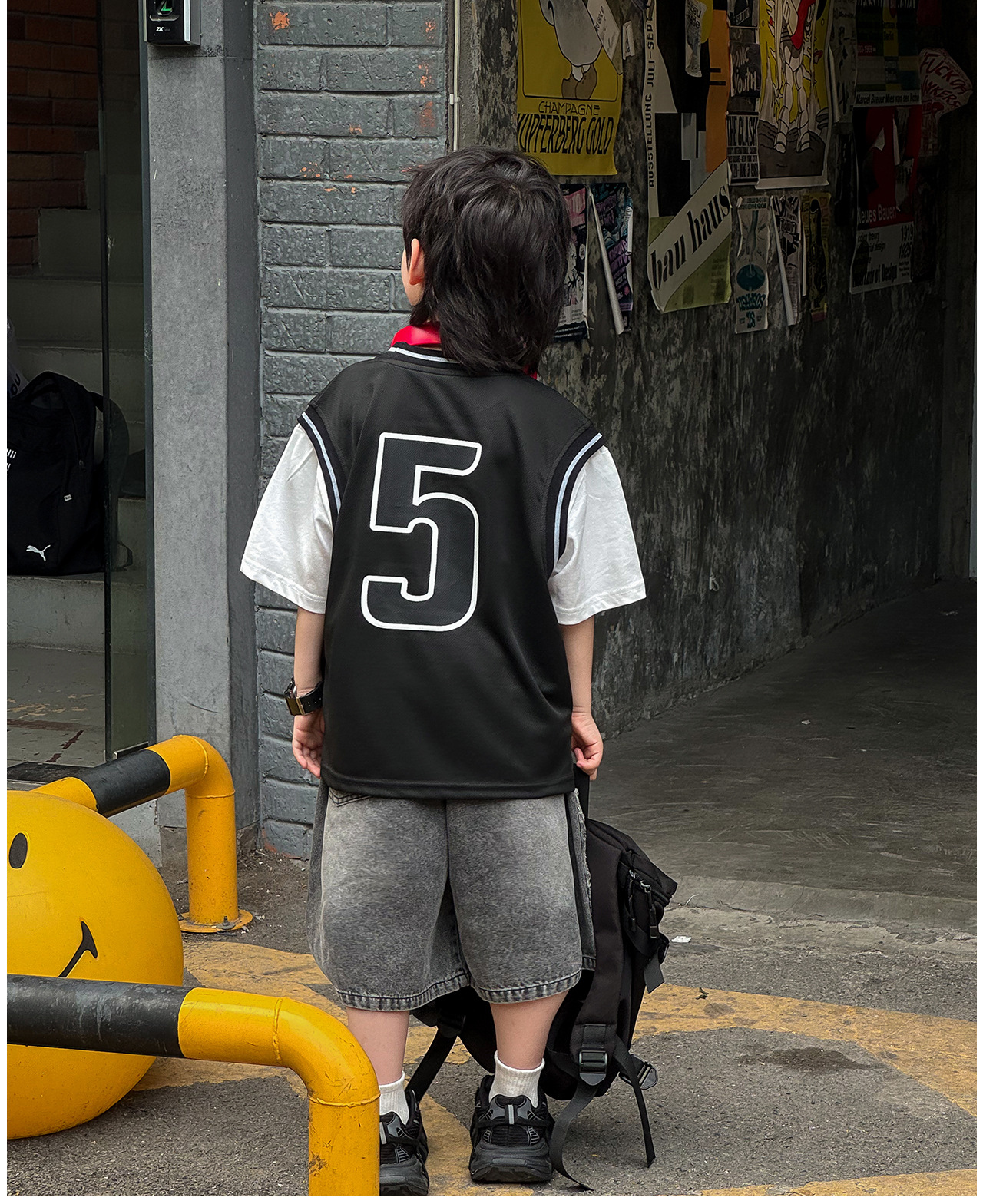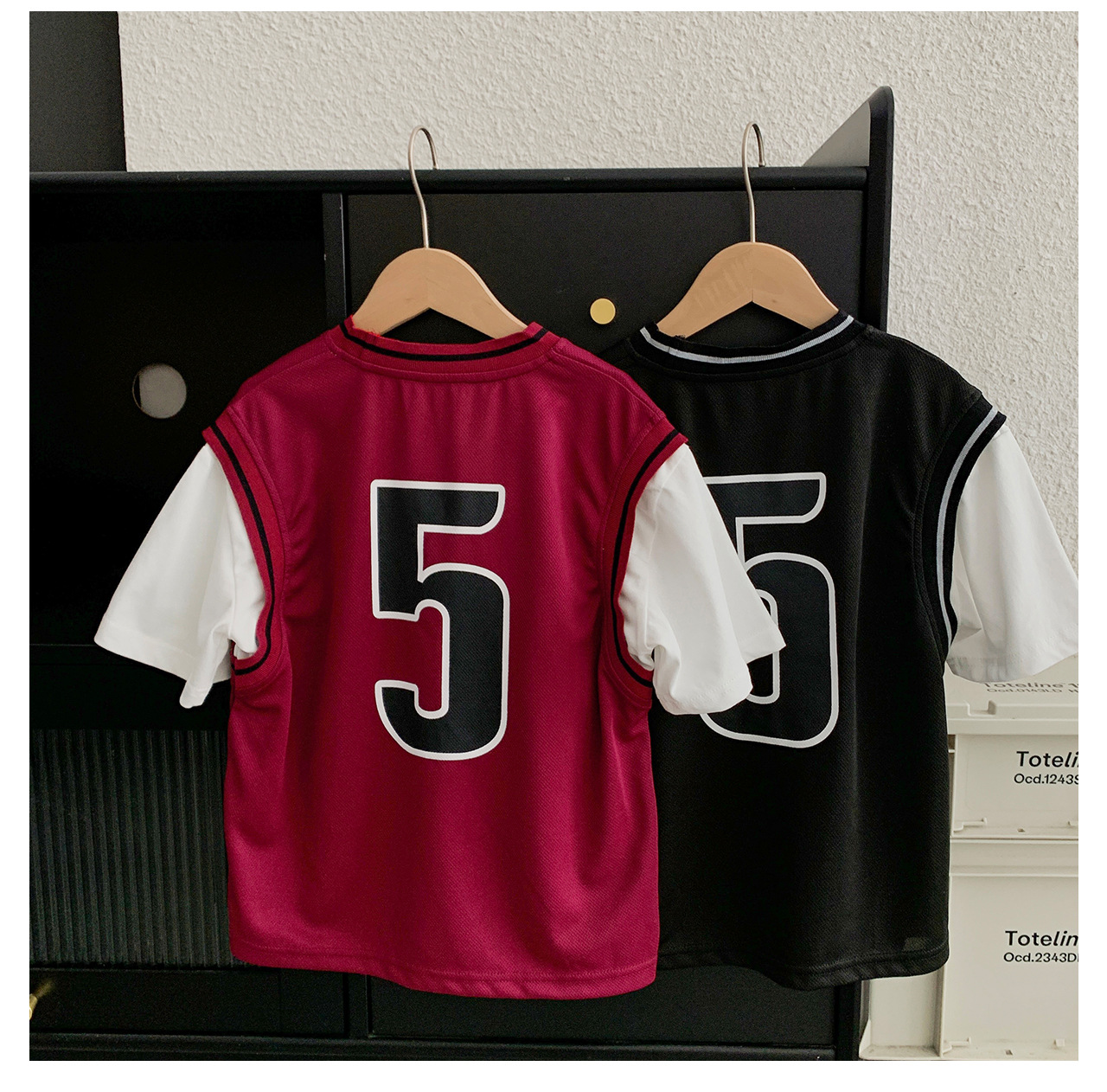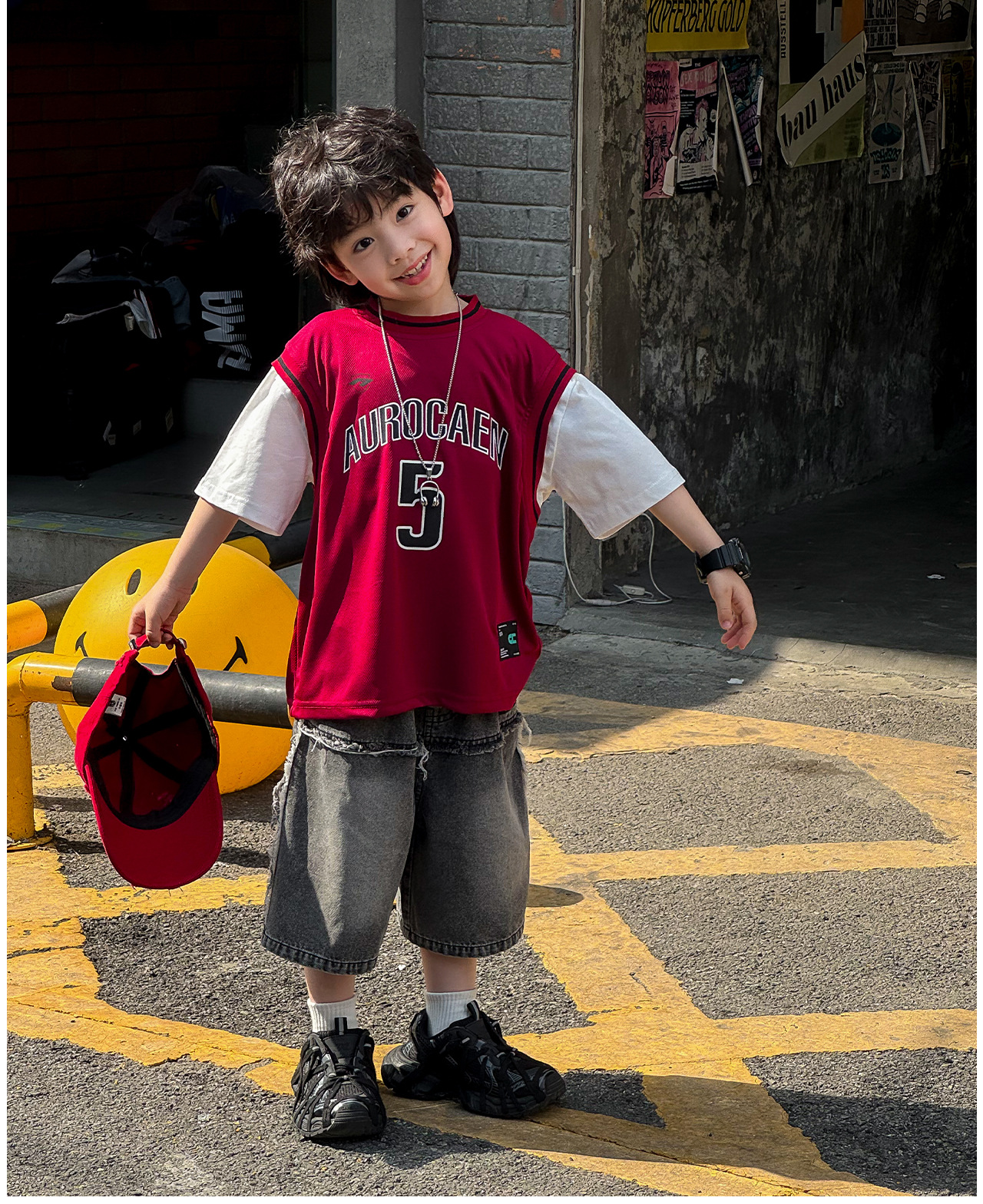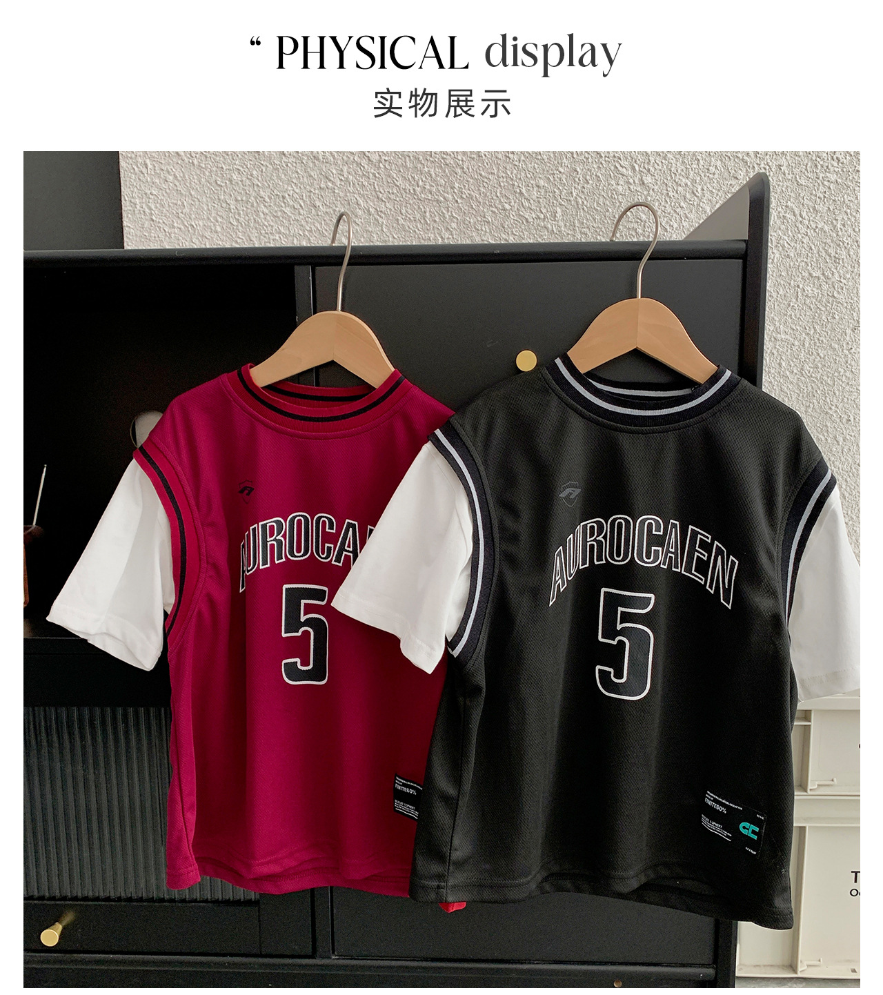[여름 정리 세일] 2025 아동복 미국 문자 가짜 투피스 소년 농구 유니폼 아동용 반팔 티셔츠