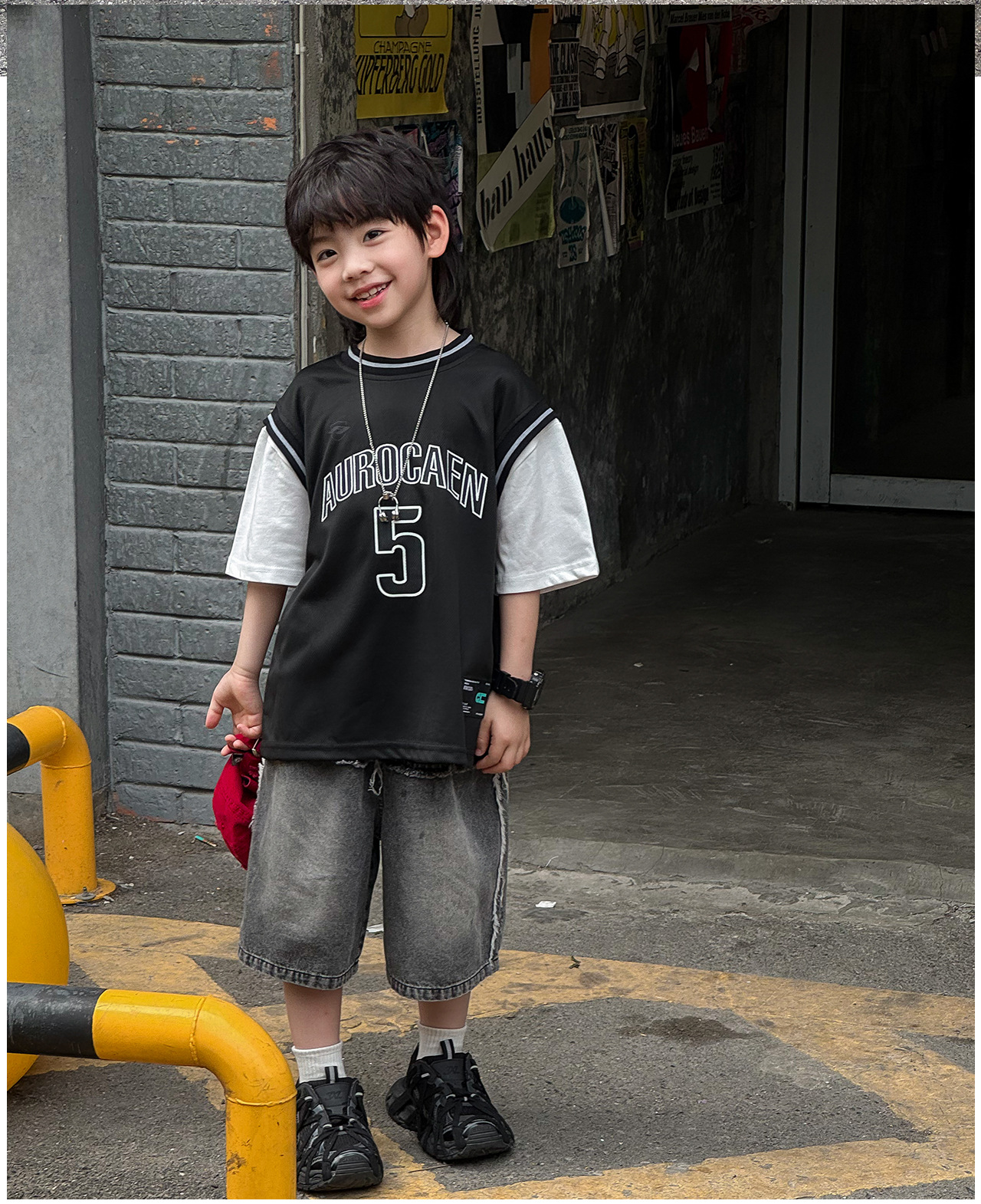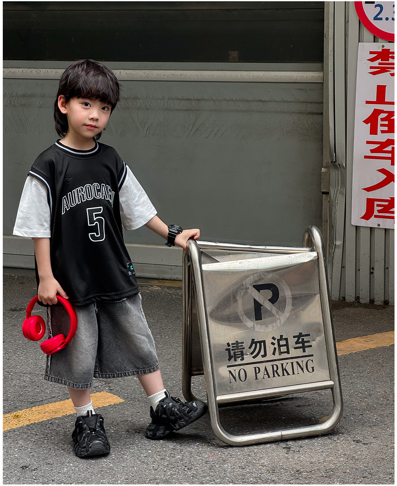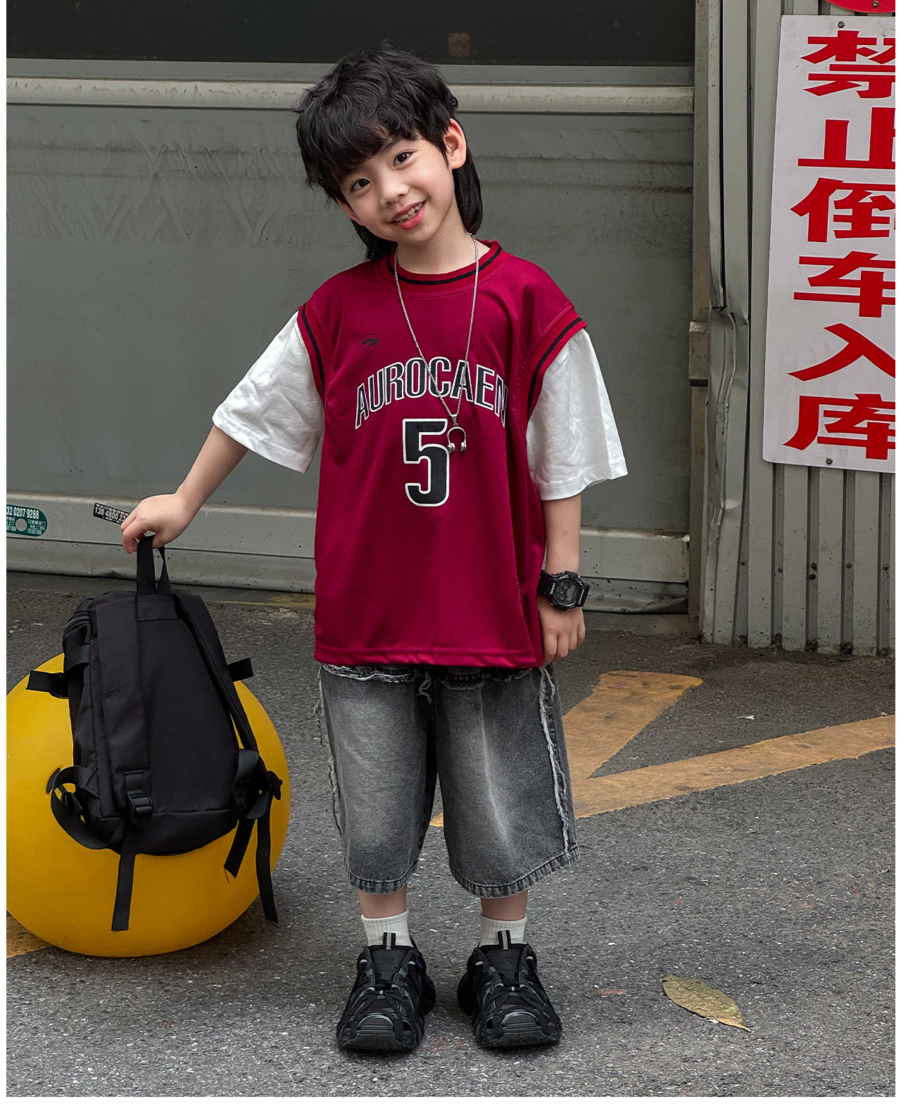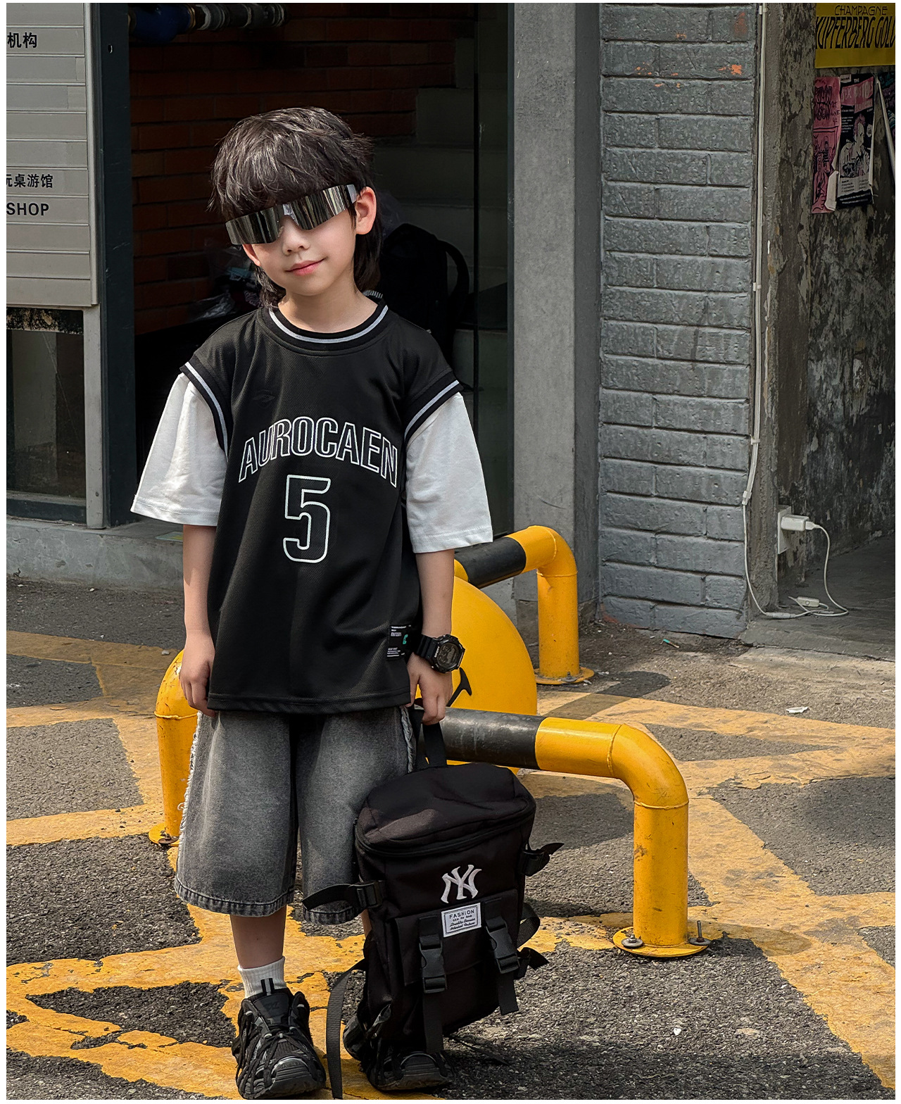 [여름 정리 세일] 2025 아동복 미국 문자 가짜 투피스 소년 농구 유니폼 아동용 반팔 티셔츠스토어 가기