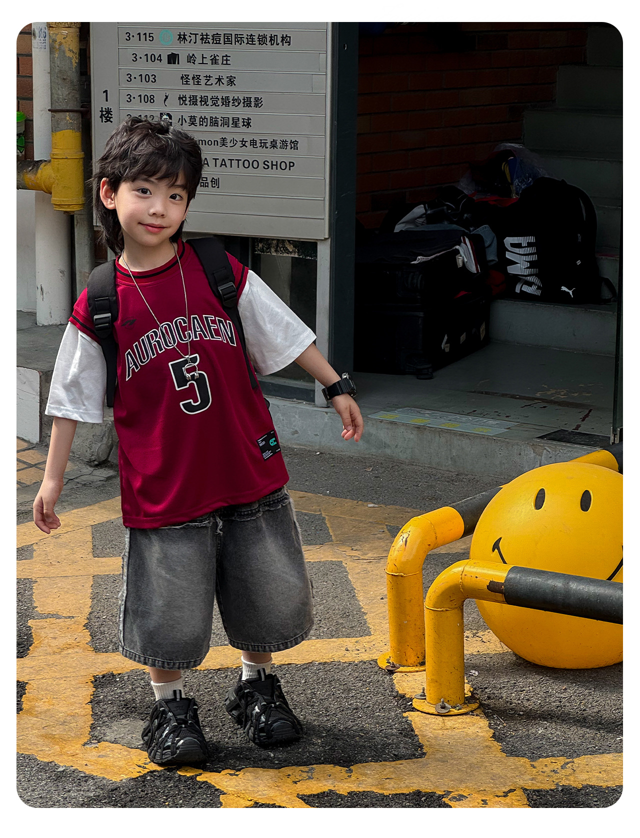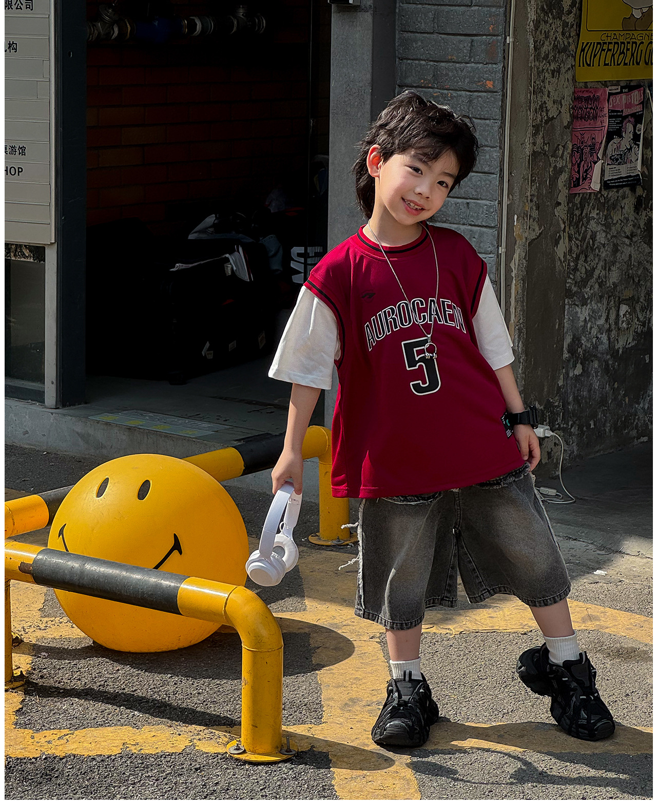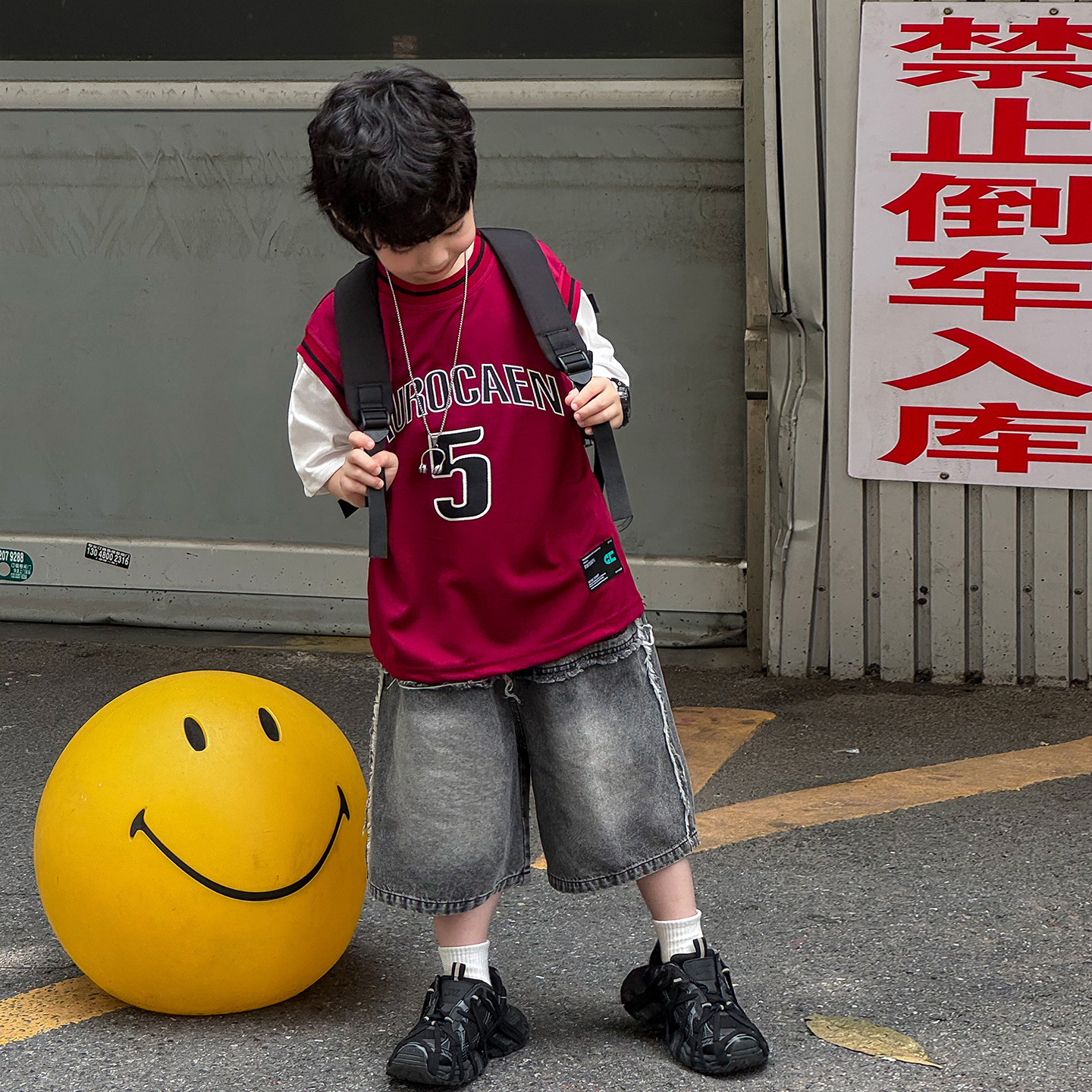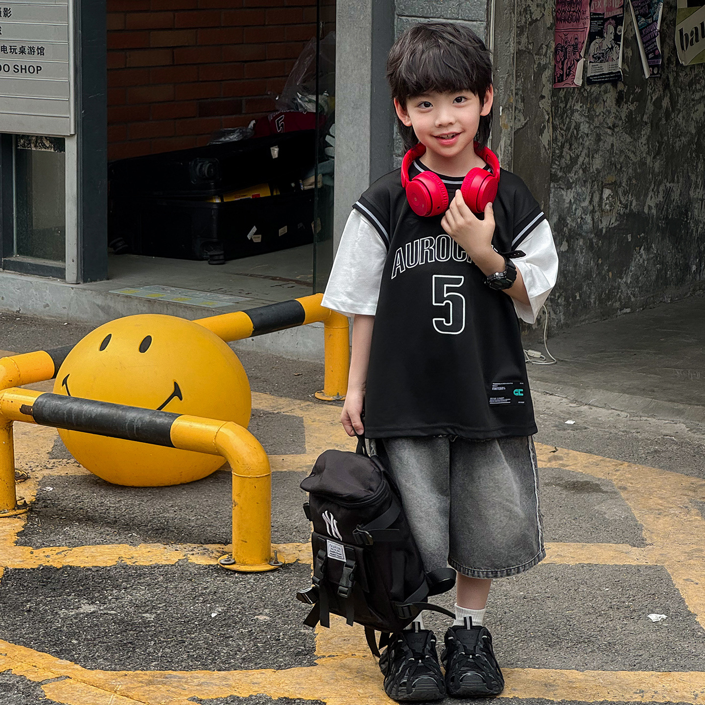 [여름 정리 세일] 2025 아동복 미국 문자 가짜 투피스 소년 농구 유니폼 아동용 반팔 티셔츠스토어 가기