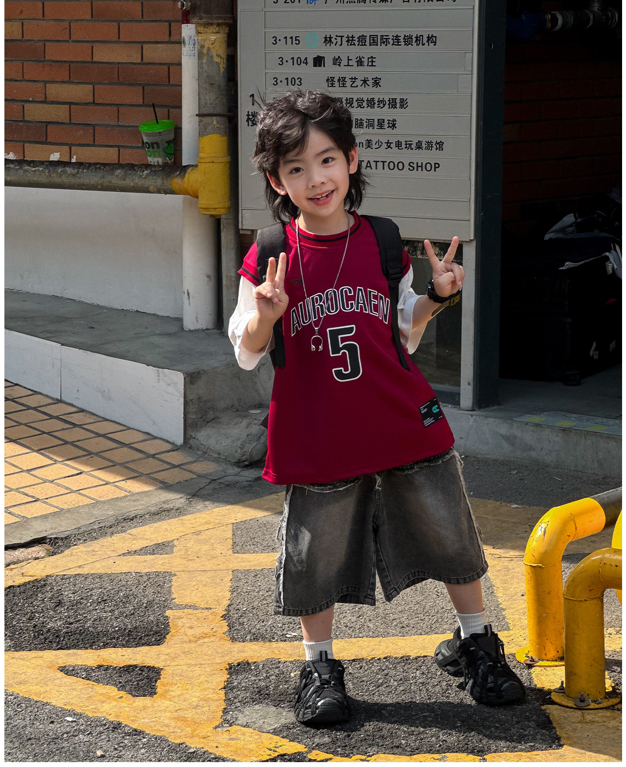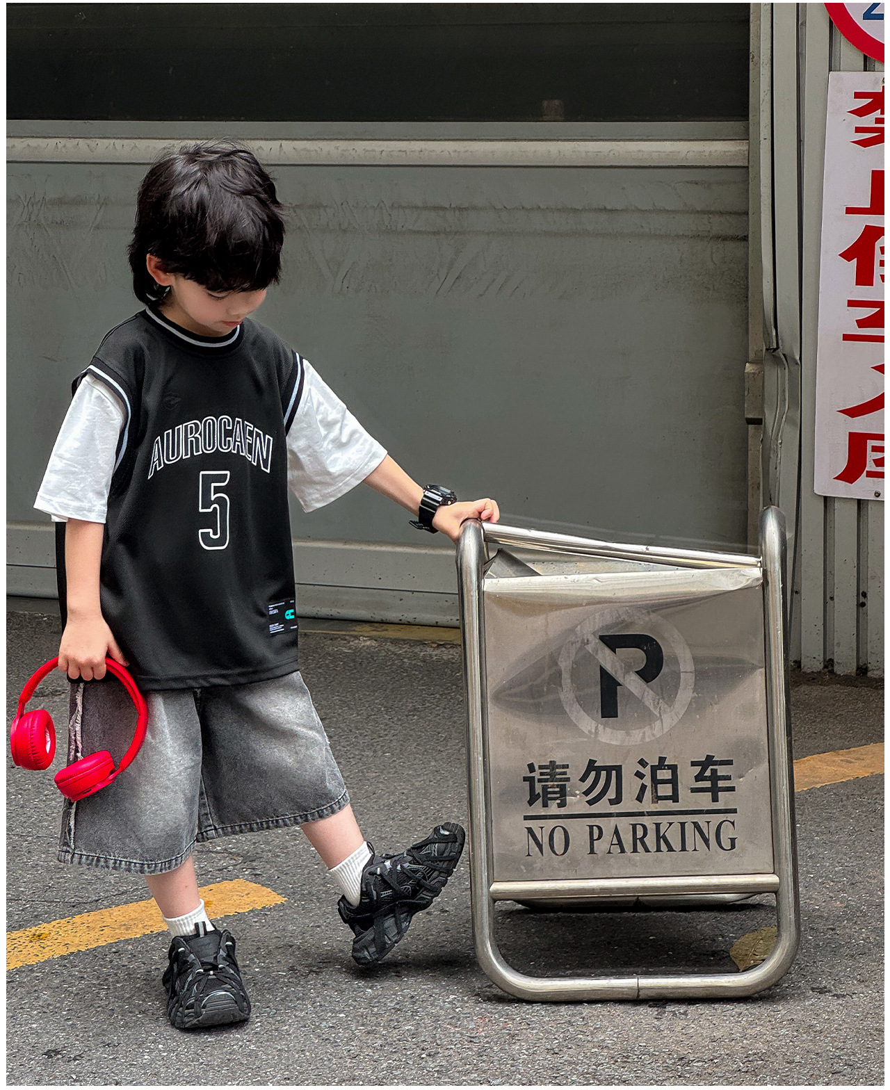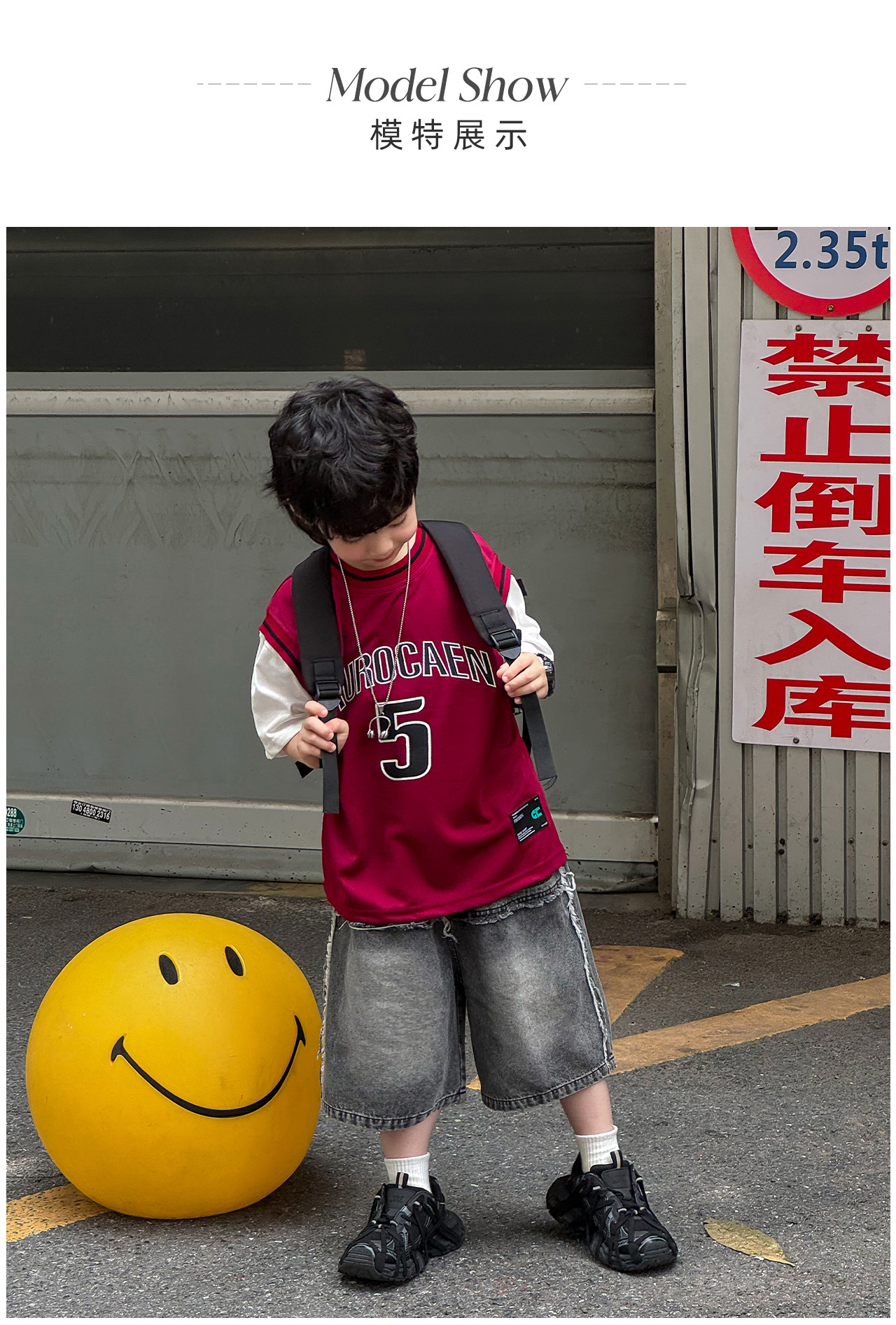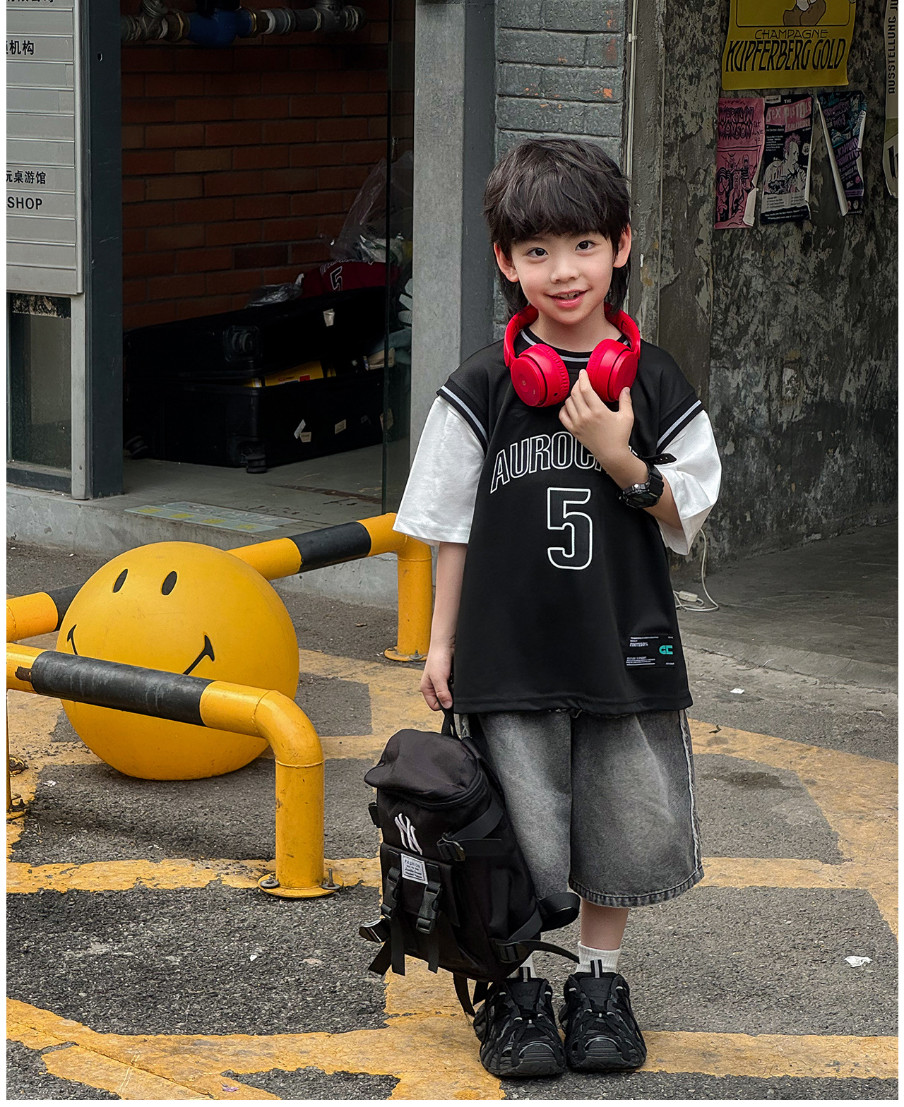 [여름 정리 세일] 2025 아동복 미국 문자 가짜 투피스 소년 농구 유니폼 아동용 반팔 티셔츠스토어 가기