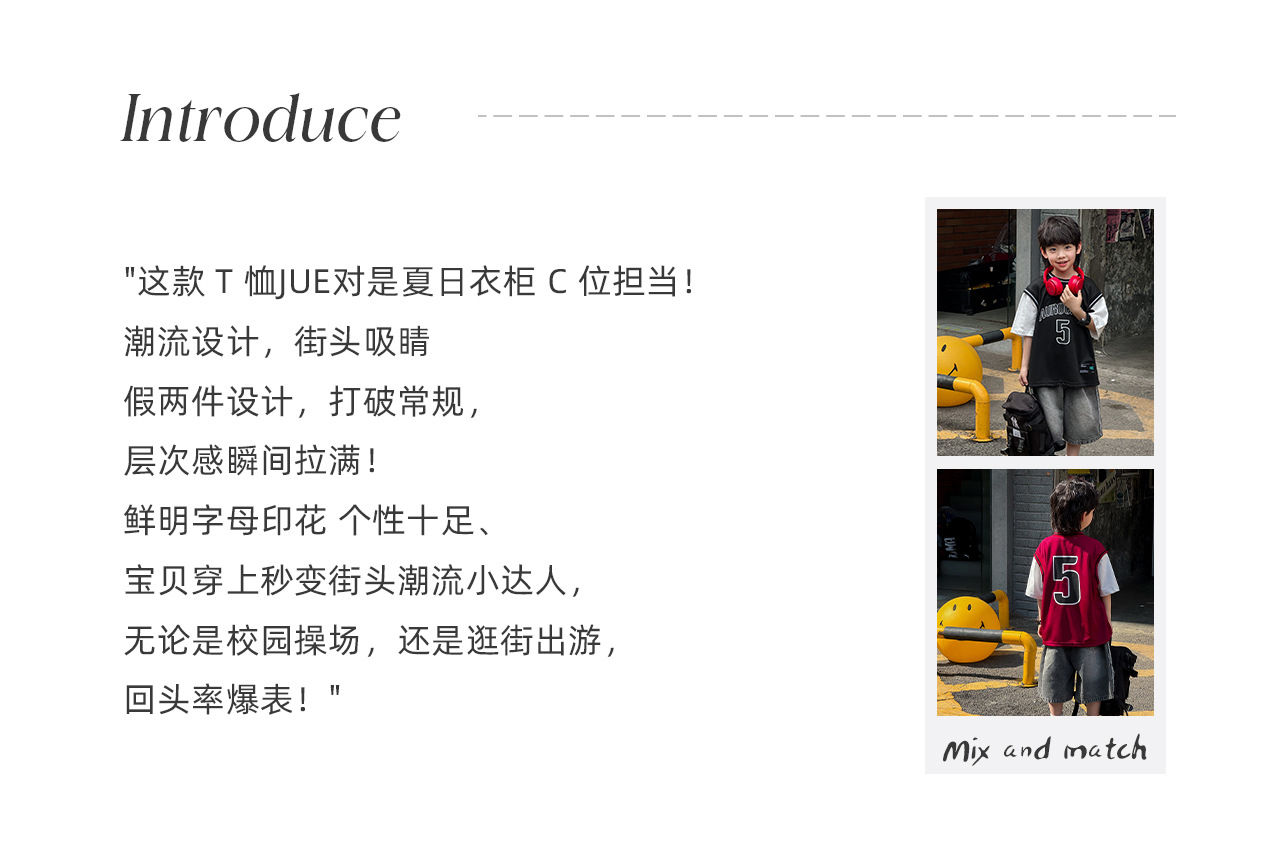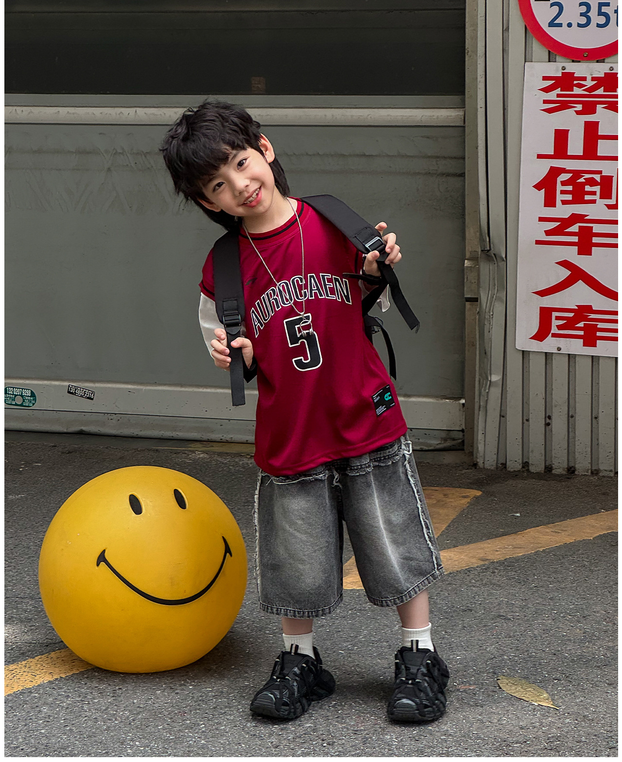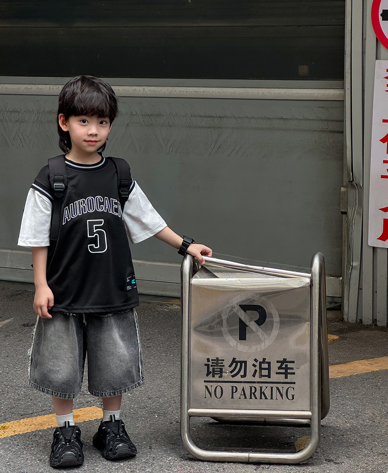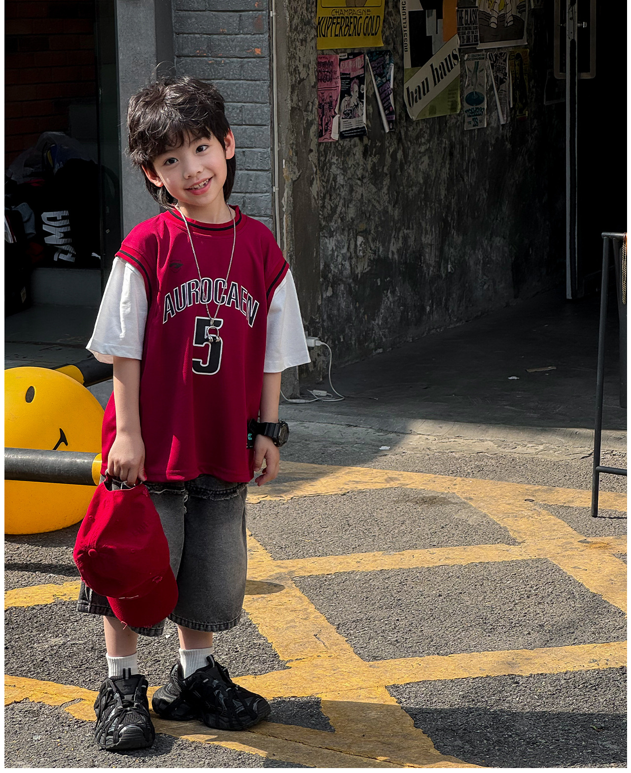 [여름 정리 세일] 2025 아동복 미국 문자 가짜 투피스 소년 농구 유니폼 아동용 반팔 티셔츠스토어 가기